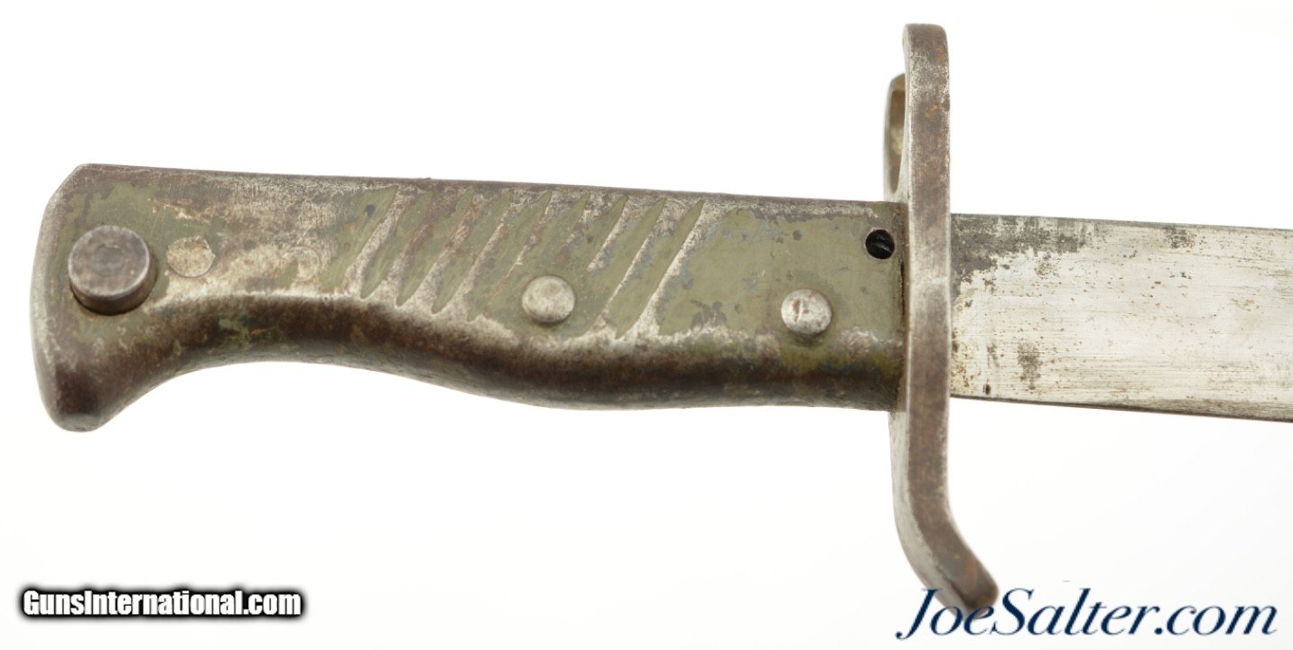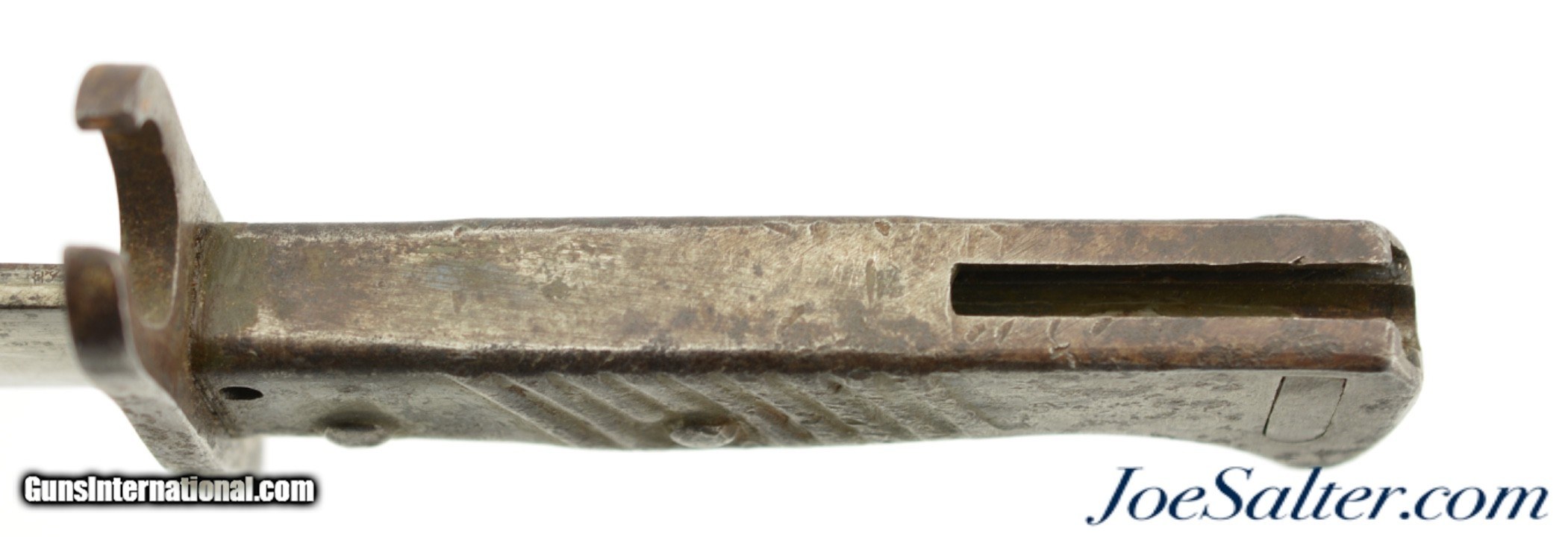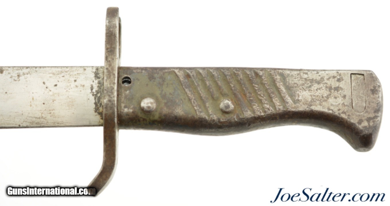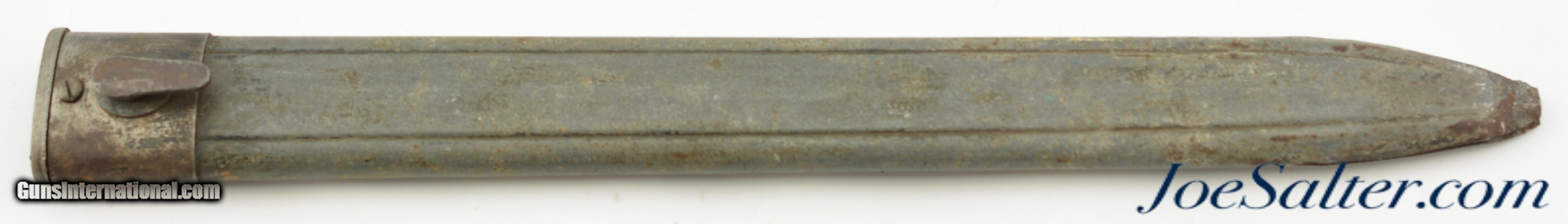 Description: This is a crudely finished blade about the same length of a standard 98/05 bayonet. This example is unsharpened with a 363mm blade, finished bright with light oxidation. These were unmarked, this one is proof marked on the spine. The guard is forward-swept with oxidation and no markings. The all steel handle with 9 grooves and cleaning hole are in very good+ condition with some of the original field gray paint. The scabbard is all steel with most of the field gray pain still intact. There is a split in the very end which extends 2 3/4". This is a nice example of this variation bayonet, will fit 71, 71/84, 88, 98 rifles. Price: $199.00 Contact Seller |
