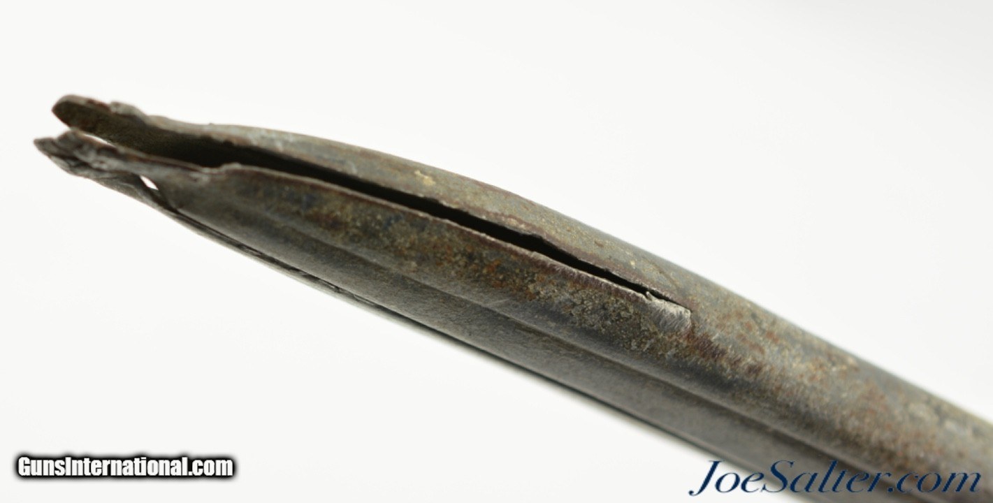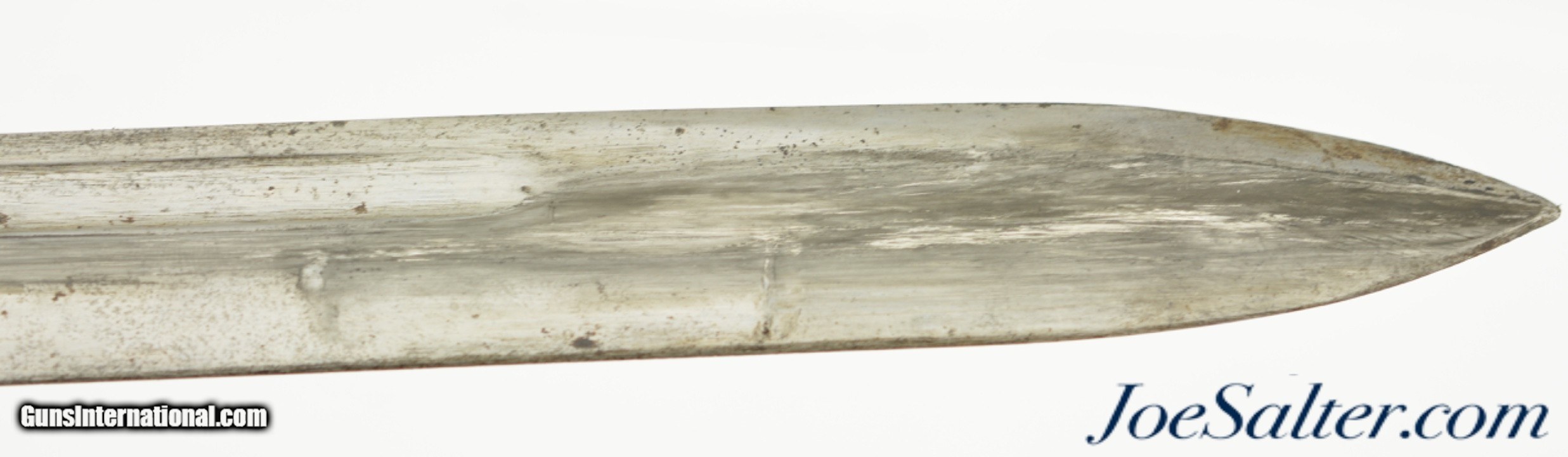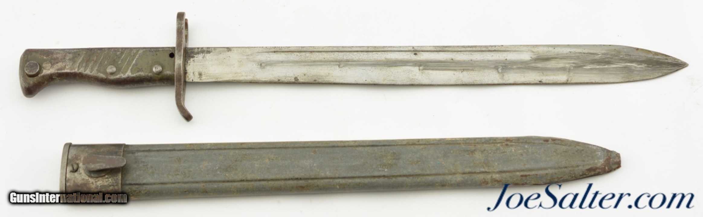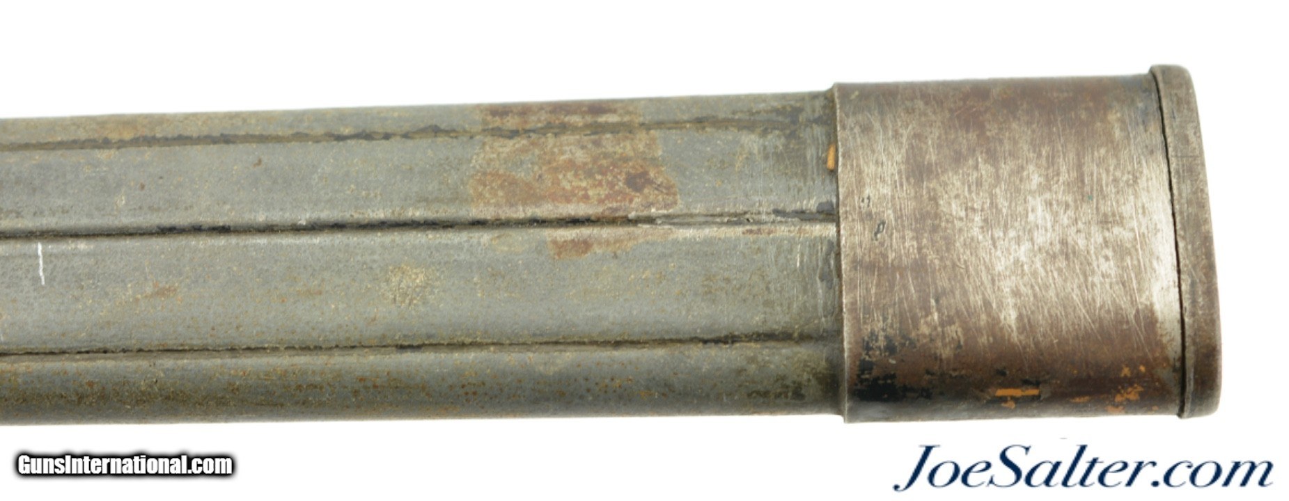 Description: This is a crudely finished blade about the same length of a standard 98/05 bayonet. This example is unsharpened with a 363mm blade, finished bright with light oxidation. These were unmarked, this one is proof marked on the spine. The guard is forward-swept with oxidation and no markings. The all steel handle with 9 grooves and cleaning hole are in very good+ condition with some of the original field gray paint. The scabbard is all steel with most of the field gray pain still intact. There is a split in the very end which extends 2 3/4". This is a nice example of this variation bayonet, will fit 71, 71/84, 88, 98 rifles. Price: $199.00 Contact Seller |