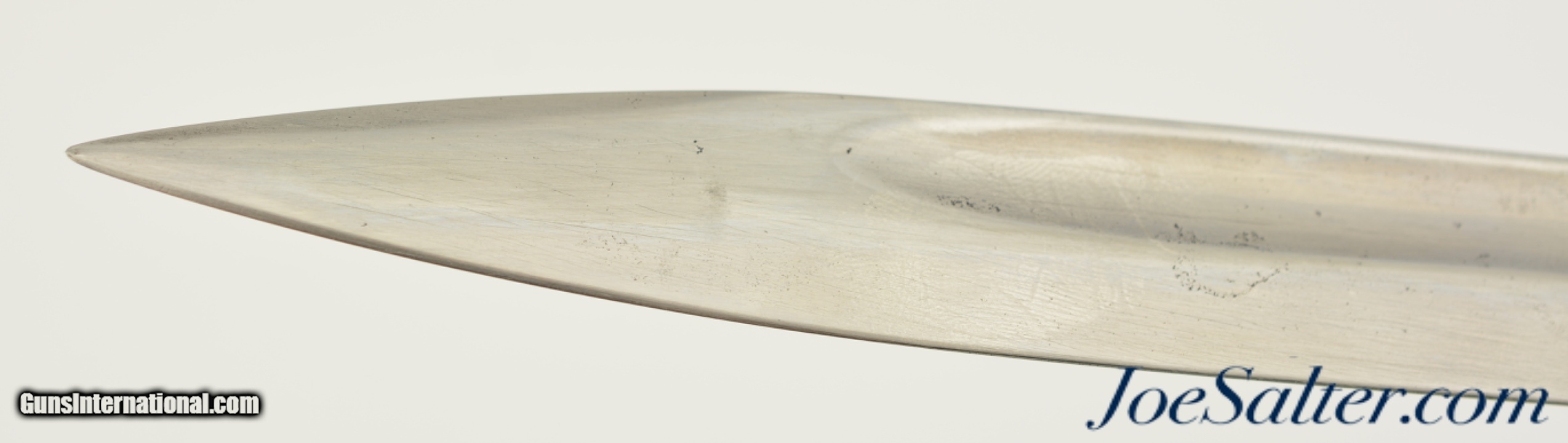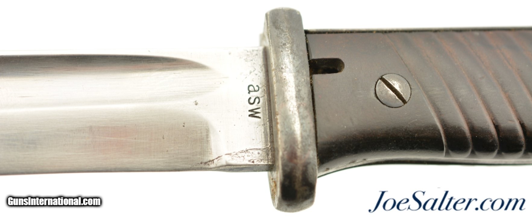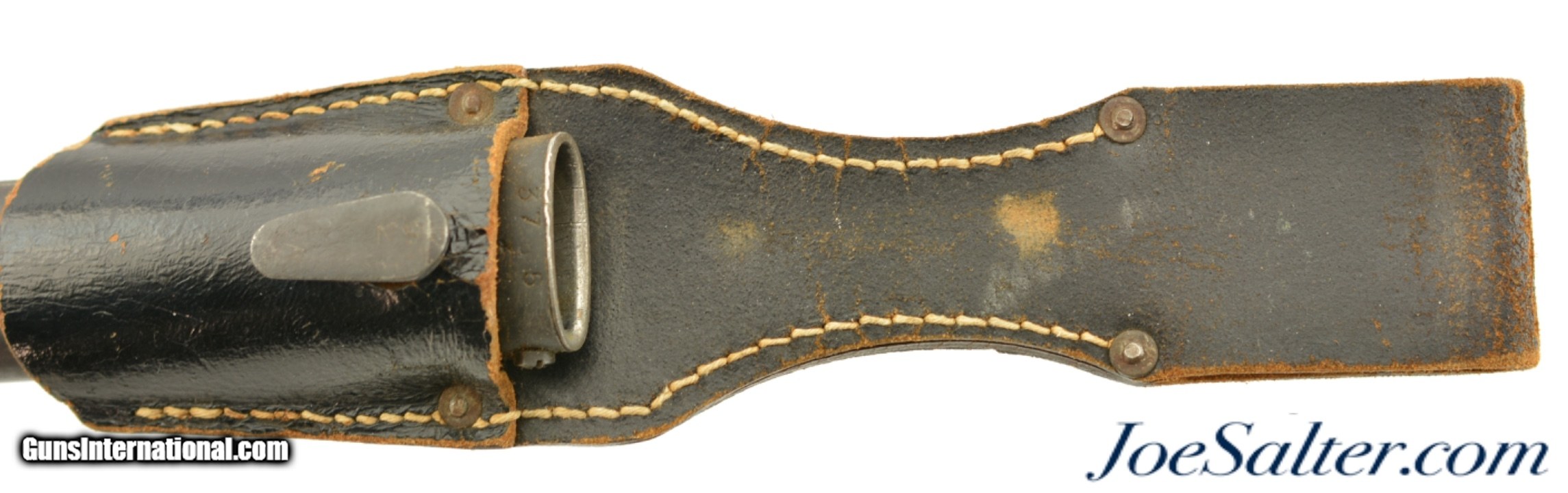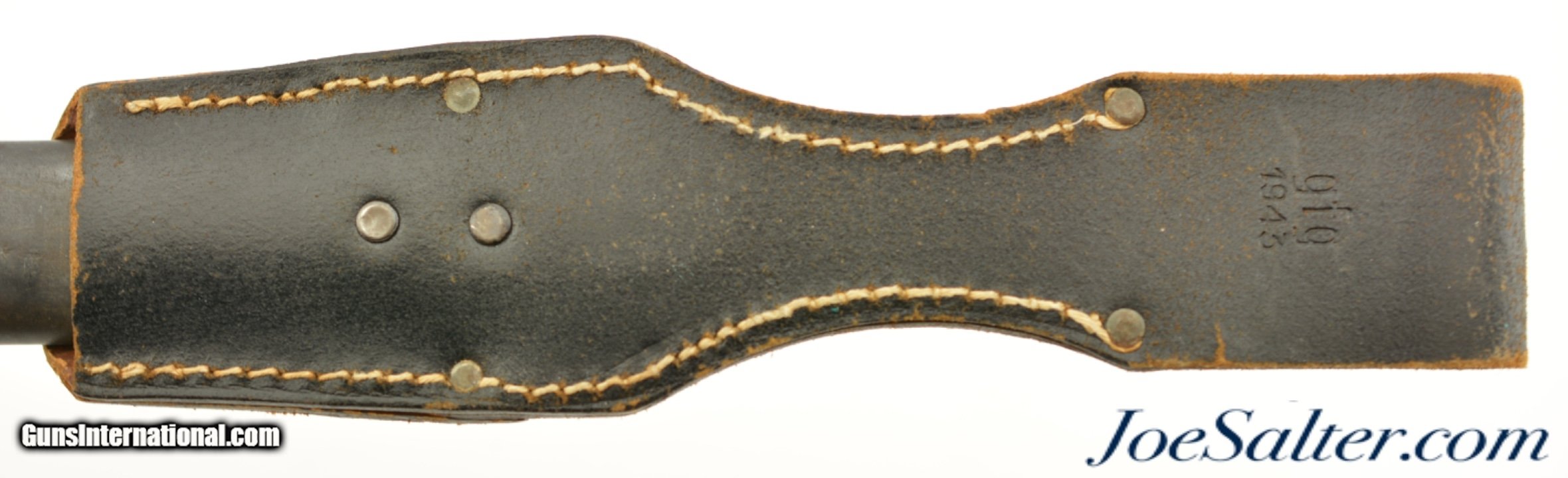 Description: This is a Gewehr M84/98 bayonet WWII pattern w/Bakelite grips. This fit the Mauser Gewehr 98 & Karabiner 98k which were two of the standard German infantry rifles. The ricasso is marked asw on one side and 4315 over y on other side plus 40 on blade spine. The non sharpened 9 7/8" (251mm) blade is in excellent condition with bright finish no wear or chips and an unaltered tip. The Bakelite handle has no cracks or apparent wear and is a deep brown color with a flashguard, the pommel has the double Waffenamt WaA883. The scabbard is coded 3765 and SN on the frog stud with the name Snarke on body. It is in very good condition with 85% of its bluing with a dusting of surface oxidation. Shows little wear with small scratches and dents. Frog is gloss black front finish with tight stitching and gfg 1943 stamped on the back. Both the bayonet and the scabbard are marked with the Waffenamt stampings. Please see pictures for details. SOLD |