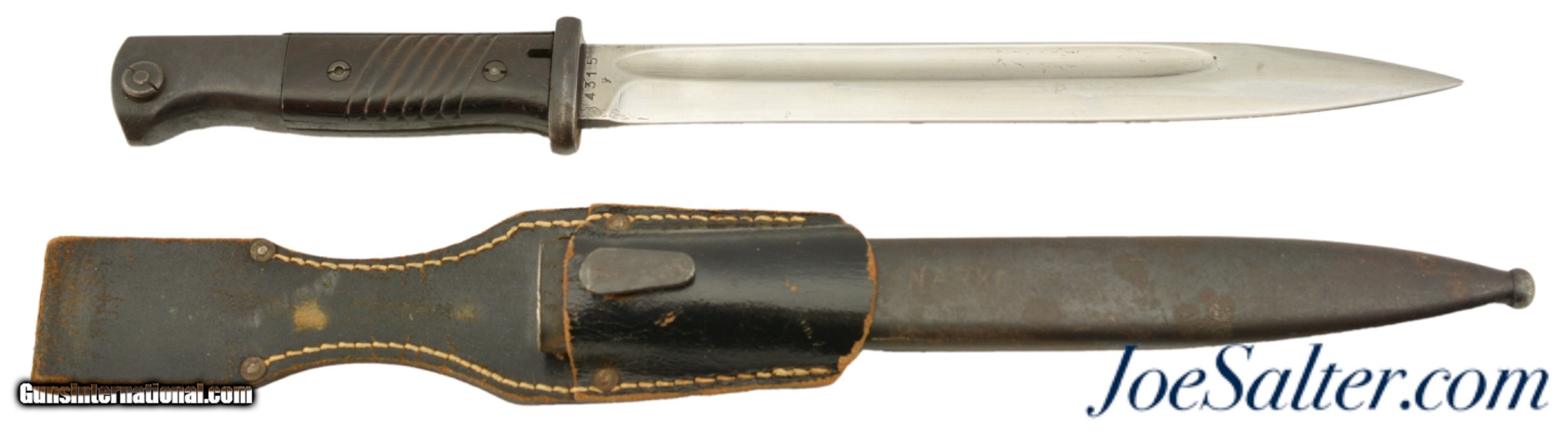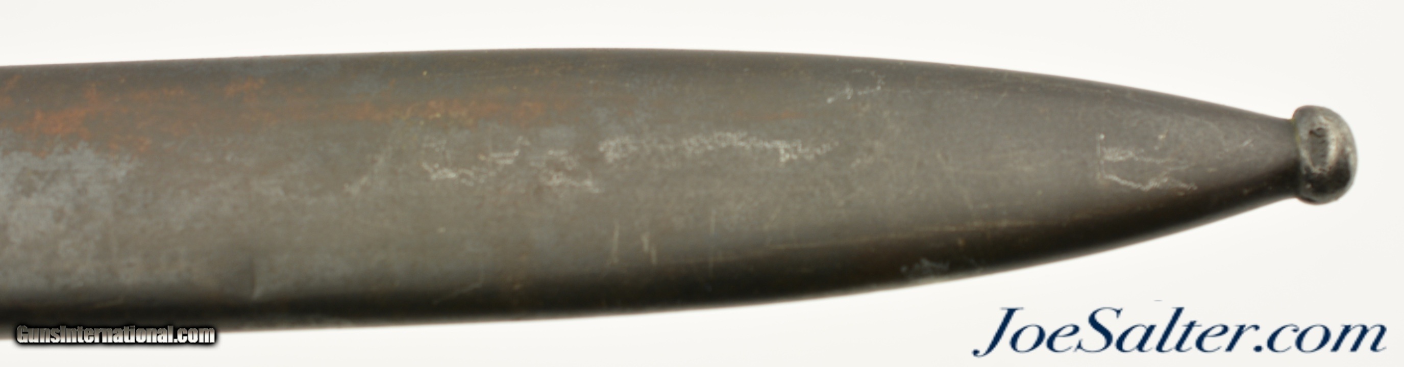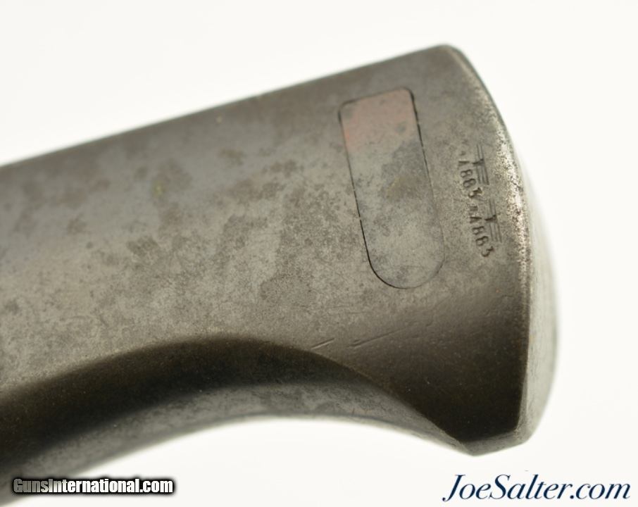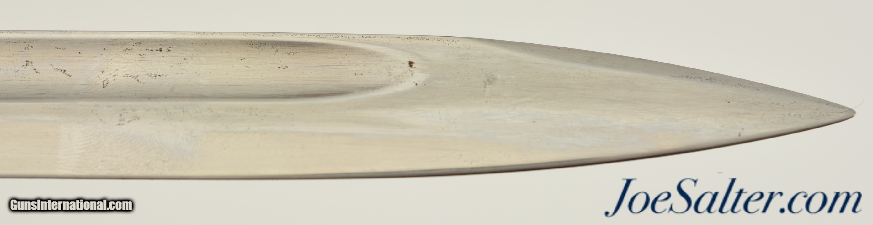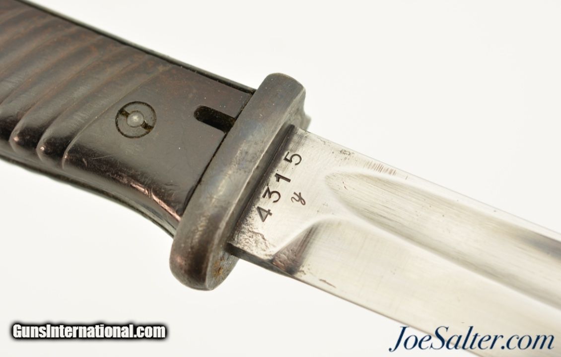 Description: This is a Gewehr M84/98 bayonet WWII pattern w/Bakelite grips. This fit the Mauser Gewehr 98 & Karabiner 98k which were two of the standard German infantry rifles. The ricasso is marked asw on one side and 4315 over y on other side plus 40 on blade spine. The non sharpened 9 7/8" (251mm) blade is in excellent condition with bright finish no wear or chips and an unaltered tip. The Bakelite handle has no cracks or apparent wear and is a deep brown color with a flashguard, the pommel has the double Waffenamt WaA883. The scabbard is coded 3765 and SN on the frog stud with the name Snarke on body. It is in very good condition with 85% of its bluing with a dusting of surface oxidation. Shows little wear with small scratches and dents. Frog is gloss black front finish with tight stitching and gfg 1943 stamped on the back. Both the bayonet and the scabbard are marked with the Waffenamt stampings. Please see pictures for details. SOLD |