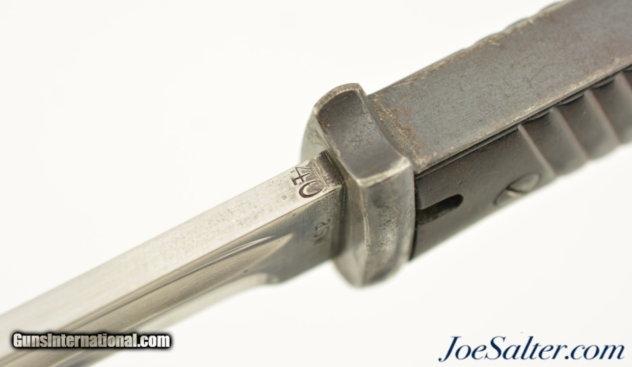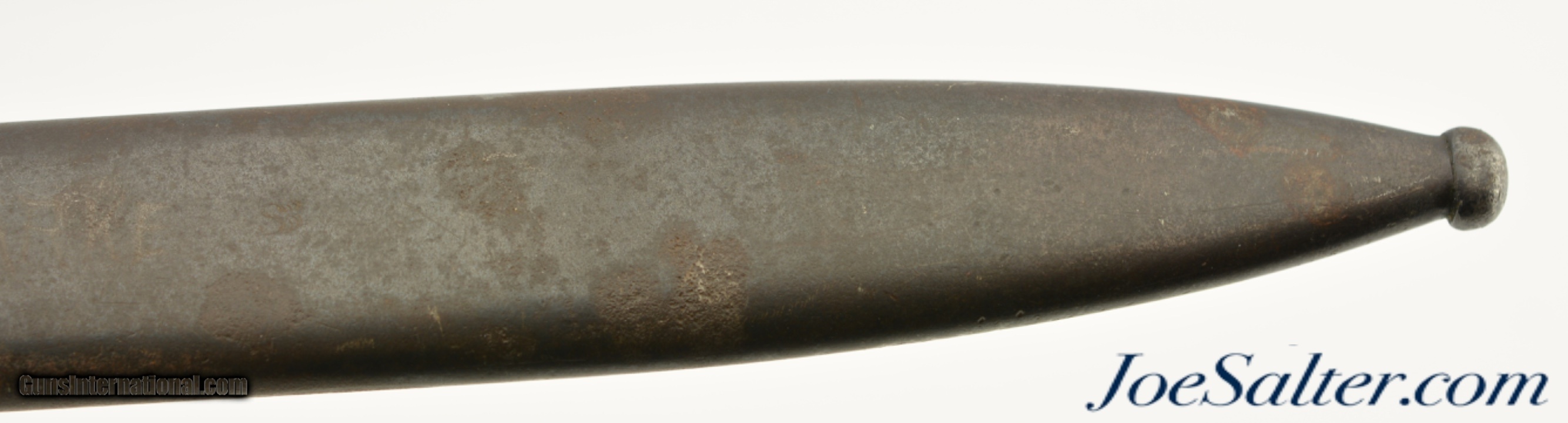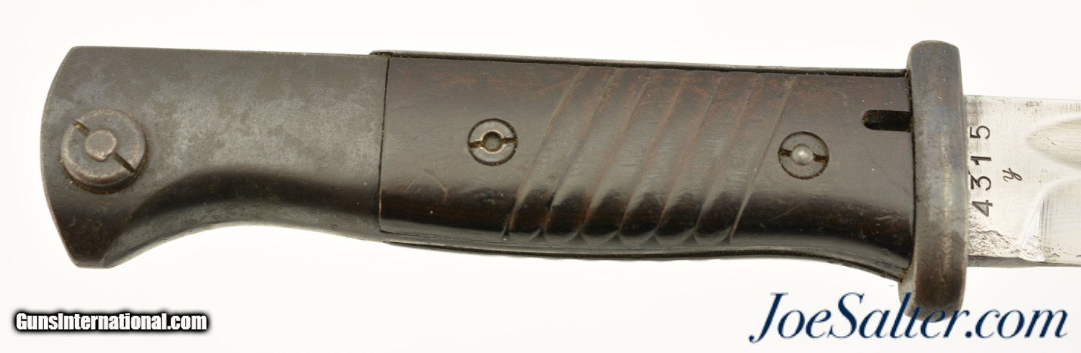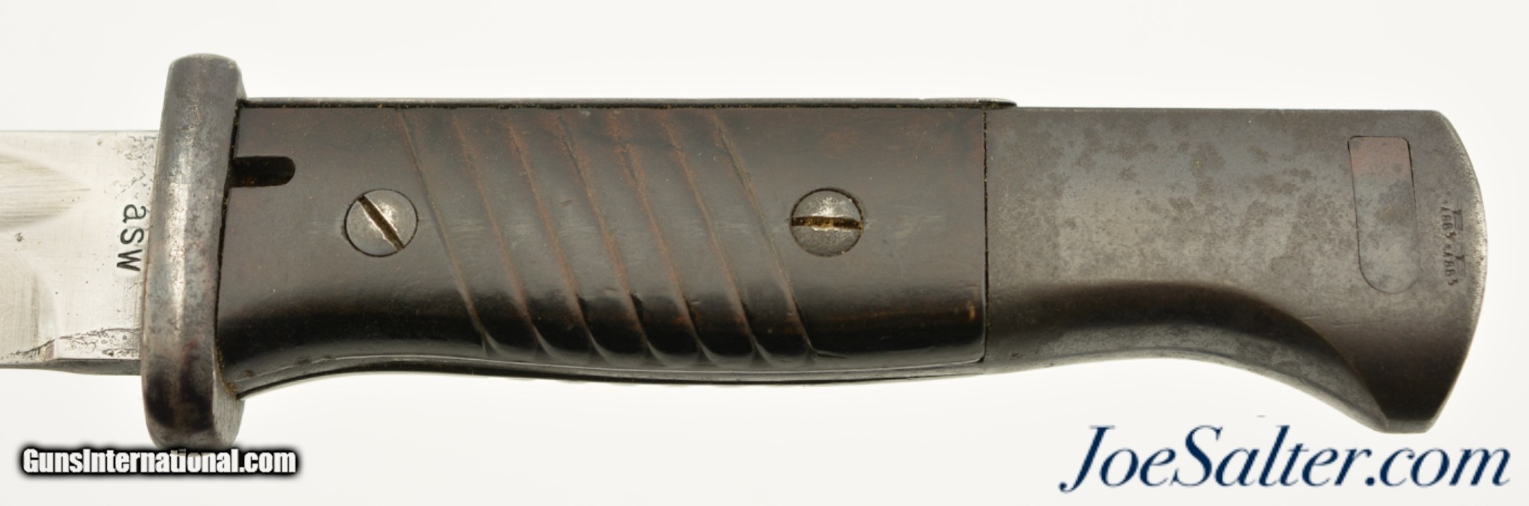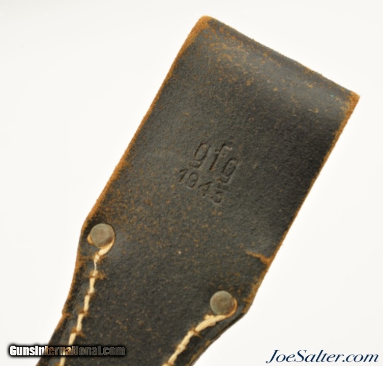 Description: This is a Gewehr M84/98 bayonet WWII pattern w/Bakelite grips. This fit the Mauser Gewehr 98 & Karabiner 98k which were two of the standard German infantry rifles. The ricasso is marked asw on one side and 4315 over y on other side plus 40 on blade spine. The non sharpened 9 7/8" (251mm) blade is in excellent condition with bright finish no wear or chips and an unaltered tip. The Bakelite handle has no cracks or apparent wear and is a deep brown color with a flashguard, the pommel has the double Waffenamt WaA883. The scabbard is coded 3765 and SN on the frog stud with the name Snarke on body. It is in very good condition with 85% of its bluing with a dusting of surface oxidation. Shows little wear with small scratches and dents. Frog is gloss black front finish with tight stitching and gfg 1943 stamped on the back. Both the bayonet and the scabbard are marked with the Waffenamt stampings. Please see pictures for details. SOLD |