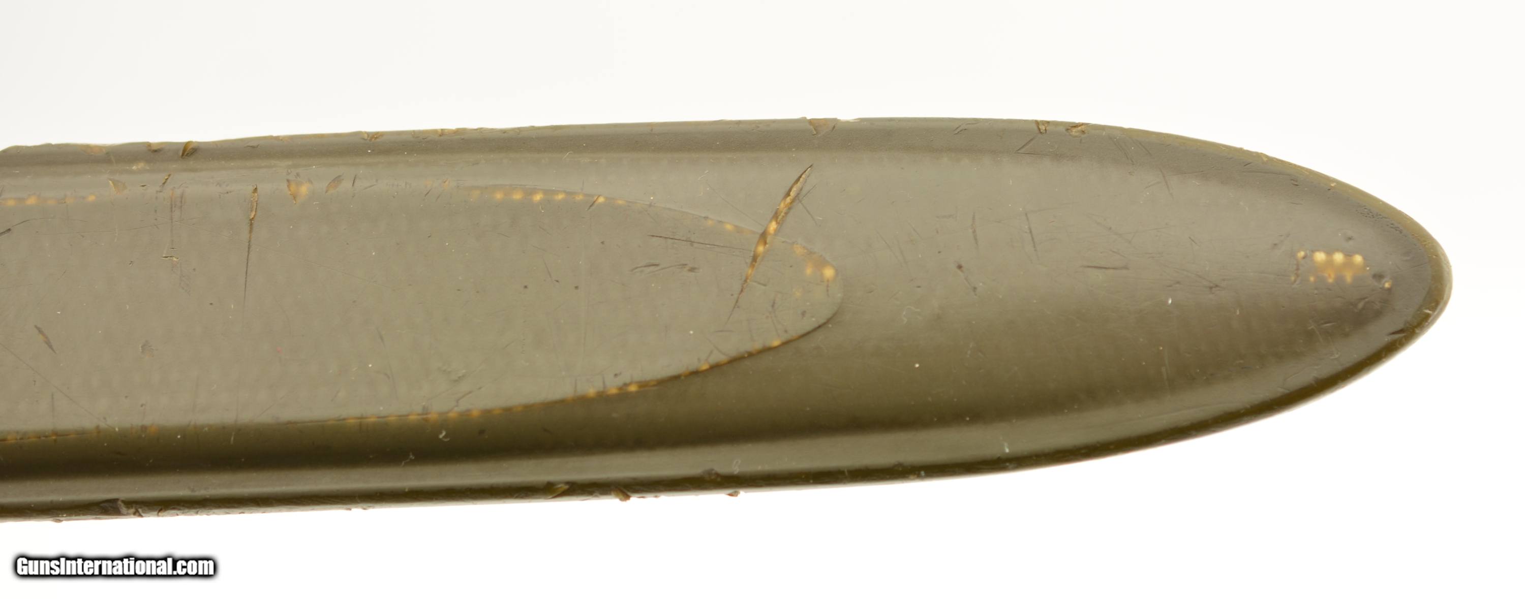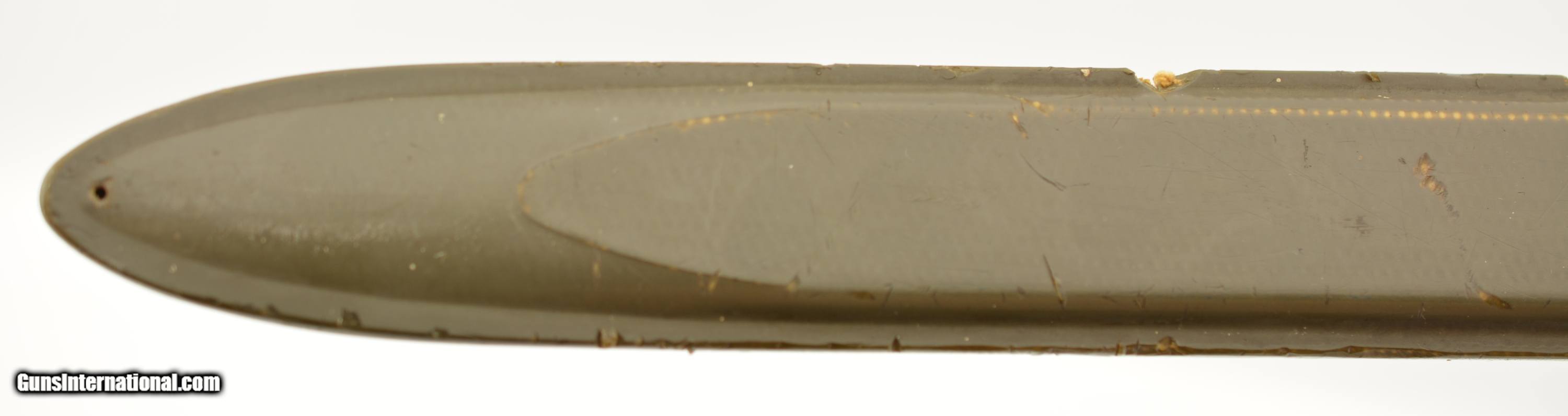 Description: This is a WWII US M1905 Garand Bayonet, manufactured in 1942 by the Union Fork and Hoe Company. It is 20 ½" overall, 16" unsharpened blade. The blade retains 90%+ of bluing which is lightly oxidized and nick free. All the US proof marks are correct on one side of the ricasso with the flaming bomb, US, UFH and 1942. The guard retains almost all of it's finish with signs of light oxidation and a bump or two. The black plastic handles are tight and is fine condition with a small gouge on one scale, the functioning tab next too the guard works perfectly releasing the bayonet from the scabbard and rifle. This bayonet is accompanied by the correct US in a flaming bomb, stamped olive drab scabbard. This scabbard is in very good condition with some chips and dings on the edges and the metal surface have some oxidation and bright spots. Overall the combination is in fine condition. SOLD |