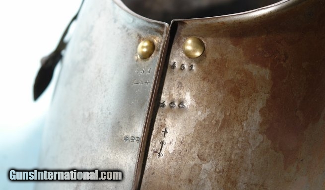 Description: NAPOLEON III CUIRASSIER ARMOR DATED 1860. Very fine set with the original leather and brass straps. Arsenal inscription and date on inside base of breastplate. Matching arsenal numbers on both plates. Fine plus. SOLD |