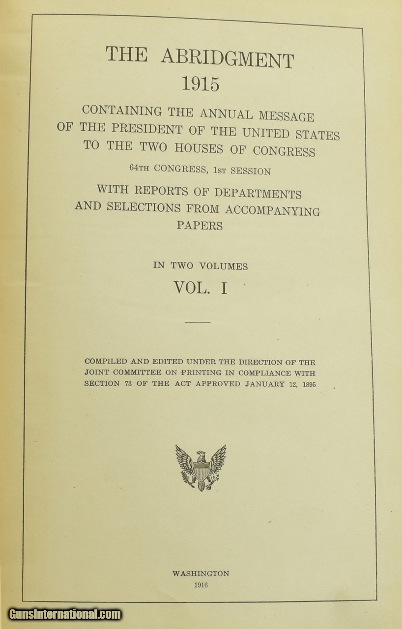 Description: "Book: “Abridgment Message and Documents 1915, Vol. 1 and Vol. 2". Message from the President of the United States to the Two Houses of Congress. SOLD |
