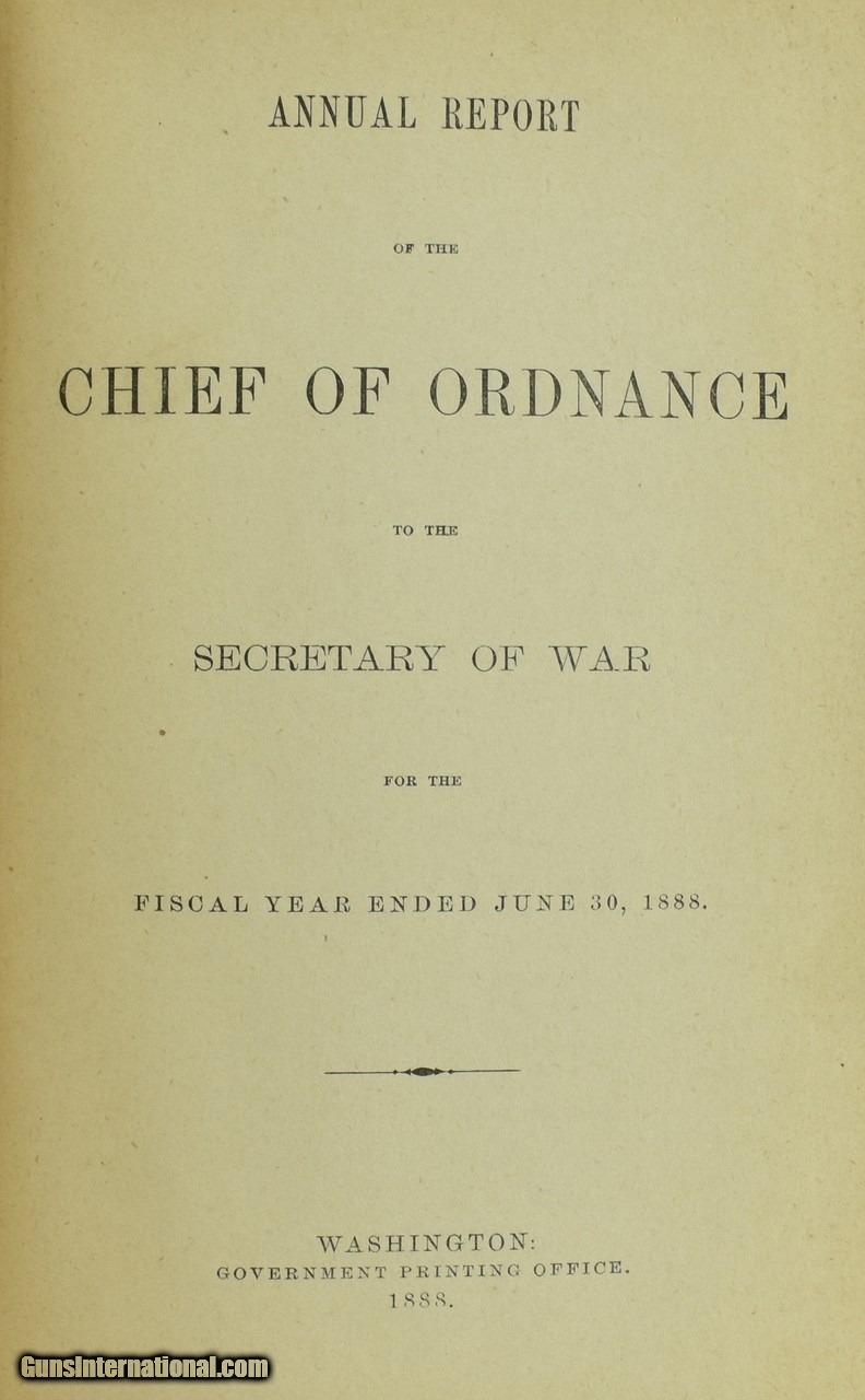 Description: "Book: “Report of the Chief of Ordnance 1888". Has report on Maxim machine gun report. SOLD |