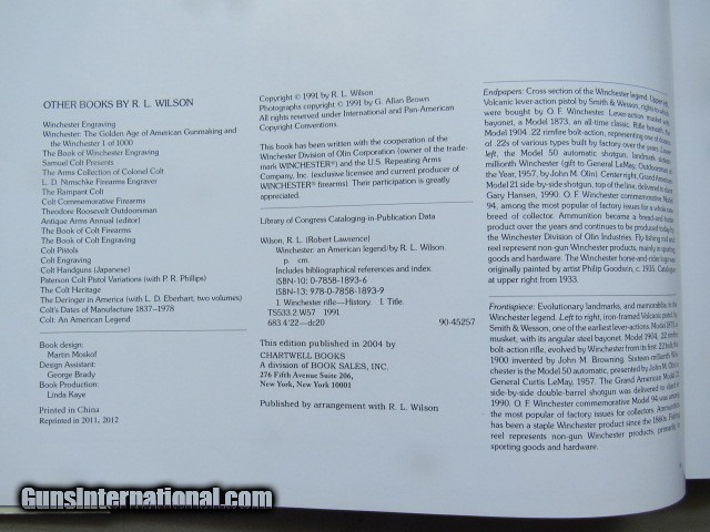 Description: Book is in excellent condition, dust jacket shows some wear on edges, hardcover, copyright 1991, 404 pages, text with black-and-white and color photos, lots of history on the Winchester company, the firearms and their users. TERMS: No international sales. Free shipping by USPS Media Mail with tracking. Payment by bank check, money order or personal check. All major credit cards accepted with 4% convenience fee added. Always interested in Civil War, Old West and other firearms so please contact me if you have something for trade or sale. Thanks for looking and please check my other listings. 315.251.4799 with questions or concerns. SOLD |