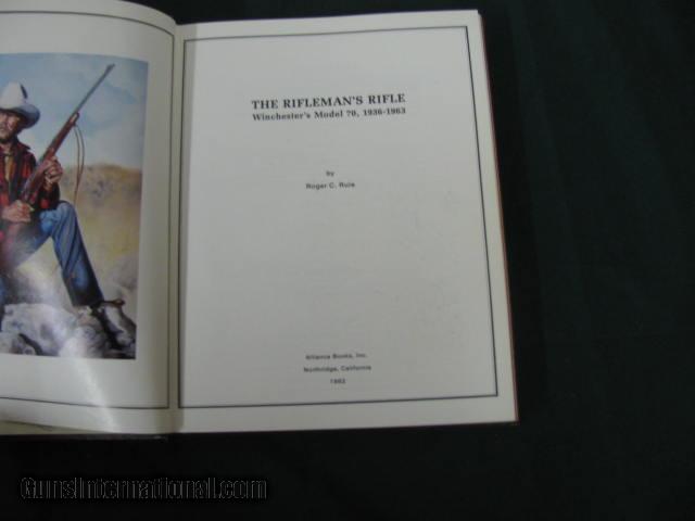 Description: 5107 The Riflemans Rifle by Robert Rule original hardback 1982 excellant condition--Description: Alliance Books, Inc., 1982. Hardcover. Book Condition: Near Fine. 1st Edition. 368 pages. Pictorial hardcover published without a dust jacket. Still the "Bible" on the Winchester Model 70 Rifle after over thirty years since it was first published. The Rifleman's Rifle is an in-depth study of its production and use from 1936-1963. It is very detailed and comprehensive. There are hundreds of detailed illustrations that clearly show the markings on the rifles. Serial number information is included. The Chapter titles are: The Predecessor; Production; Styles; Chamberings; Model Changes; Style Changes; Catalogs; Special Orders; Research and Development: and, The Successor.The inside is clean and the binding is tight. Overall a Near Fine copy of a scarce publication at a reasonable price SOLD |