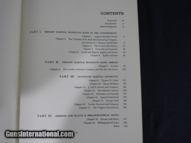 Description: Hardcover with no dust jacket. Copyright 1963 and 1967. 249 pages. Covers all the major makers from the South - Augusta Machine Works, Columbus, Fayetteville Armory, Griswold and Gunnison, Leech & Rigdon/Rigdon & Ansley, Spiller & Burr, as well as the secondary makers (Palmetto, Dance Brothers, etc.). Also covers the European-made imports such as LeMat & Kerr. Nicely illustrated with plenty of pictures. No damage to the pages or binding but there are some pencil notes erased on the opening blank page. Several available on Amazon starting at $100 so I'm well below that price. A must have for the Civil War firearms enthusiast. TERMS: Shipping to the Continental US States will be free by USPS Media Mail. No international sales, and no sales to Alaska or Hawaii. 3 day inspection period; buyer pays return shipping. Payment by bank check, money order or personal check; all major credit cards are accepted with a 4% convenience fee added. Always interested in Civil War items, as well as used long guns and used antique handguns so please contact me if you have anything for sale or trade. 315.251.4799 with questions or concerns. Please keep in mind that I work a full-time job during the week and may not be able to immediately respond to your text, phone, or email message. Thanks for looking! Please check back for more reference book listings as I am "thinning the herd" so to speak. SOLD |