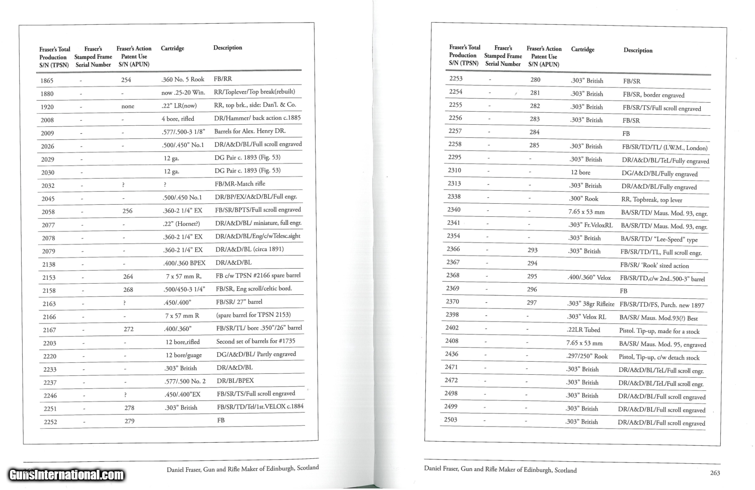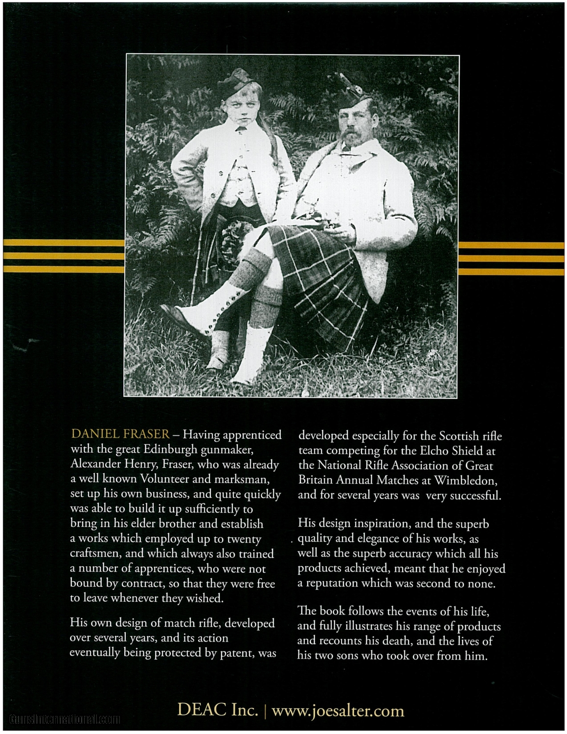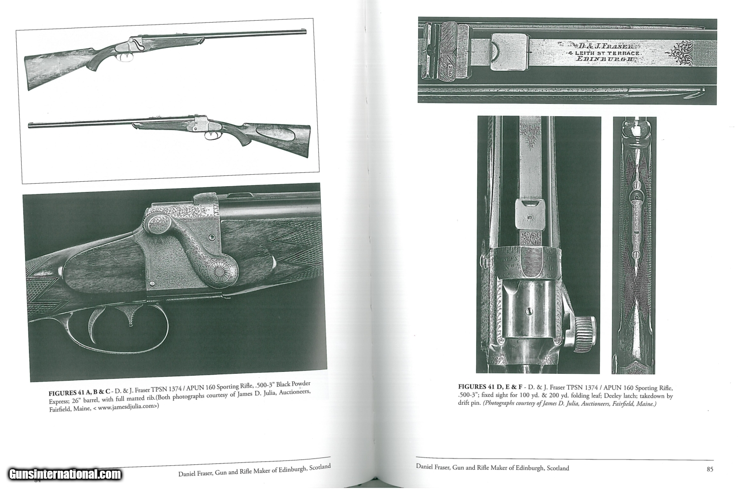 Description: Written by Jonathan G. Kirton and Printed in Sept. 2014. Hardcover, 274 Pgs. This book covers the personal history of Daniel Fraser and of the famous gunmaking firm which he founded, and following Daniel's death the subsequent activities of his two sons. It includes a never before published, assembled partial record of his total production by serial number of his best quality firearms (TPSN), initially assembled by a Fraser family confidant and foremost collector, along with a record of those of his firearms which carried special serial number series, and Action Patent Use Serial Numbers. The book includes full details of all the patents acquired or initiated by both Daniel and his eldest son; also full details about Fraser's patented bullet and line of special proprietary cartridges; and also illustrations of many Fraser advertisements and a late Fraser sales flyer. It also includes black & white photographs of probably most types of firearms which were either built entirely in-house, or in a much modified form to a very high standard on bought-out actions, particularly for repeating rifles. The book also includes two sections of photographs in full color. ENTIRELY PRINTED AND BOUND IN THE U.S.A. Free Shipping to the Lower 48. SOLD Manufacturer: Fraser Model: Rifle |