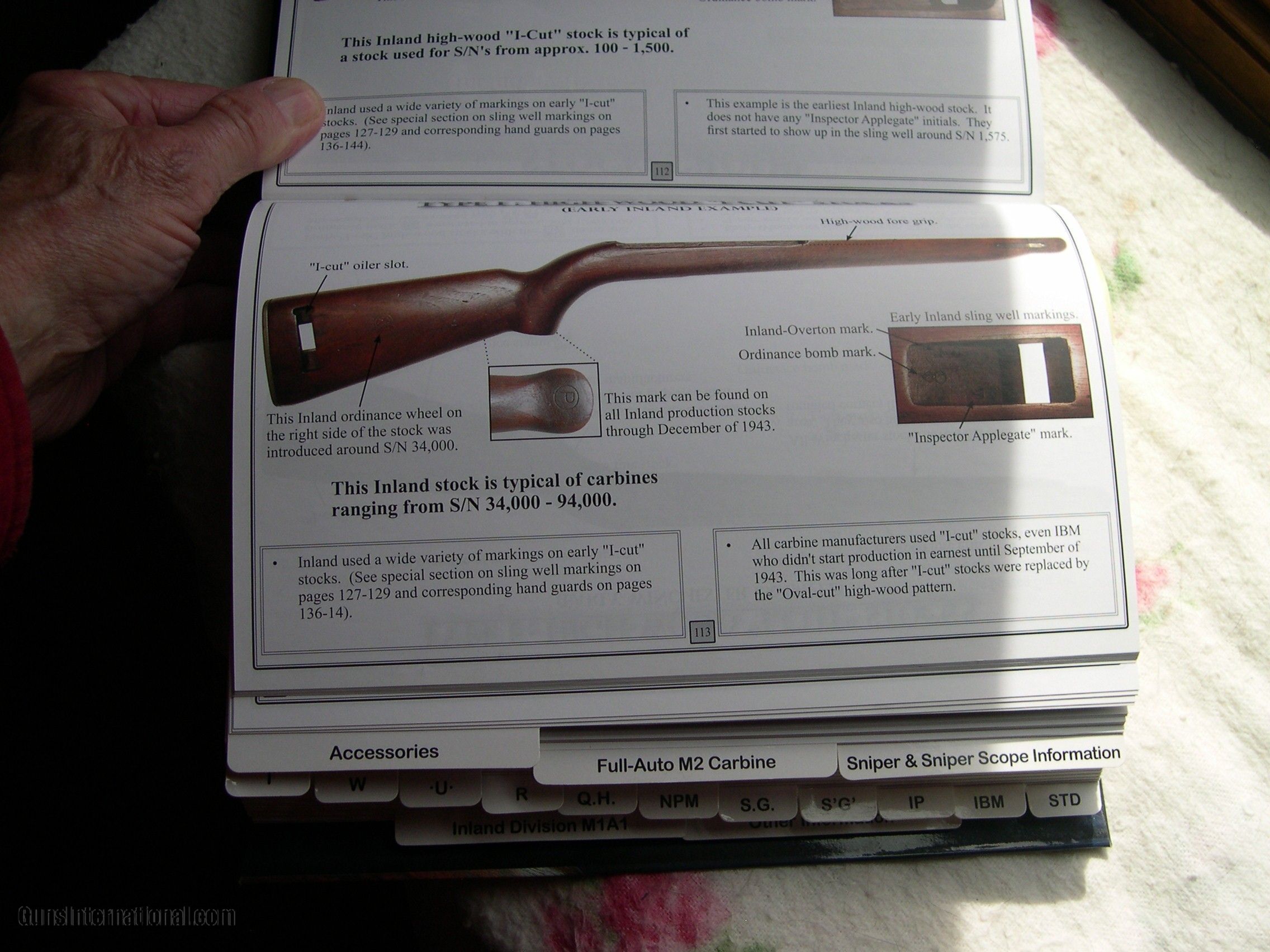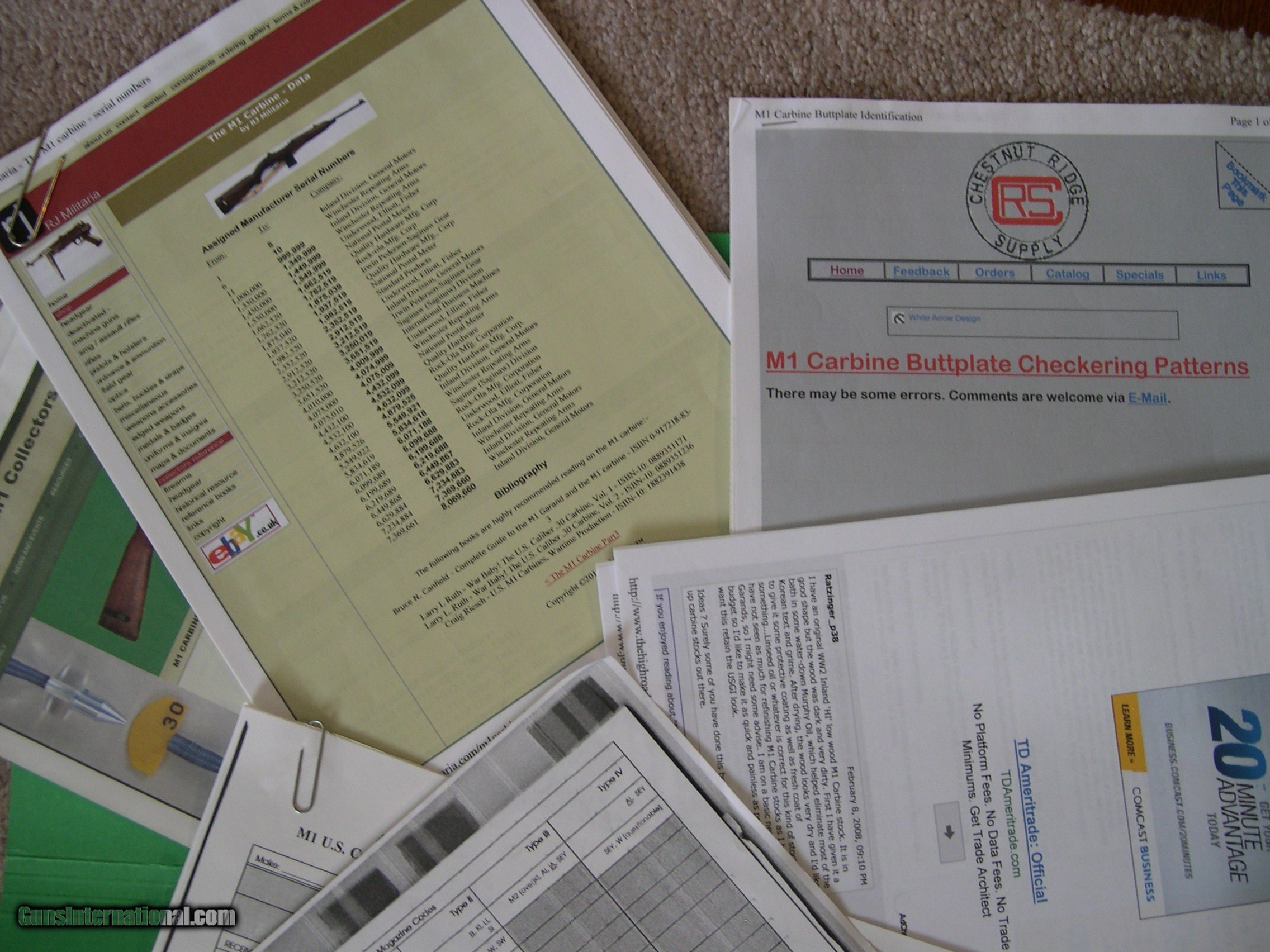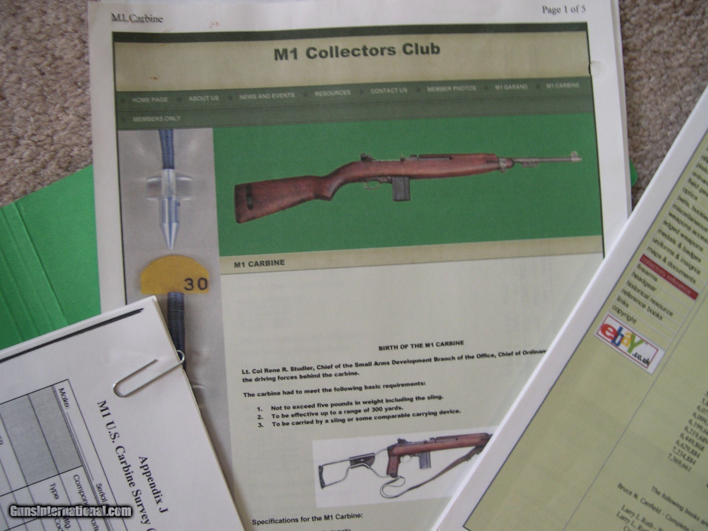 Description: This listing is for my M1 Carbine reference books and literature. I had a nice collection of carbines several years ago and have sold all but one and am unlikely to acquire any more due to my age. I have reference books, parts, and tools that I no longer need and am selling them as I have time. All the small parts are gone and, after these books, I only have a couple of larger parts and the tools to go. This listing is for my reference books, including my "M1 CARBINE- Comprehensive Guide" by R. C Larson, my "THE M1 CARBINE OWNER'S GUIDE" by Larry Ruth and Scott Duff, my "U. S. M1 CARBINES- Wartime Production" by Craig Reisch, my Dept. of the Army TM 9-1276, plus several pages of other information printed from several sources. The Larson book was my "go-to" guide durng my collecting years, The book is in excellent condition with no writing, dog-earing, or damage. There is a slight crease in the spine from opening frequently. I left my Post-It notes on the pages as they are useful in finding various pages, but they can be discarded if not wanted. The Ruth/Duff book is in like-new condition, as is the Army TM. The Reisch book is in excellent condition but has been referred to frequently and has a few sticky tabs attached that can be removed with no damage if desired. SOLD Rifle Caliber: .30 Carbine |