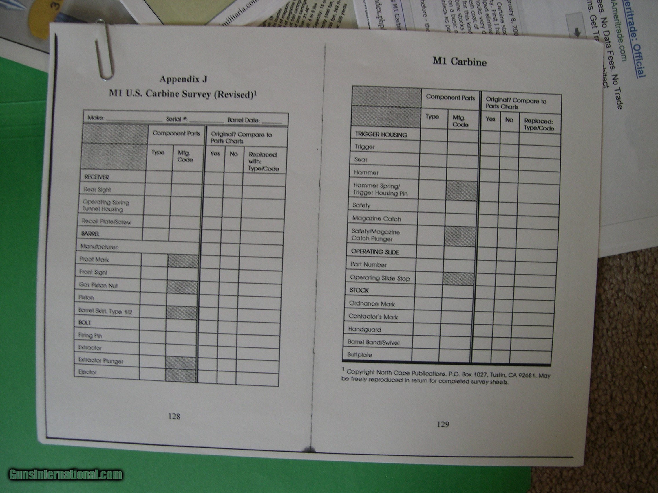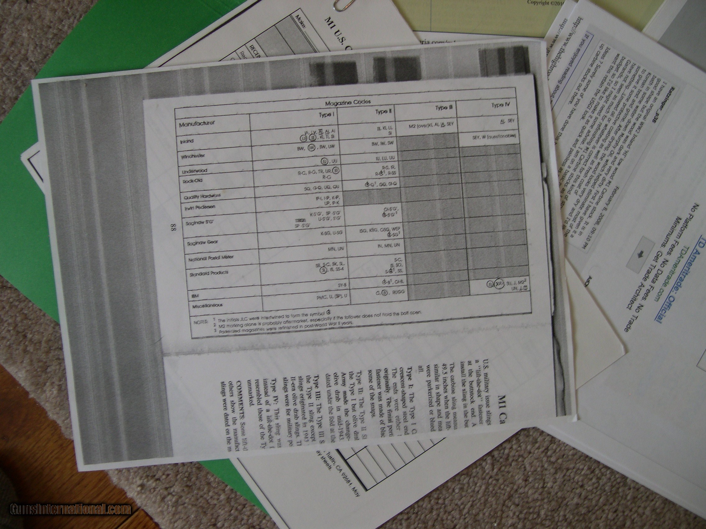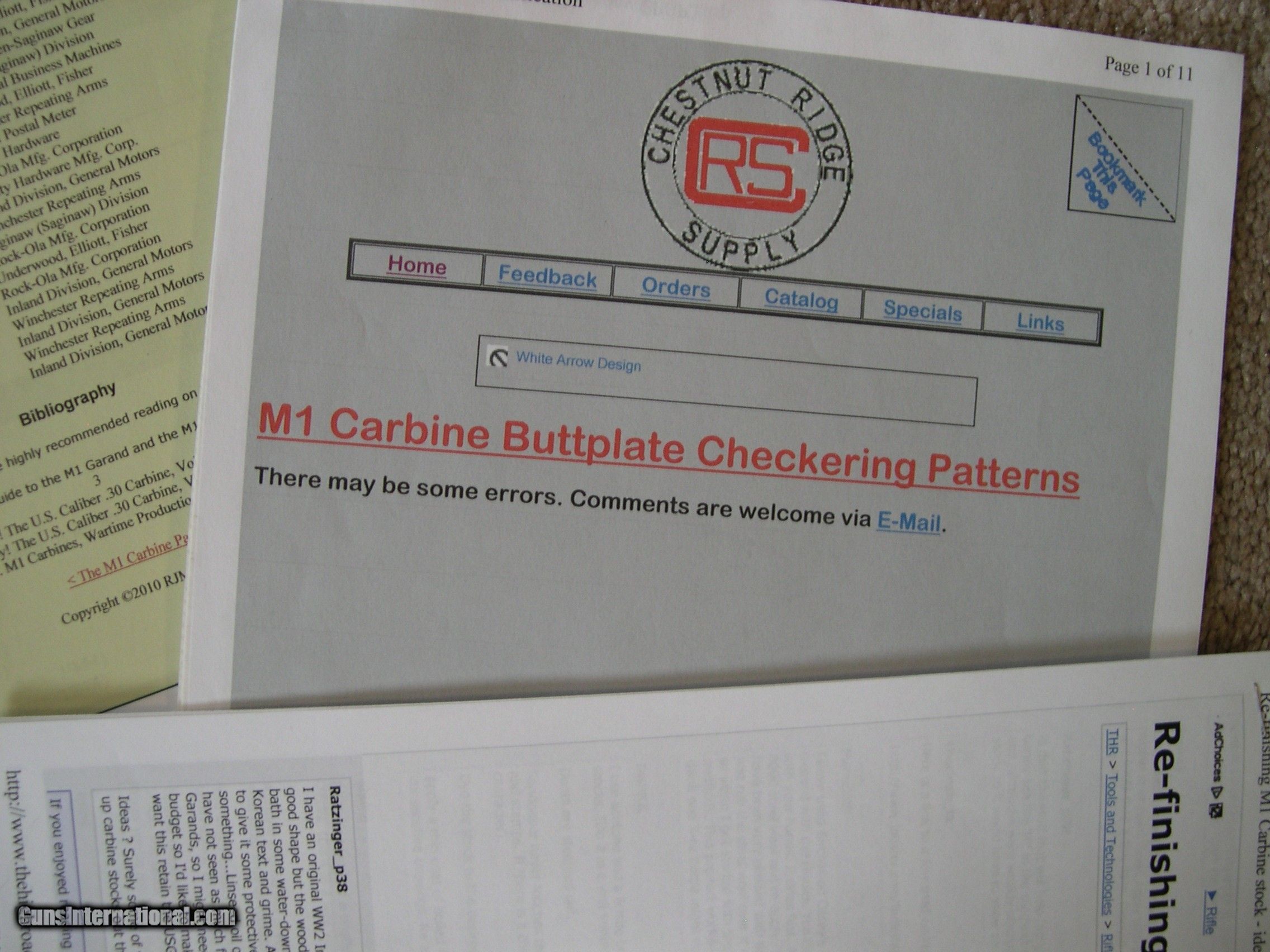 Description: This listing is for my M1 Carbine reference books and literature. I had a nice collection of carbines several years ago and have sold all but one and am unlikely to acquire any more due to my age. I have reference books, parts, and tools that I no longer need and am selling them as I have time. All the small parts are gone and, after these books, I only have a couple of larger parts and the tools to go. This listing is for my reference books, including my "M1 CARBINE- Comprehensive Guide" by R. C Larson, my "THE M1 CARBINE OWNER'S GUIDE" by Larry Ruth and Scott Duff, my "U. S. M1 CARBINES- Wartime Production" by Craig Reisch, my Dept. of the Army TM 9-1276, plus several pages of other information printed from several sources. The Larson book was my "go-to" guide durng my collecting years, The book is in excellent condition with no writing, dog-earing, or damage. There is a slight crease in the spine from opening frequently. I left my Post-It notes on the pages as they are useful in finding various pages, but they can be discarded if not wanted. The Ruth/Duff book is in like-new condition, as is the Army TM. The Reisch book is in excellent condition but has been referred to frequently and has a few sticky tabs attached that can be removed with no damage if desired. SOLD Rifle Caliber: .30 Carbine |