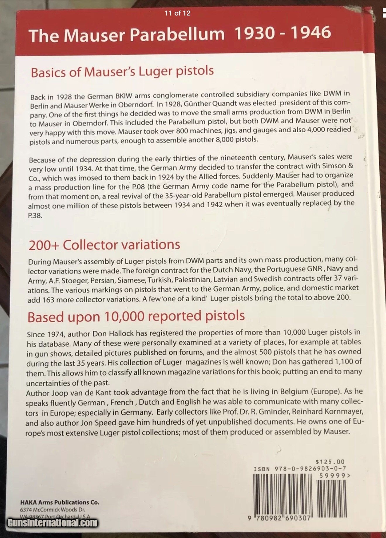 Description: The Mauser Parabellum 1930- 1946 deluxe edition Signed By Authors And Numbered. A must for Mauser Parabellum Collector, over 700 pages of specifications, variations, production data, serial number info. Markings, tons of photos and tables with data. This book features Mauser's history. The move from DWM in 1930. All foreign contracts. Start of production in 1934. German Army, Navy and Police Proof and Acceptance stamps. Changes in properties. Mauser's statistics. French production 1945/46. Tools, magazines and holsters. 900 pictures and documents. Many new facts and figures Shipped with USPS Priority Mail Medium Flat Rate Box $599.00 SOLD |