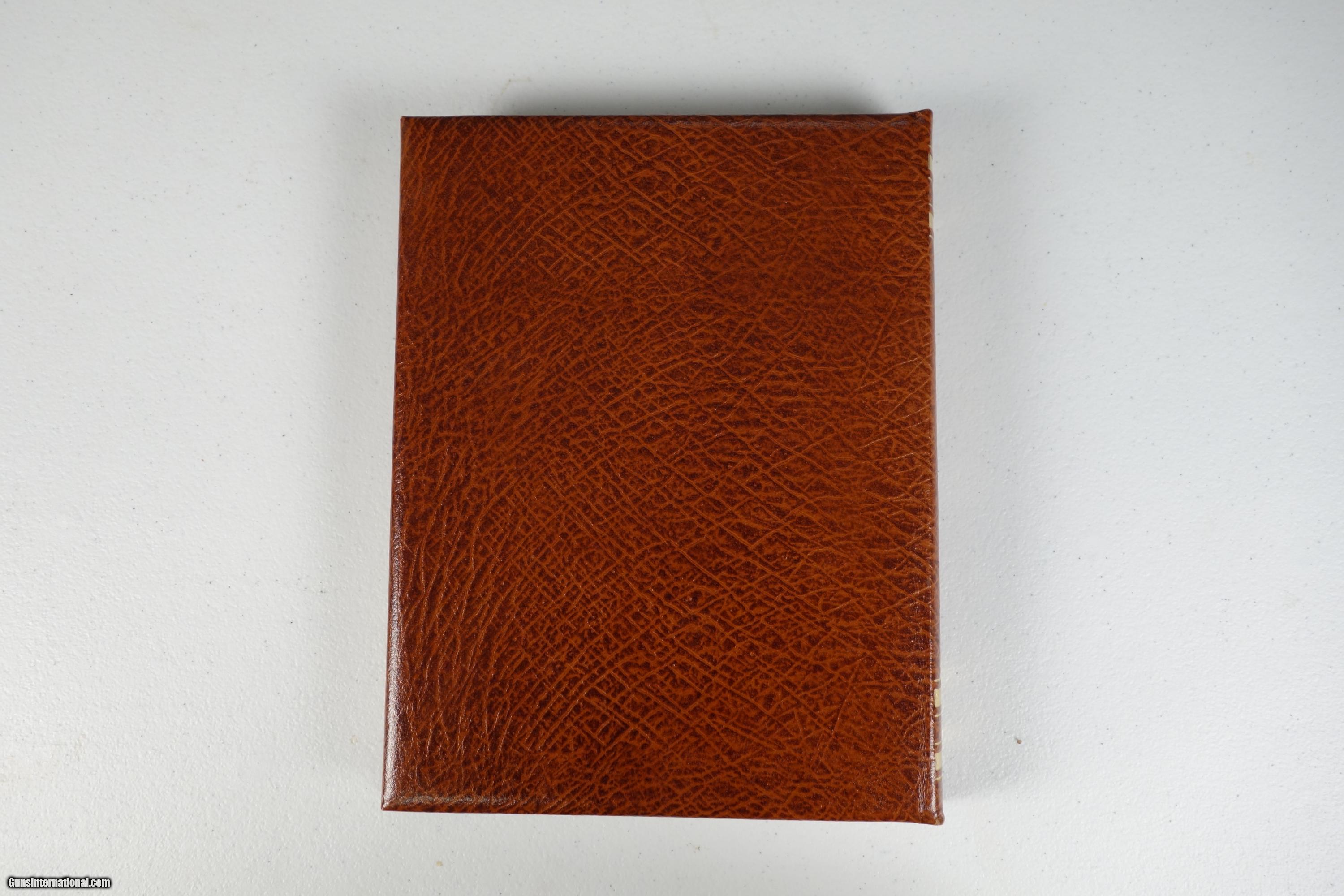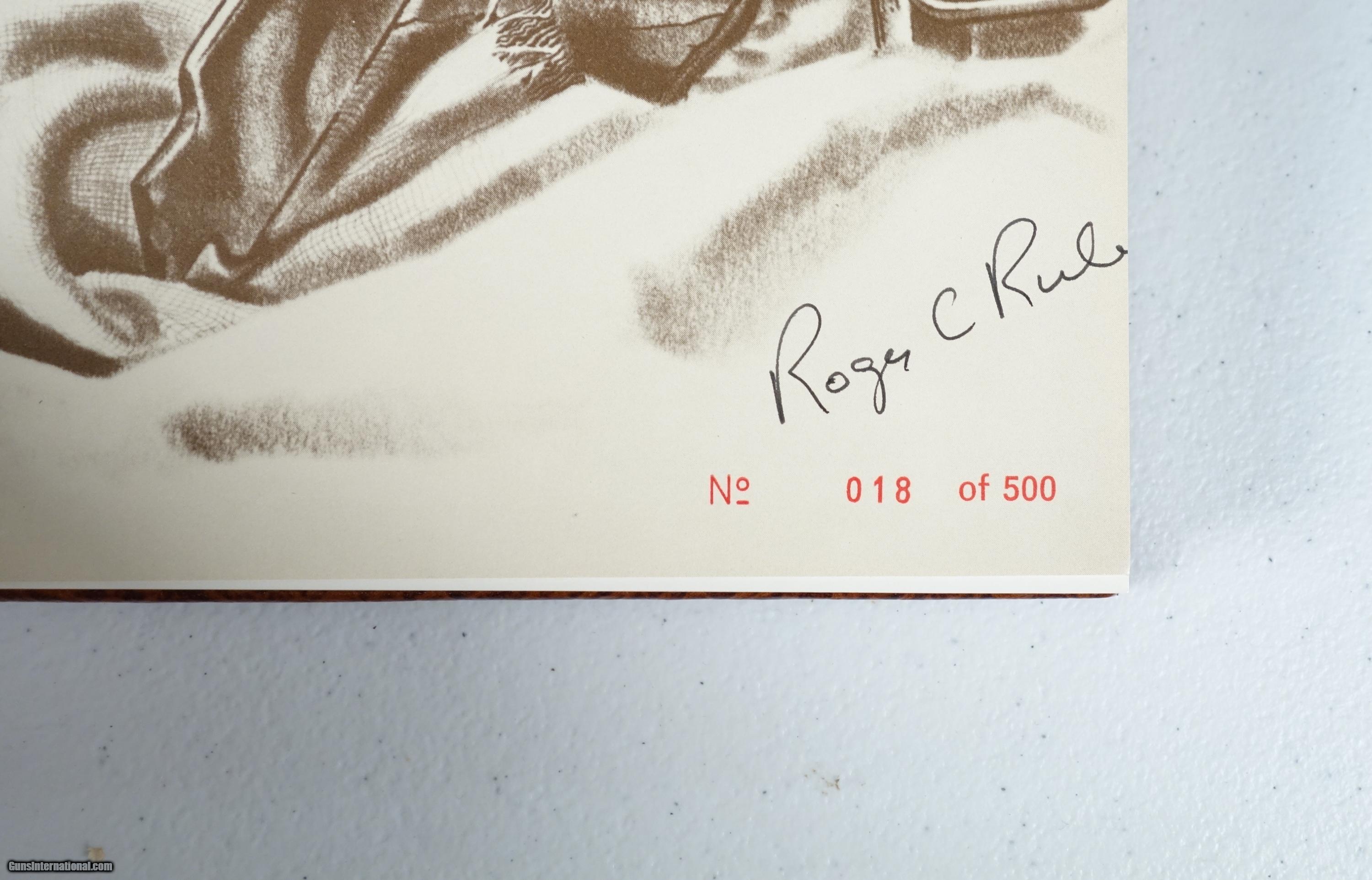 Description: The Holy Grail of any Pre 64 Winchester Model 70 collector's reference library... Here is an extremely rare 1982 1st and limited edition DELUXE LEATHERBOUND, GOLD FOIL EMBOSSED, SIGNED AND MACHINE NUMBERED 1 of 500 example of Roger Rule's famous book referred to by all who know as "The Bible". Note the high quality gold foil rifle image and borders on the cover in contrast to the well known standard "leatherette" hard backed version. It is in near mint condition with no stains, tears, tape, missing pages, notatations, or any other issues whatsoever. It is numbered 018 of 500 and has been signed in original pen by author. These seldom surface and when they do are frequently in lesser condition at incredibly high prices. USPS Priority shipping will be additional $20 packed with care and double boxed. SOLD |