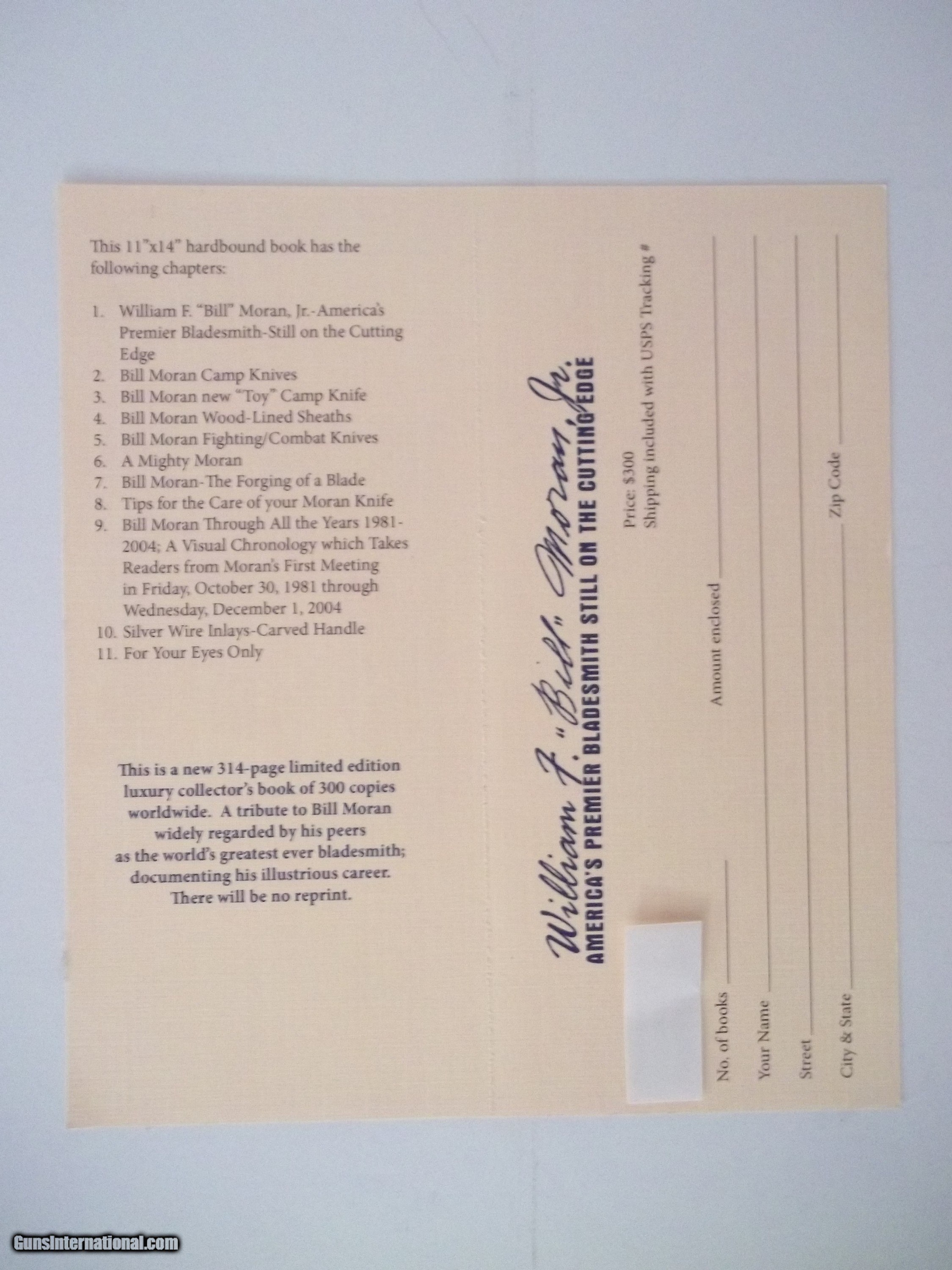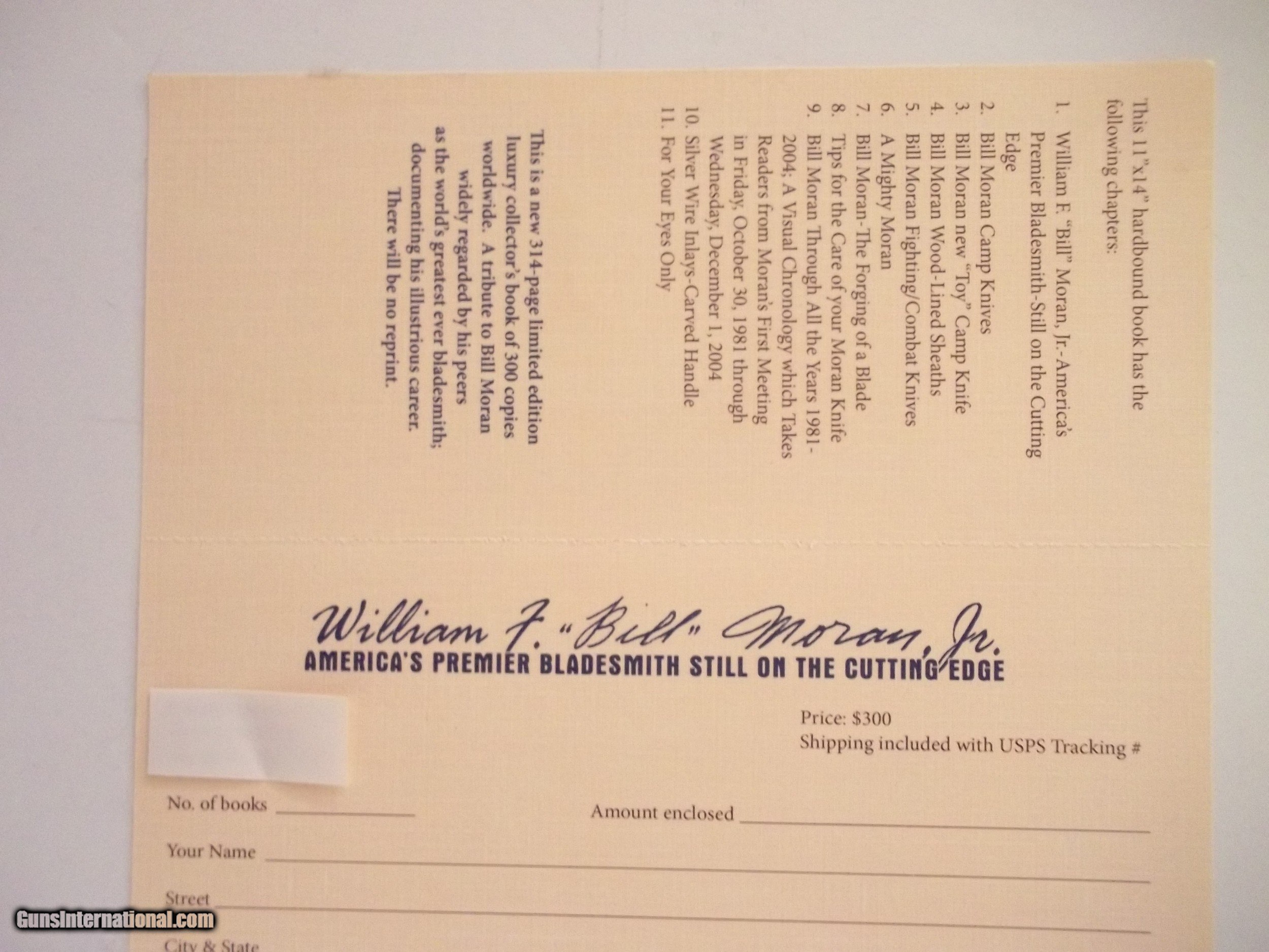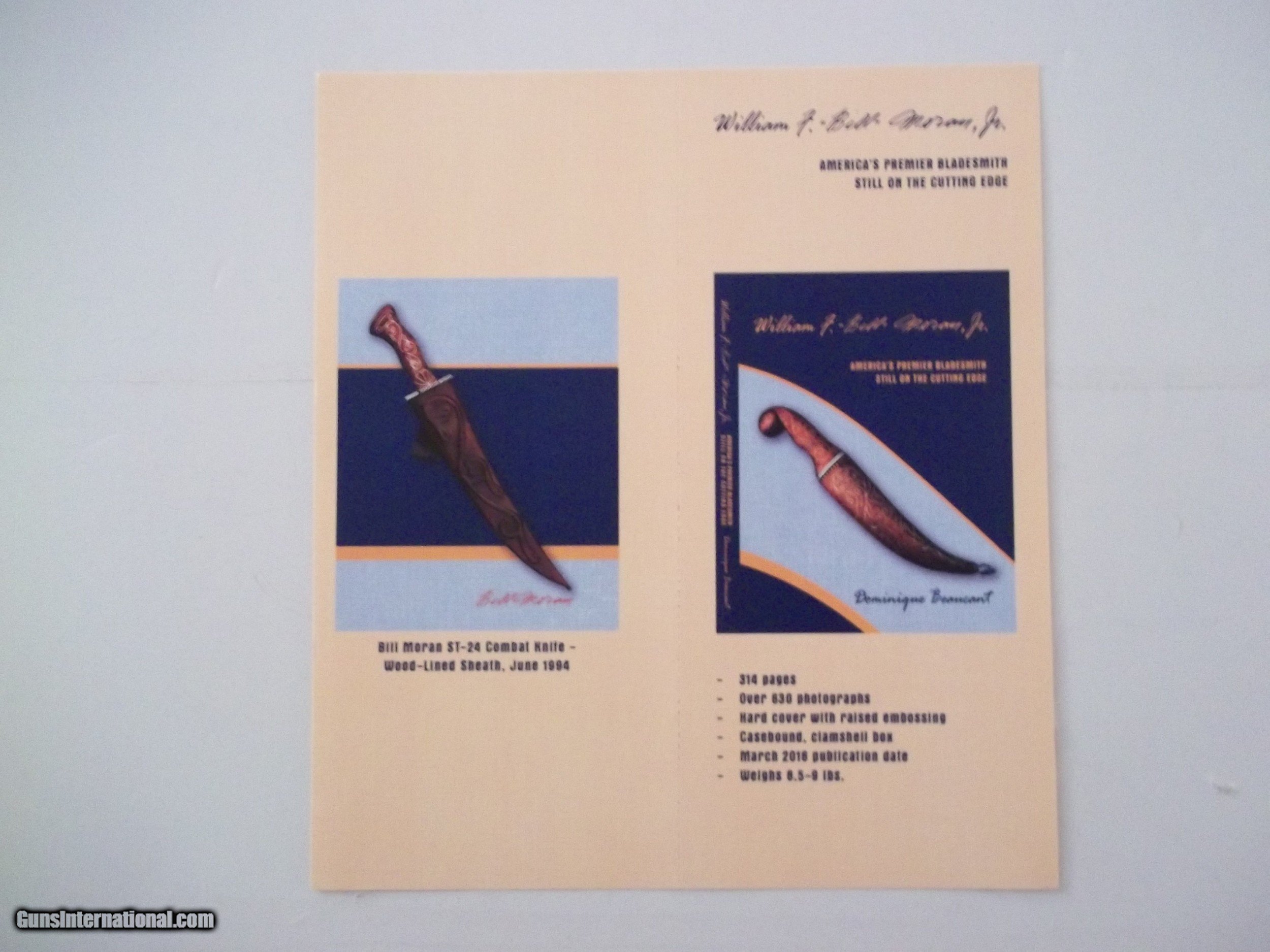 Description: This new luxury collector's book : William F. "Bill" Moran, Jr. America's Premier Bladesmith-Still On The Cutting Edge, is to pay tribute to the legendary Maryland blacksmith, widely regarded by his peers as the world's greatest ever bladesmith. Only 300 copies are being printed, (there will be no reprint) of the hefty tome that contains 314 pages, which is a historical and graphical account of his illustrious career that included text, countless never-before-seen photographs (over 630 in all) and most recently uncovered important facts and information on the life and times of Bill Moran. Offered with a raised embossed front cover, case bound deluxe full clamshell box, with 150 Pts. cover, 120 Pts, side walls, 43 lbs. translucent Vellum sheet with imprint on it, the books weighs over 10 lbs. 12.8 oz. The book's main title is taken from Bill Moran own original handwriting, while the back cover is Bill's own original signature. This 11" X 14 " hardbound book has 11 chapters. Clamshell box is two ( 2) inches high, with high-gloss Rainbow 3 sky blue 3-D foil stamping on main title, sub title and author's name ( same on book's spine). As always I offer free shipping USPS with tracking #, delivery confirmation and signature required.. Thank you for looking. NOTE: When ordering , please advise if you wish to have your copy personalized and signed, otherwise book will bear no signature or autograph since it comes in its original shrink wrap from the printer. Books were received on March 3, 2016. SOLD |