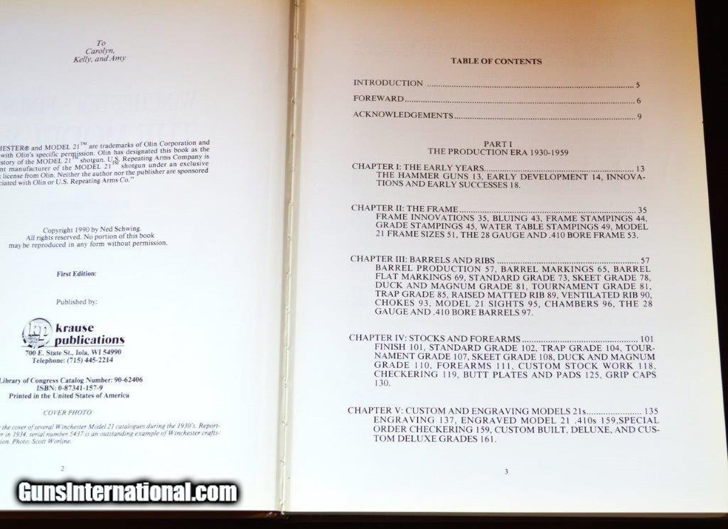 Description: Get the most complete information on one of the finest double-barrel side-by-side shotguns made in America. The Olin Corporation designated this book by Ned Schwing "the official history of the Model 21 Shotgun." Author Ned Schwing gives you the most accurate and complete book on the Model 21 ever written. The book is full of charts, graphs, drawings and actual photographs of all aspects of this wonderful double barreled shotgun. 359 pages of knowledge packed information to learn about. 95% on the outside and perfect on the inside. Chapters include: The Early Years, The Frame, Barrels and Ribs, Stocks and Forearms, Custom and Engraved Model 21s, Experimental and Prototype Model 21s, Production and Sales Figures. Part Two includes chapters on The Custom Shop, The Custom Guns, and lastly Custom Model 21 Sales and Production with Appendixes A & B and a Biblography. Prices include book rate shipping to the lower 48. Alaska and Hawaii additional. SOLD |