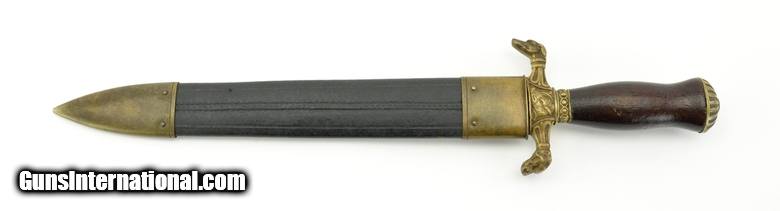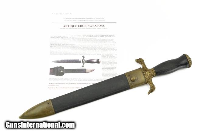 Description: "Ames Double Dog Head Bowie Knife. Very scarce Ames manufactured Bowie knife. Not a lot is known about these knives. Several known examples have soldiers’ names to units that were raised in the Springfield and Chicopee regions of Massachusetts; which is also the area where the Ames factory was located. Blade shows a light to medium gray patina with some darker staining. This looks like a knife that has been used. The scabbard shows some restoration. A very rare piece! SOLD |
