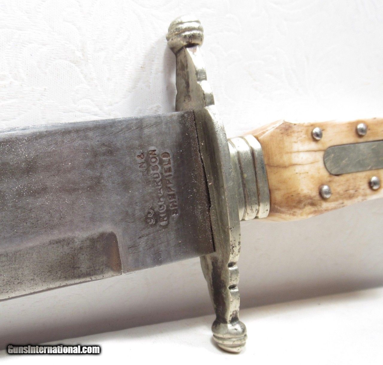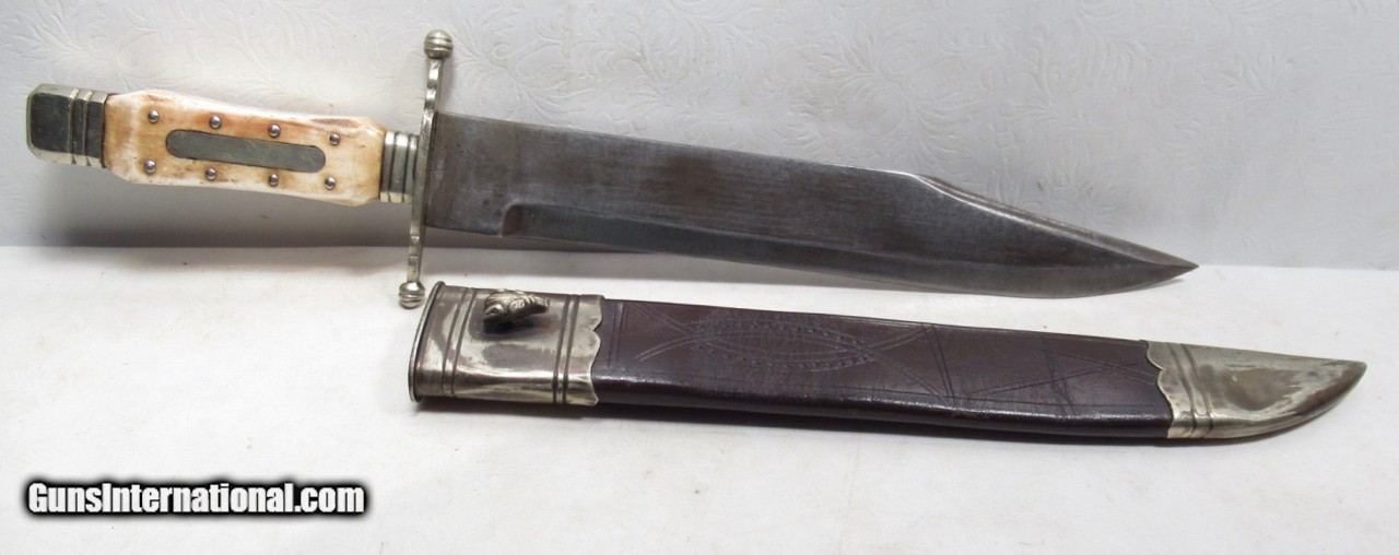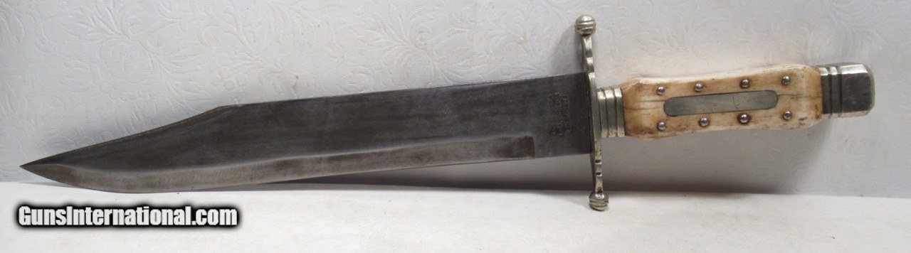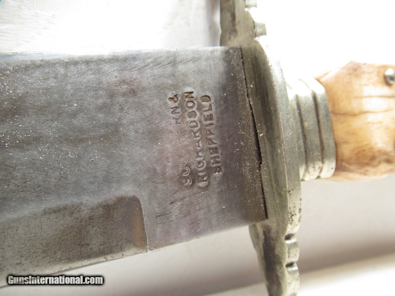 Description: Bowie Knife with Sheath; 10 ½” Clip-Point Blade Marked “Southern & Richardson – Sheffield”; 15 ½” L.O.A.; Age Unknown; See All Photos for Condition; No Texts; Call (254)541-5765 or Email Only; PERSONAL PROPERTY of Harold Wieser; NOTICE: We Do Not Do Any Consignments - All Items Listed are Owned by Us - NO SALES to New Jersey or New York City - Antiques Only to Massachusetts and California; Price: $875 + $45 S&H Sold as is - No Returns; Payment Address: Harold Wieser - 1466 U.S. Hwy 77 - Rosebud, TX 76570; SEND PAYMENTS VIA USPS PRIORITY MAIL; BEWARE of SCAMS!!! – DO NOT SEND MONEY or CORRESPONDENTS ELECTRONICALLY UNLESS YOU HAVE SPOKEN to HAROLD WIESER FIRST! 254-541-5765 SOLD |