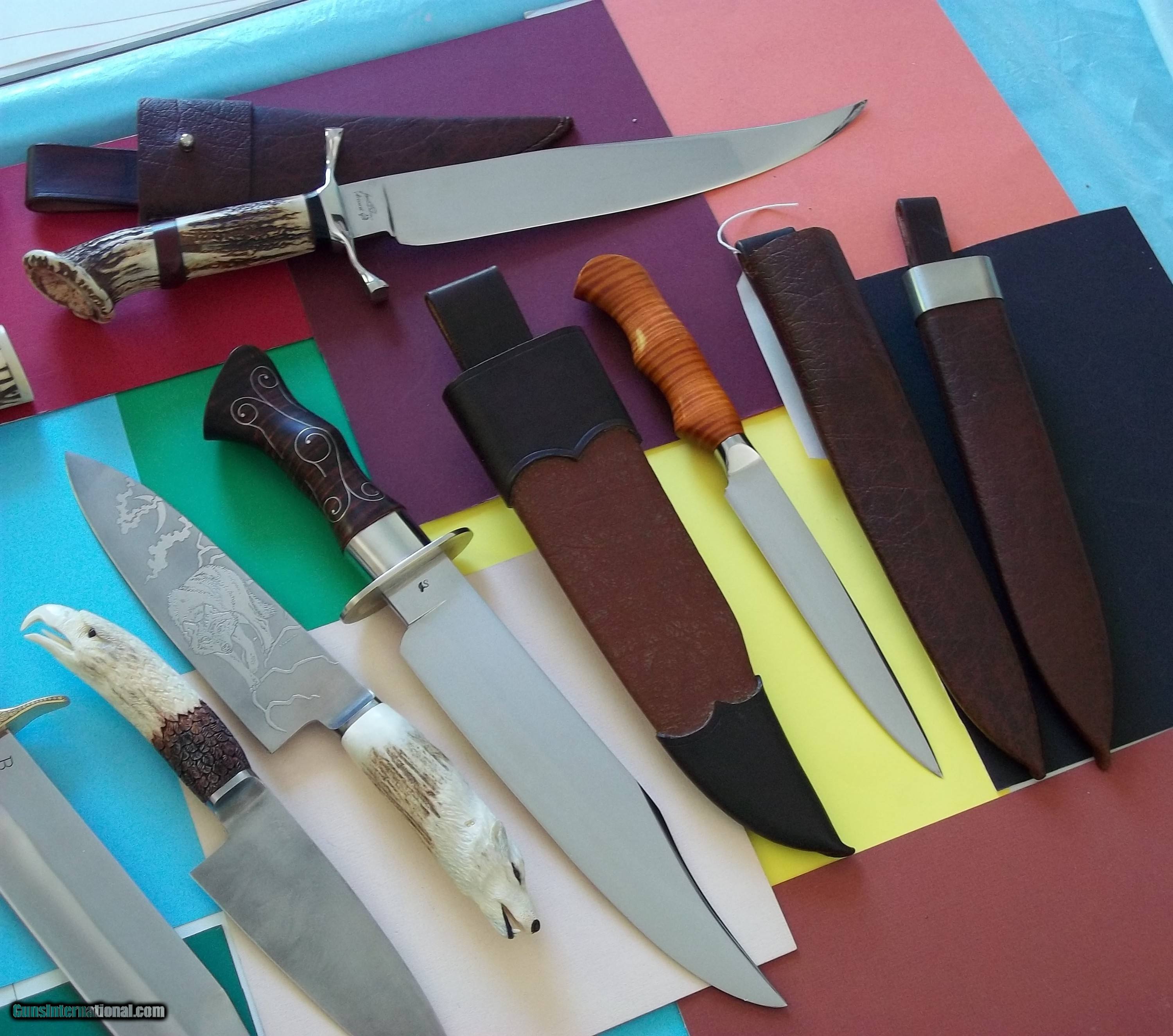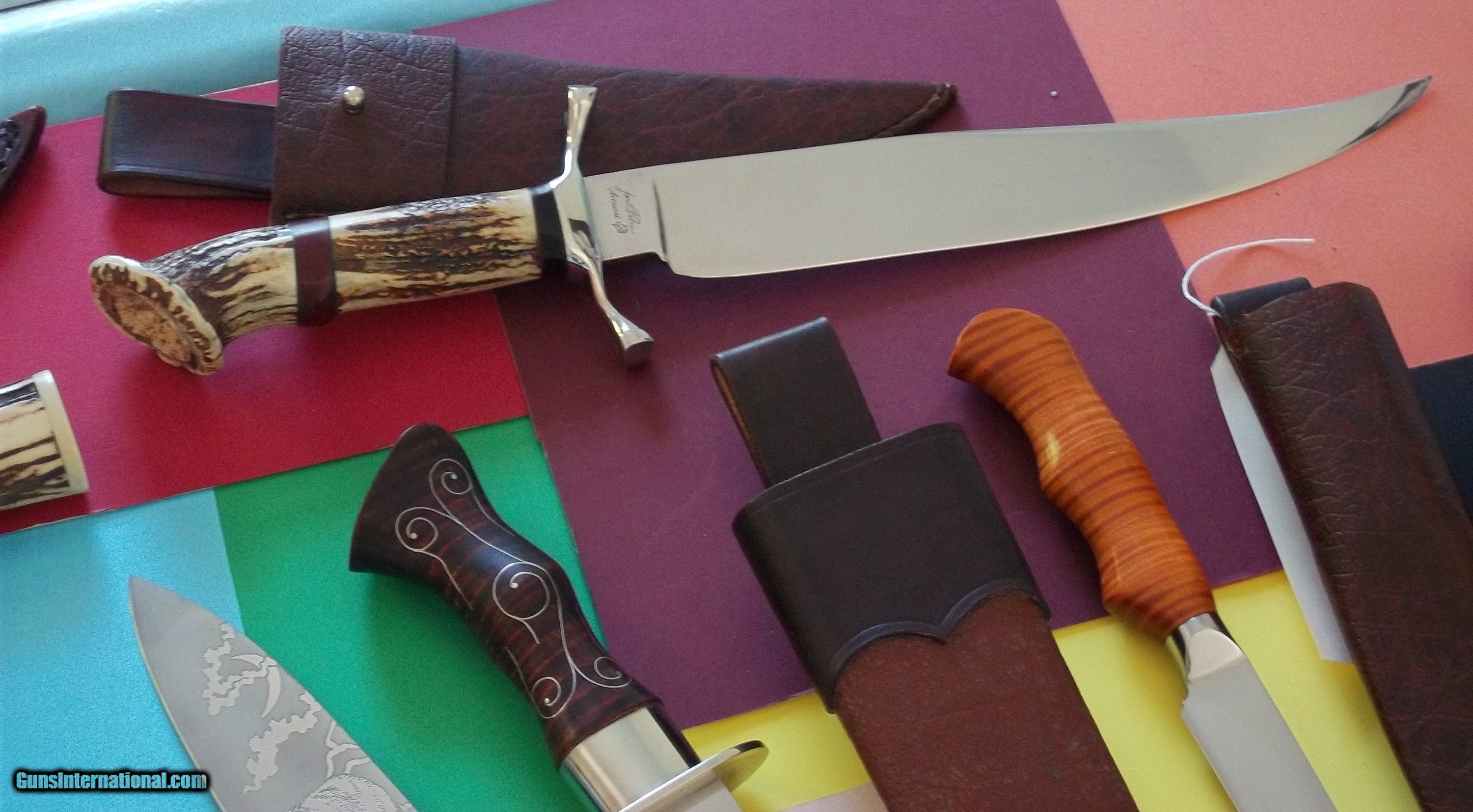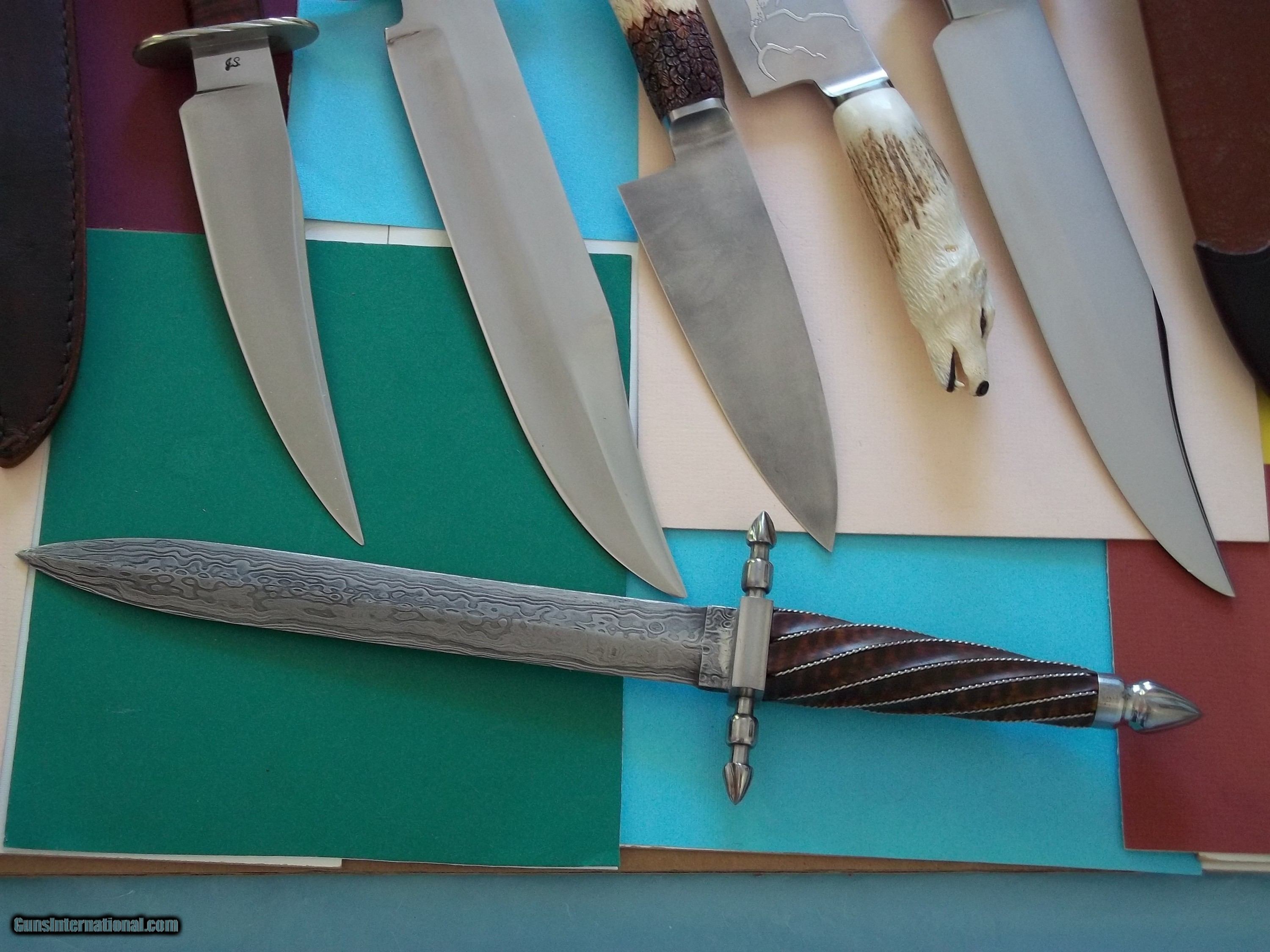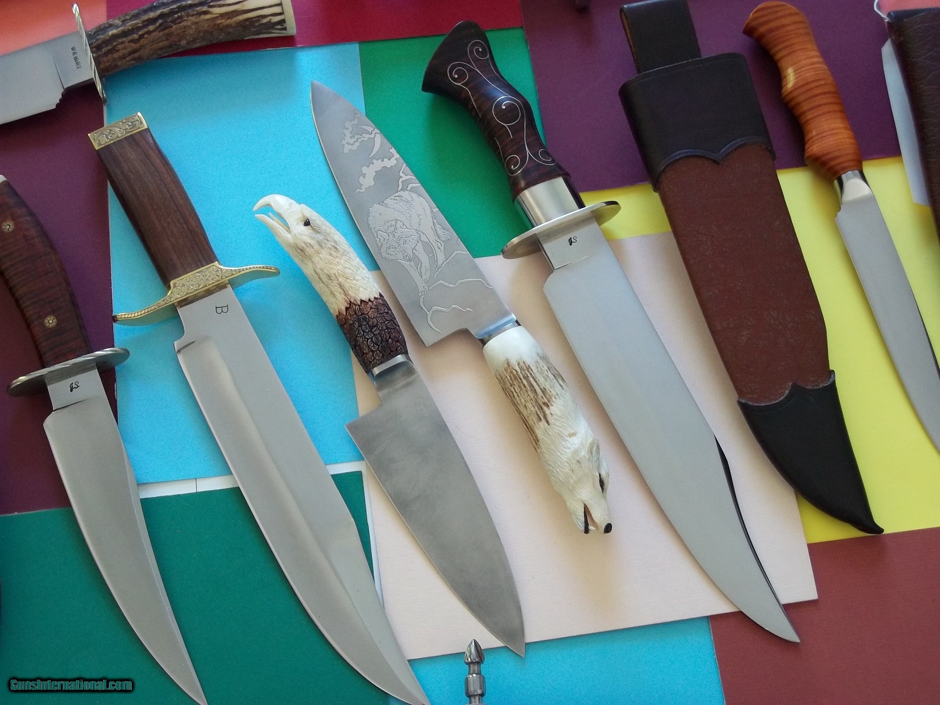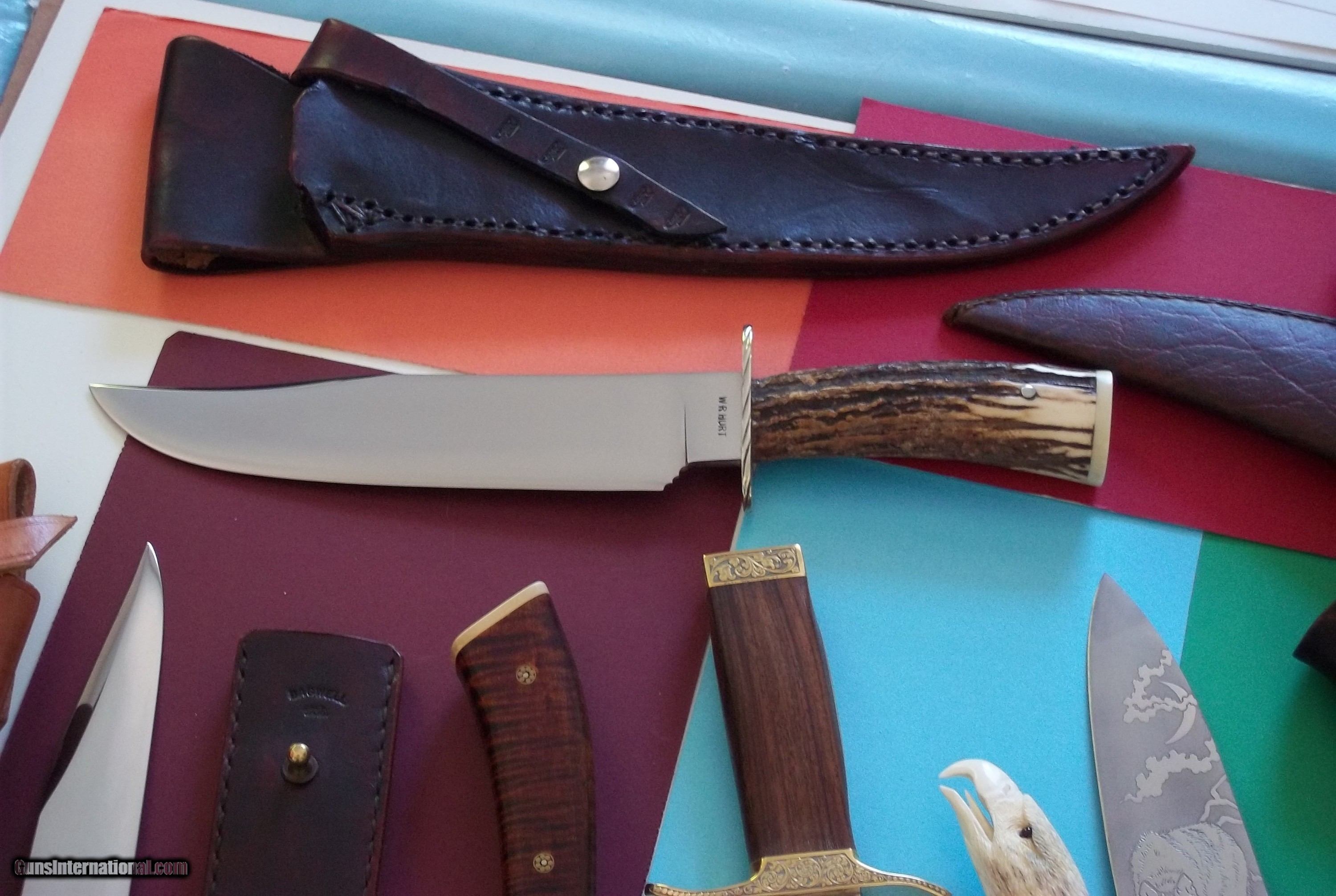Description: Beautiful knife collection which includes knife or knives by : William R. "Bill" Hurt, a combo of James L. Batson,Jr-& Cleston Sinyard, "Desert Strorm" one of a kind Bowie-never to be reproduced. provemance letter from Baton and Grussenmeyer- Bill Bagwell original 1969 engraved Hell's Belle by E.C.Prudhomme 1972, carved handle by Paul G. Grussenmeyer and etched blade by Francine on two David knives by David Boyle.Bill Bagwell June 1986 Bowie made for ABS Jeffrey A. Harris . All knives in an absolute mint, pristine, immaculate, new condition. Price on request due to the very high value of this spectacular knife collection. If truly interested by any knife or knives, pleasse feel free to send a message.All knives by Bill Hurt comes with original data and record knife sheet with prices paid at that time of purhcase and several provenance letter for each model. Free shipping UPS within the U.S. only with full delcared insurance value and tracking #. I do not engage in any type of trade, neither that I will no longer wish to ship to a P. O.Box as I have had parcels stolen in the past. All knives sold "AS IS," no return, no exchange, no refund. Thank you for looking. Note: Knives are available individually if desired. Bill Hurt only made 251 knives in his knifemaking career. All shown knives are the ones he presented to an ABS Master Smith Board panel in order to obtain his Master Smith ranking. They are the most beautiful, stunning knive she has ever made ( as mentioned in his provenance letters) SOLD |