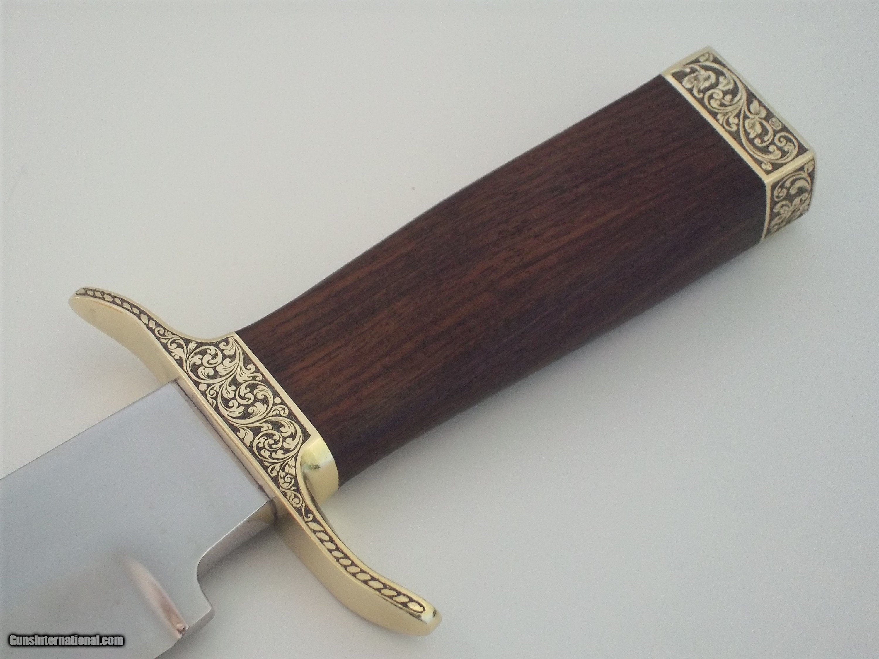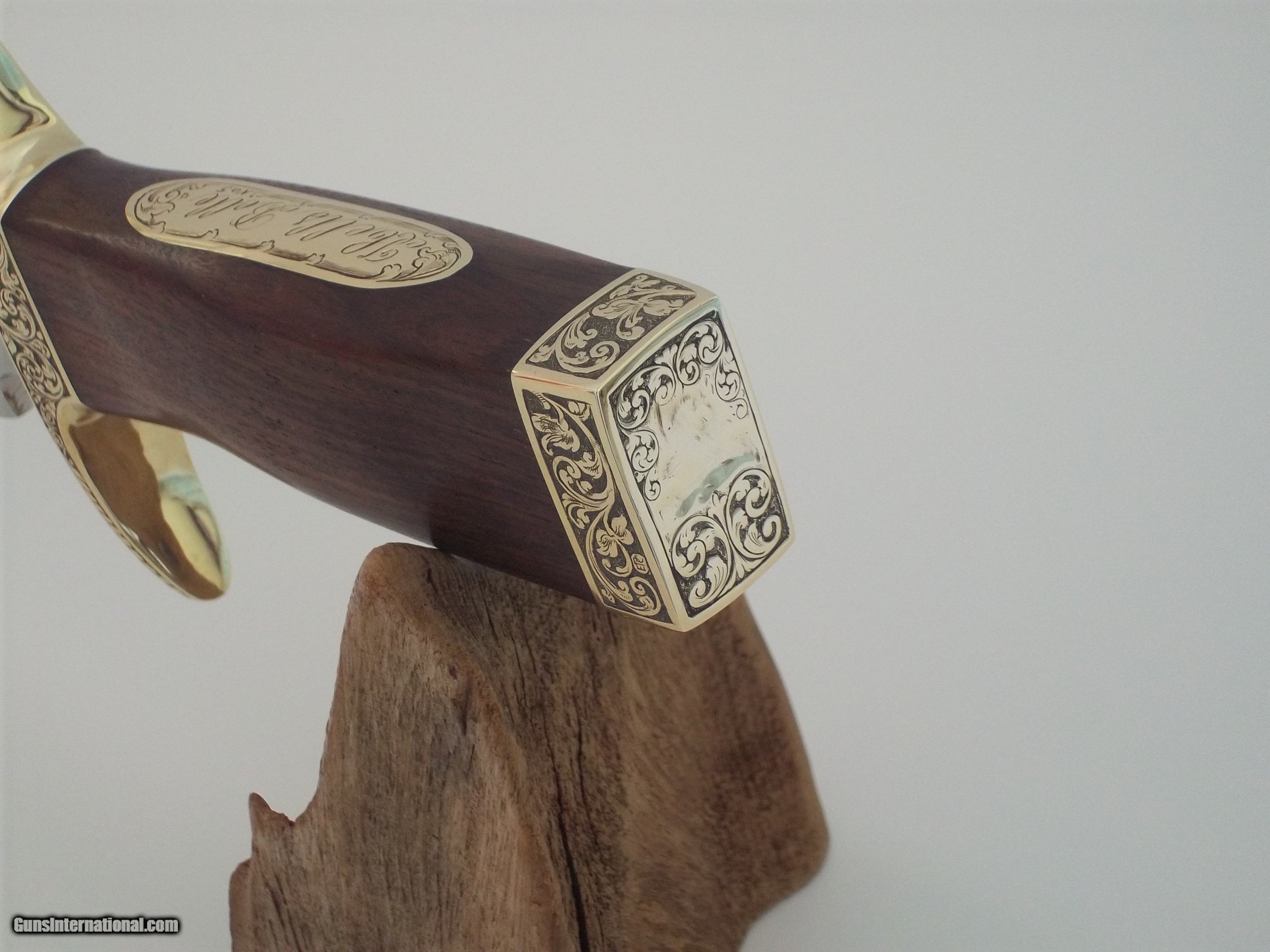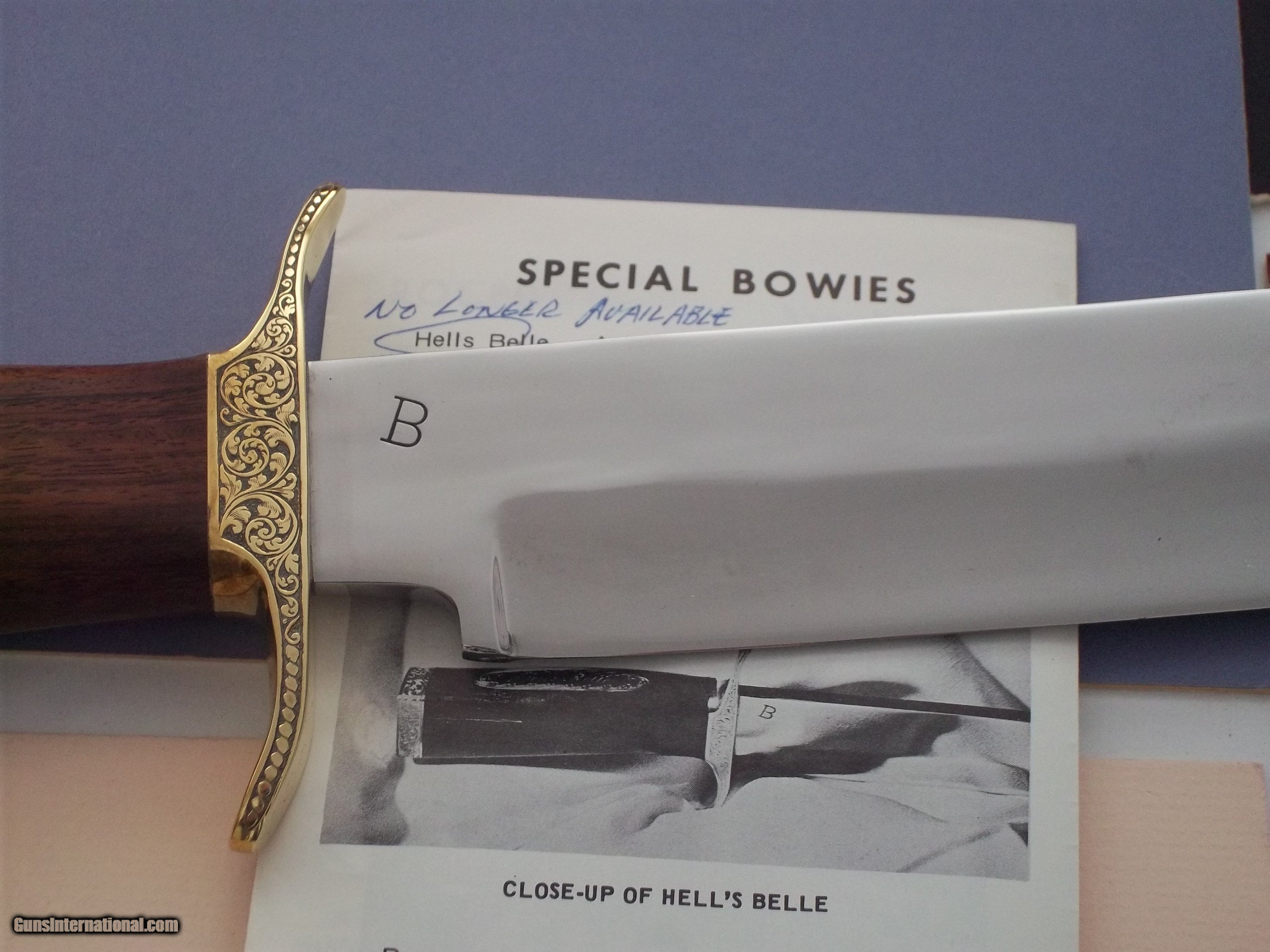 Description: Extremely scarce, and one of the finest ever produced William P. Bagwell's comes in the form of this unique and historic original "Hell's Belle" Presentation Gentleman's Bowie Knife from 1972. Engraving by Master Engraver the late great E. C. Prudhomme,(1911-1990 ) mounts, guard, escutcheon, pommel. Blade marked on right side with the rare "B" initial at the ricasso. Ten-and-a quarter clipped point blade by 1-7/8-inch wide, from 1/4-inch 1040 steel stock, 14-7/8-inches overall length, denotes a brightly mirror polished finish, and a sharpened false edge, fancy "S" shaped brass crossguard, large oblong escutcheon embedded in the American walnut grip, brass butt cap. This is a high-grade exhibition Museum caliber item. Condition is mint. No sheath was ever made for this knife. The wooden presentation case is not the original, but I can thruthfully states that this particular case was made in May 1982; the knife fits perfectly inside it. I am enclosing such with the knife as I have no needs for it. A photocopy of catalog # 2 comes with the knife. Buyer pays shipping,(to be determinated) using UPS with tracking number, full declared value for insurance purposes, signature and delivery confirmation will be required. This is a FINAL sale. I do not accept return. Sold only to the Continental US, Hawaii and Alaska. No international shipping. Indicative of the scarcity is the astonishing engraving by E. C. Prudhomme. NOTE: Being an abbreviated description, send a message if further details are needed concerning this fascinating knife from the past, as the full description is lengthy. SOLD |