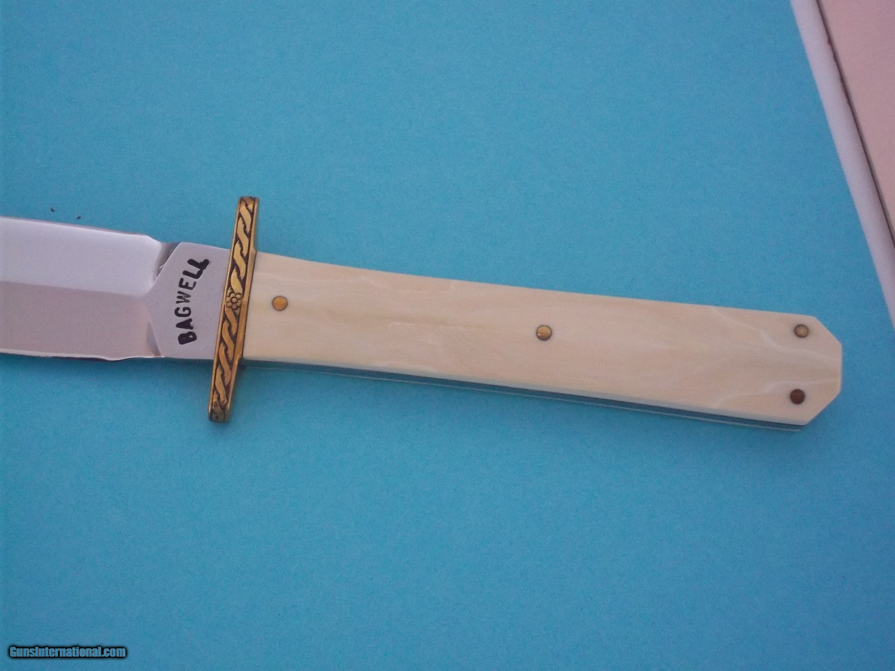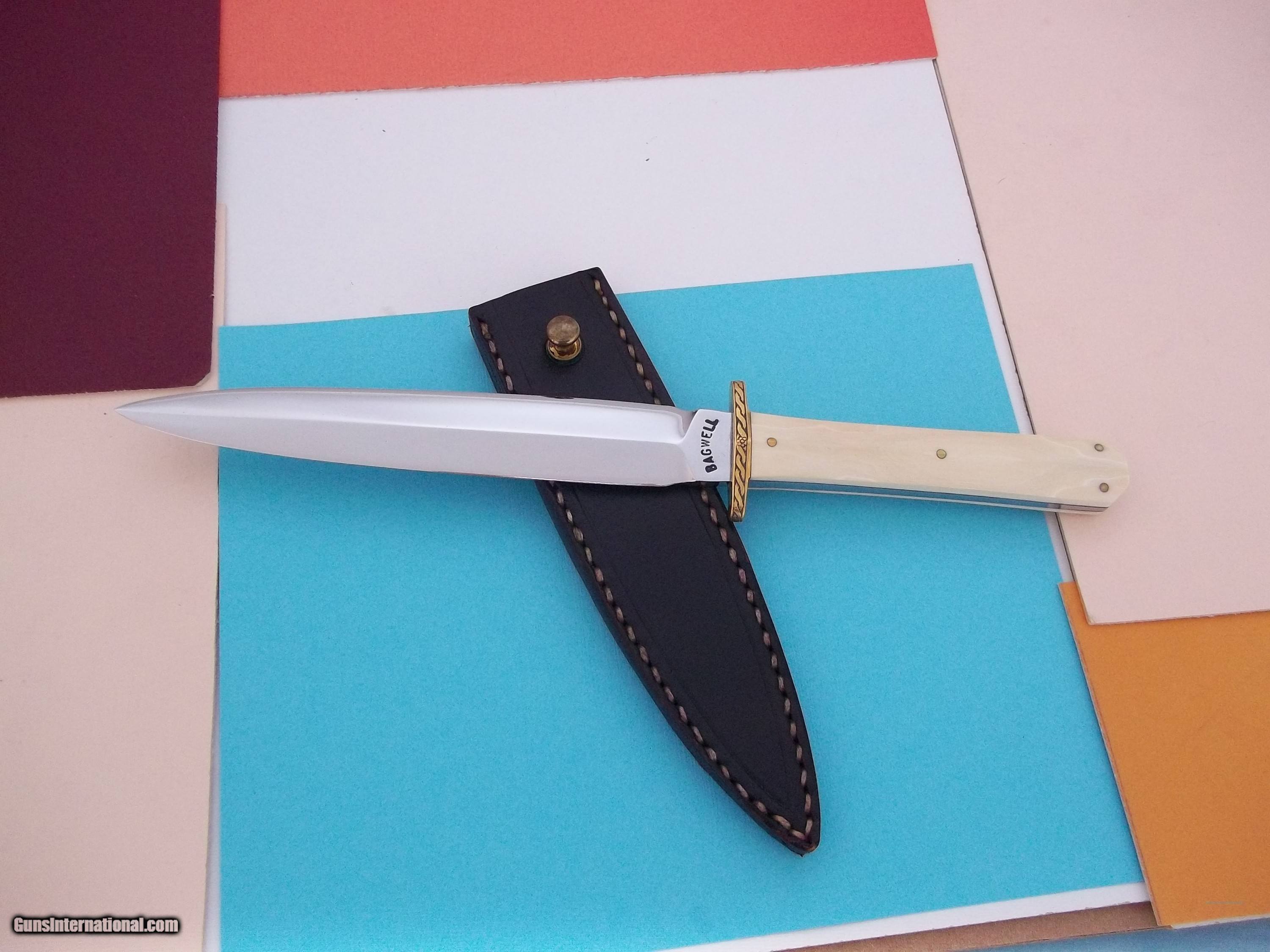 Description: William P. Bagwell one-of-a-kind engraved dagger by the maker, double brass guard with fancy engraving, blade is stamped BAGWELL on the obverse and DOUBLE EXTRA FORGED on the reverse. This is the only dagger-type knife Bill has ever made with ivory. Seen in catalog # 3 as "San Francisco Dagger." A rarity knife as it is an object of unquestioned beauty and known authenticity. Sold "AS IS." Al sales are final. Seen in the Limited Edttion Collector's book ," A Private Collection of 95 CUSTOM KNIVES,( sold out). and in the limited Edition catalaog depicting 95 custom knives for sale and in the Bill Bagwell book. Buyer pay shipping USPS (75.00) with insurance, tracking # and signature required Please note that I do not engage in any type of trade-this applies to ANY and ALL listed knives I have for sale! NOTE: The shown price will remain in effect until May 19, 2024. SOLD |