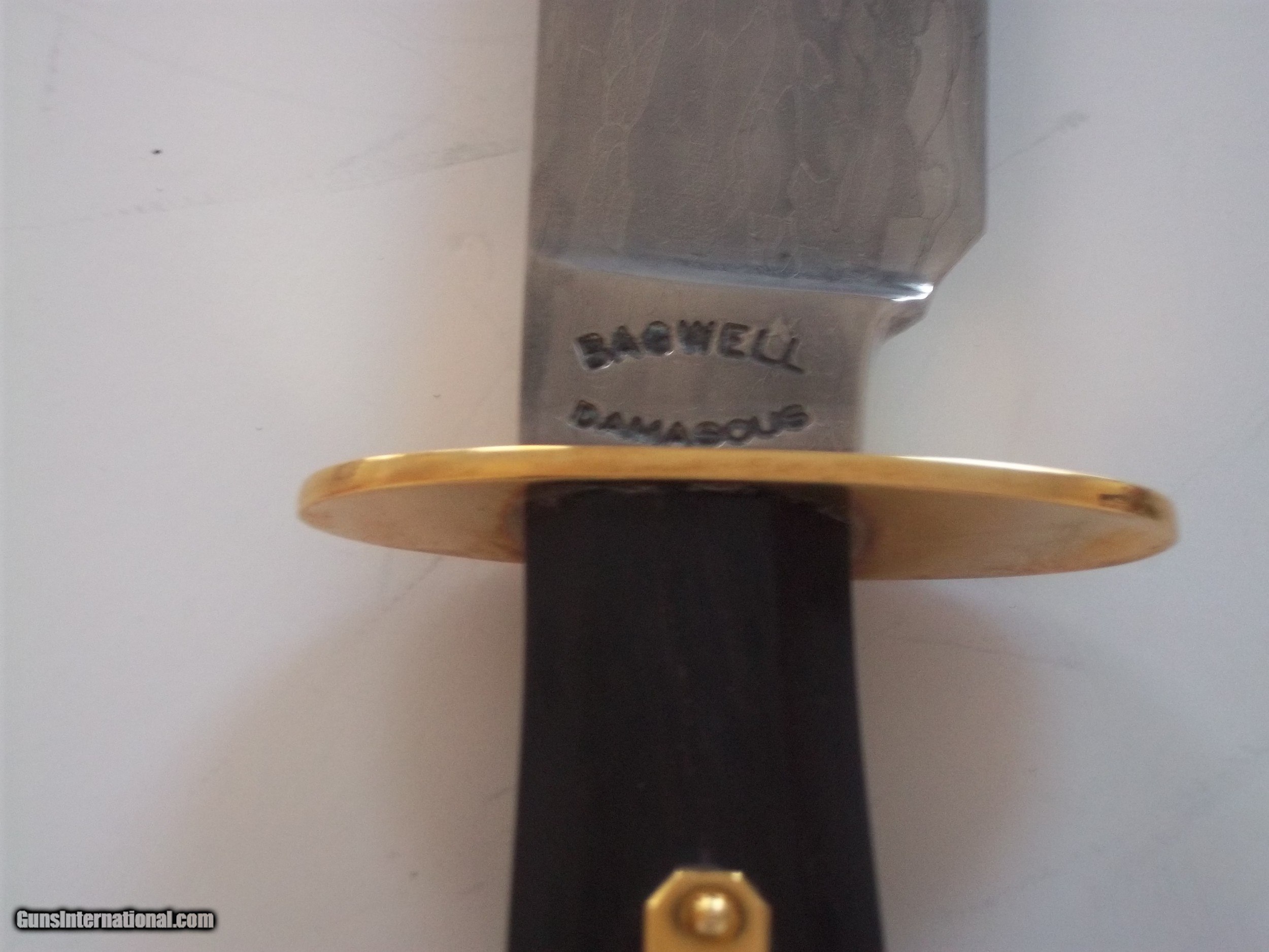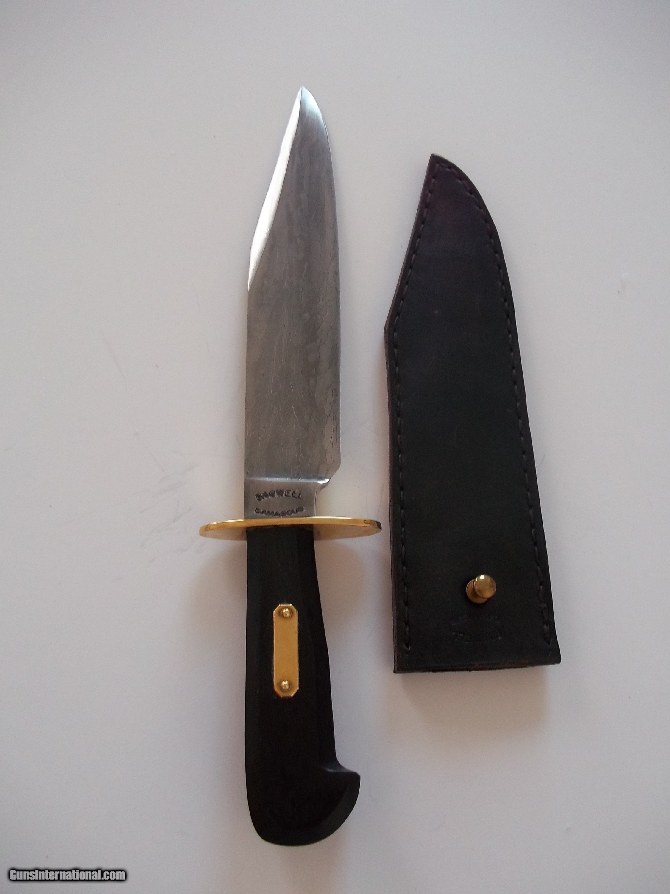 Description: Bill Bagwell uniquely designed, one-of-a-kind heavy-duty 8" Damascus-bladed "Satan Lace" pattern camp/survival/bush model that was made in DeFuniak Springs, Florida in June 1980. Double oblong brass guard, brass escutcheon further secured with two large brass pins, and a rare carved eagle head style ebony handle. This is a mighty all-purpose model that derrives from Bagwell's usual line of combat cutlery as such can be used as a defensive weapon if needed as well. The blade is 1-5/8-inch in width from 3/8-inch thick spine with a full distal taper.The knife is super sharp and should be handled with the utmost care. This is an exceptional model from this legendary bladesmith. Original leather scabbard. Mint condition. I do not engage in any type of trade. SOLD AS IS. Buyer pays shipping USPS tracking # and signaturer required. SOLD |