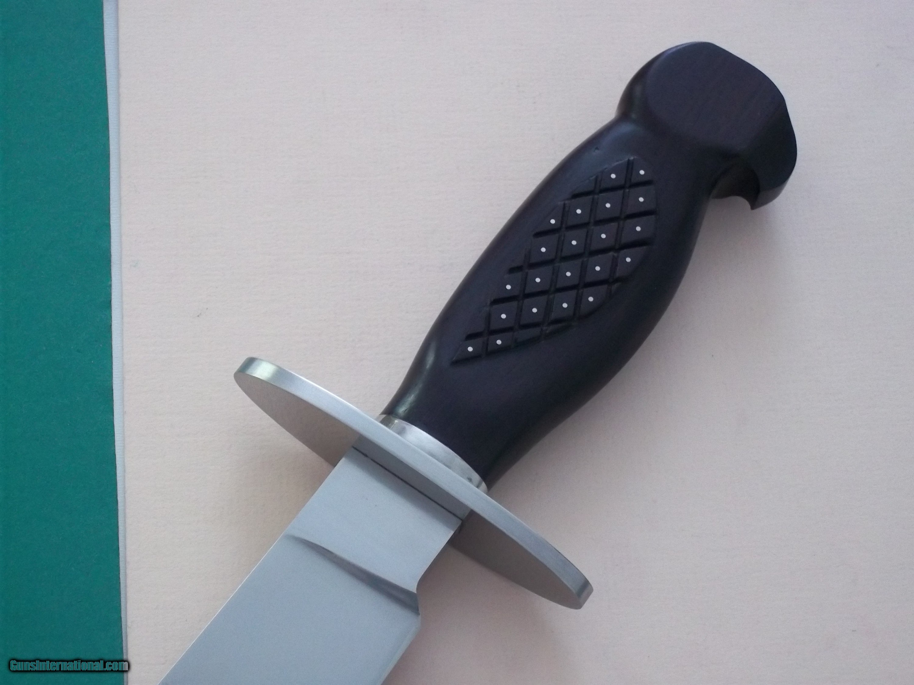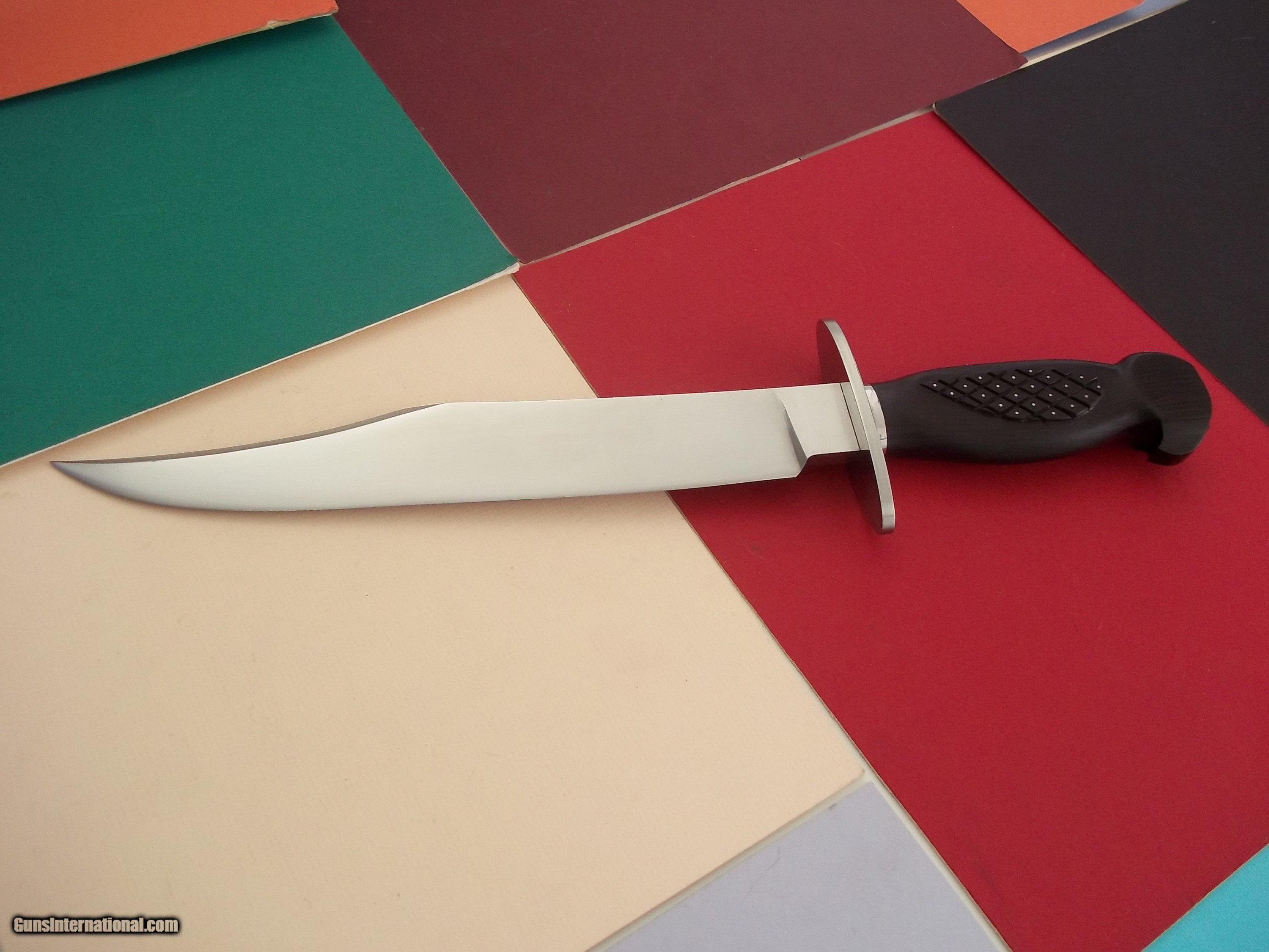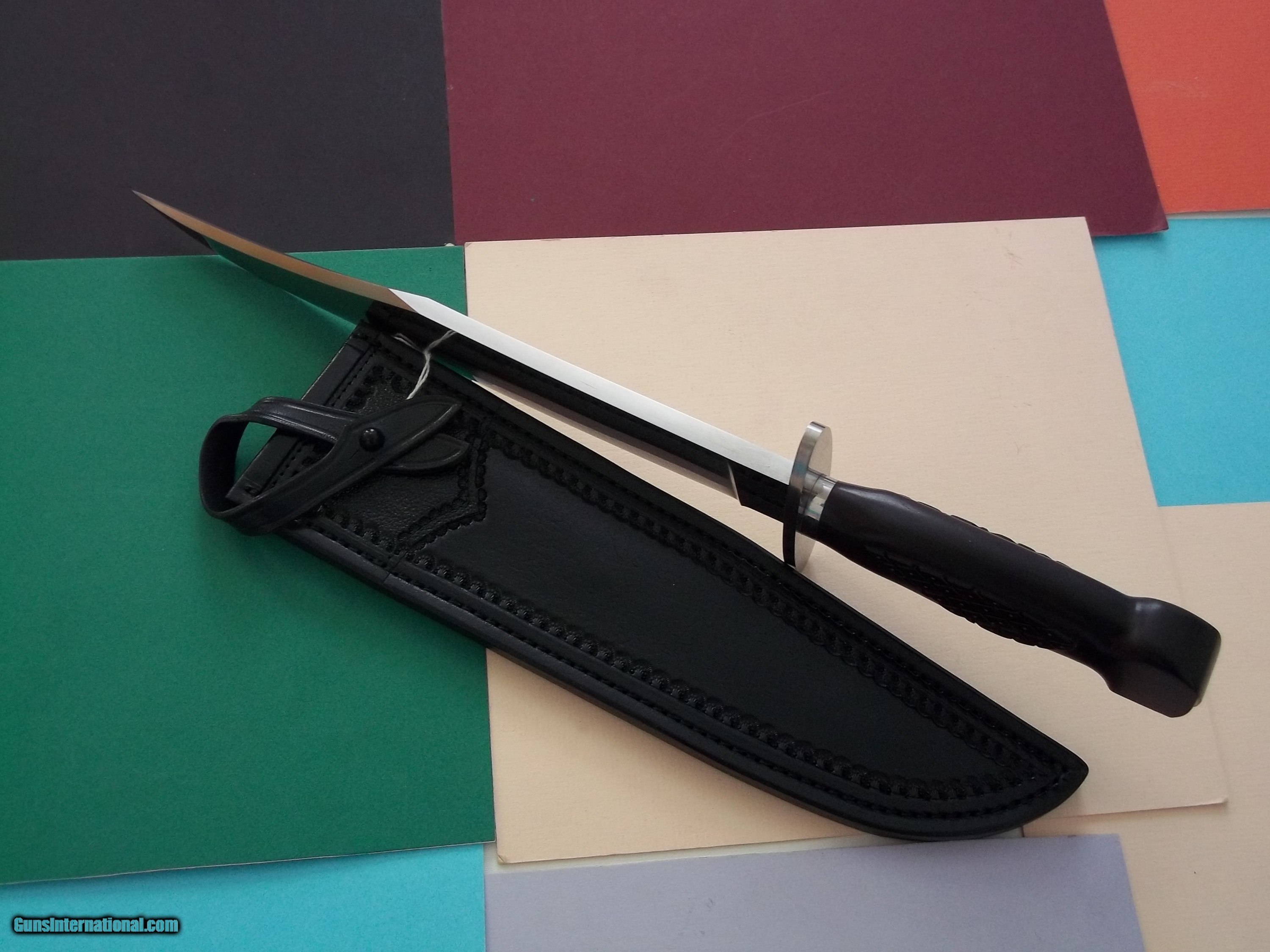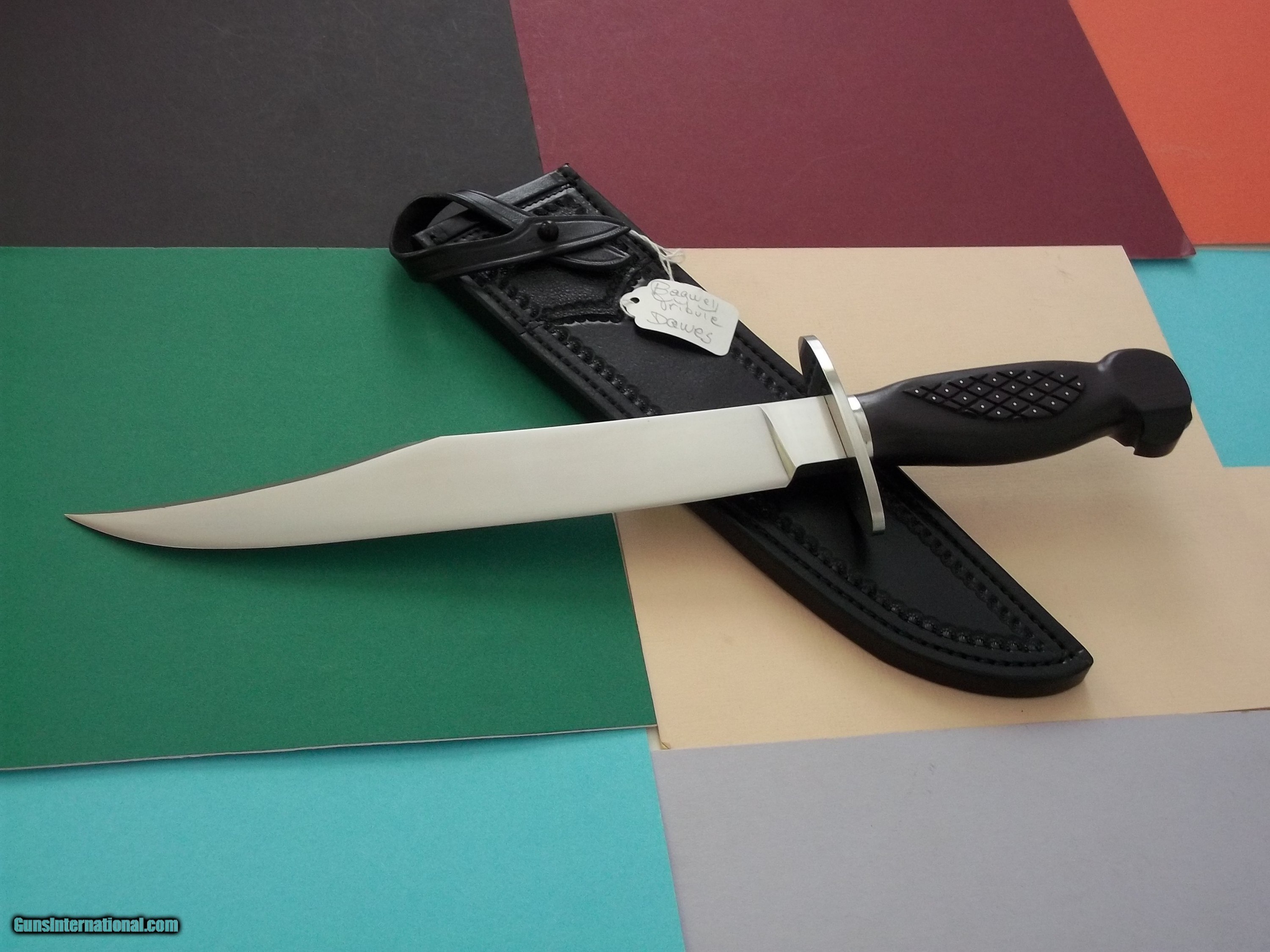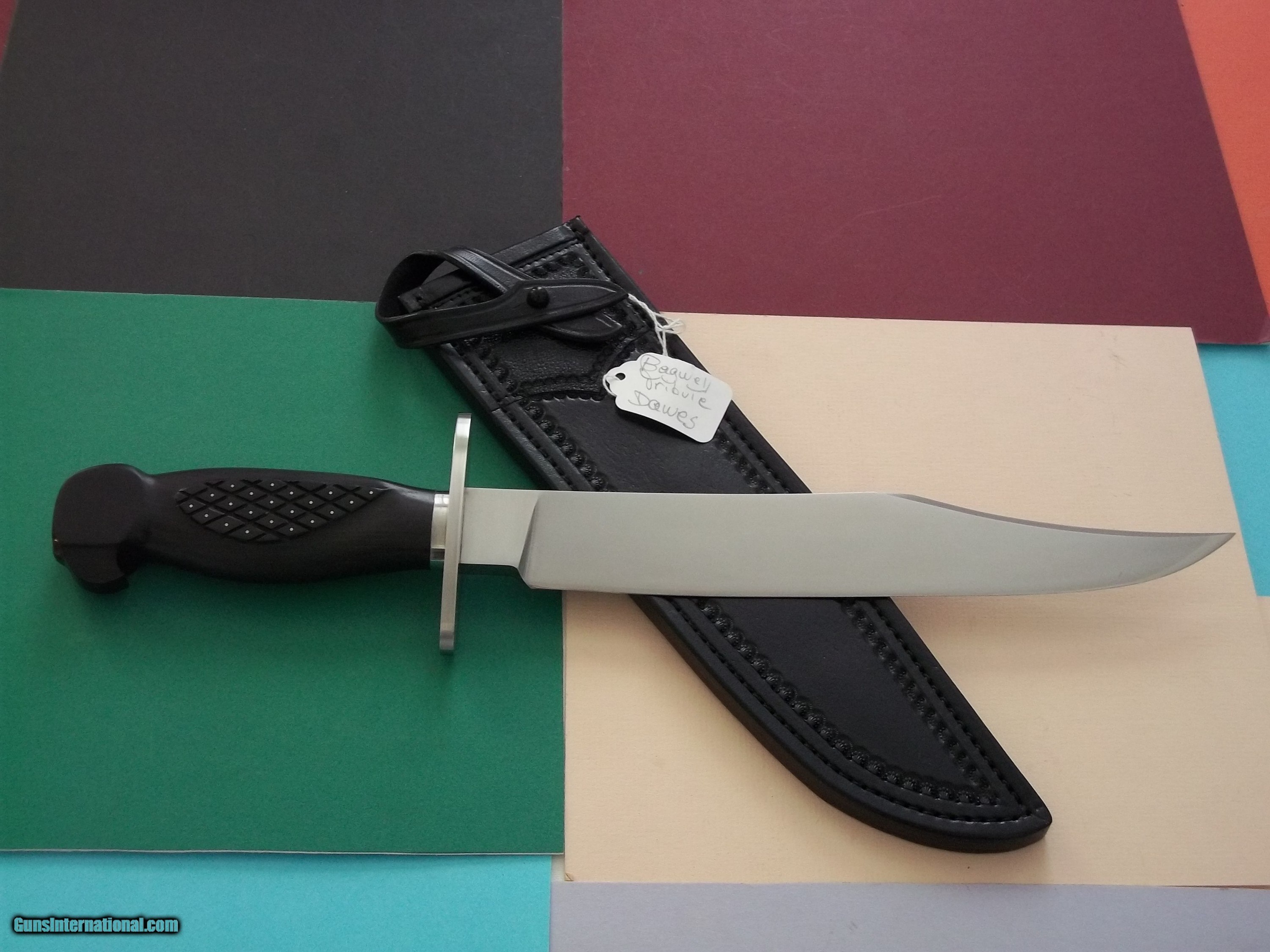 Description: Bill Bagwell Vidalia Maiden "Tribute Knife" exceedingly rare by Richard Dawes, carved ebony eagle head handle with pins as was the original, as seen in the 1978 advertisement photograph insert catalog # 3. Provenance letter included. This is is a one-of-a-kind Bowie that will never be duplicated. Full story about that knife in the Bill Bagwell's book Collector's Edition of only 24 books printed globally. Complete and full file-all emails detailing the making of this historical knife comes with the knife. Leather scabbard by Paul Long. Free shipping USPS with tracking # and signature required. Sold "AS IS." No refund, no exchange. All sales are final. NOTE: Bagwell's original Vidalia Maiden Bowie is practically impossible to locate today, as Bill only made two such knives as seen in the 1978 advertisement insert included in catalog # 3 . If one such example were to be located today, the knife value will be priceless! SOLD |