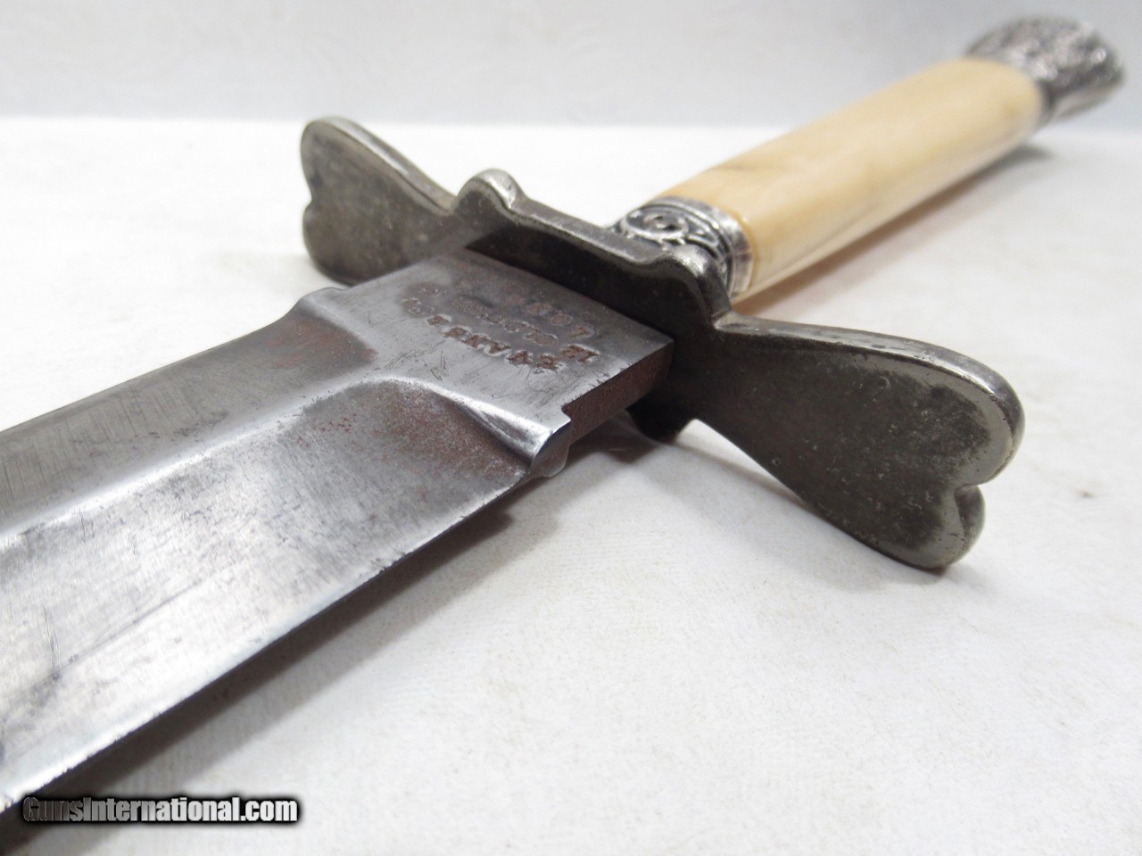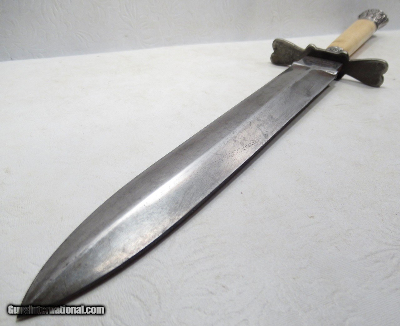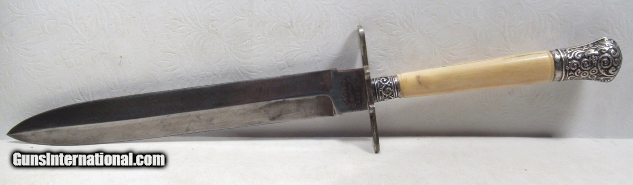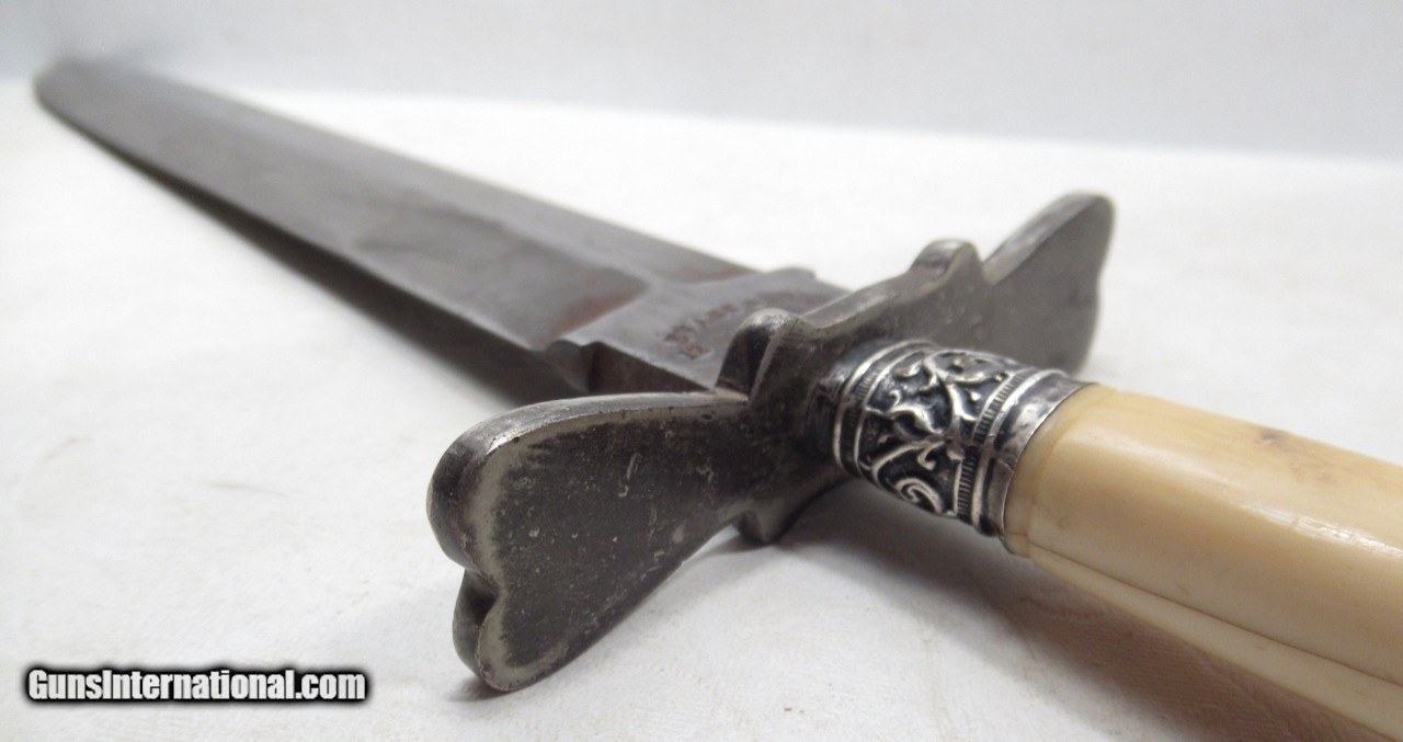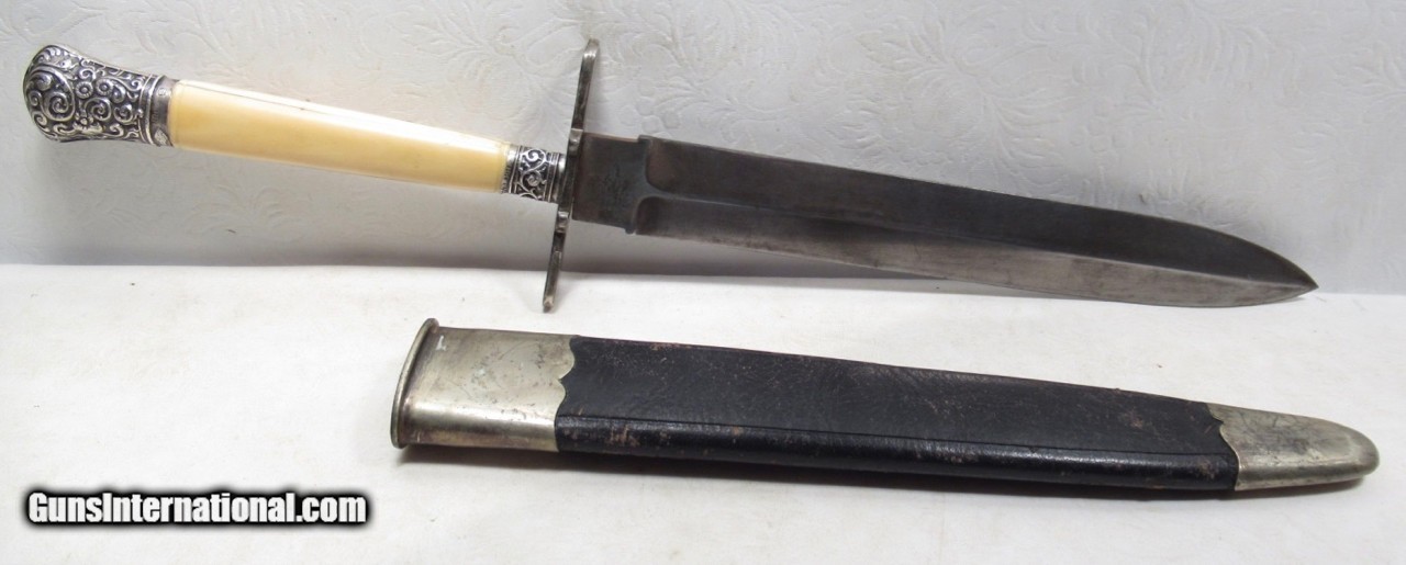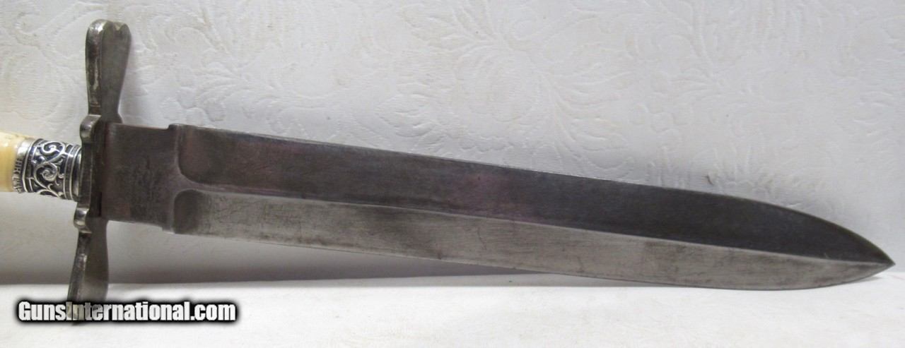 Description: Double-Edged Bowie Style Side Knife; 8 ¾” Blade Marked “Evans & Co. – 12 Old Fish St. – London”; Ivory Handle with Sheath; 14 ¾” L.O.A.; Unknown Age; See All Photos for Condition; No Texts; Call (254)541-5765 or Email Only; PERSONAL PROPERTY of Harold Wieser; NOTICE: We Do Not Do Any Consignments - All Items Listed are Owned by Us - NO SALES to New Jersey or New York City - Antiques Only to Massachusetts and California; Price: $1,275 + $45 S&H Sold as is - No Returns; Payment Address: Harold Wieser - 1466 U.S. Hwy 77 - Rosebud, TX 76570; SEND PAYMENTS VIA USPS PRIORITY MAIL; BEWARE of SCAMS!!! – DO NOT SEND MONEY or CORRESPONDENTS ELECTRONICALLY UNLESS YOU HAVE SPOKEN to HAROLD WIESER FIRST! 254-541-5765 SOLD |