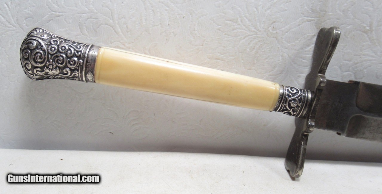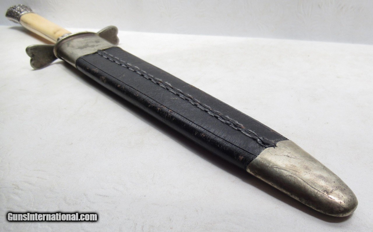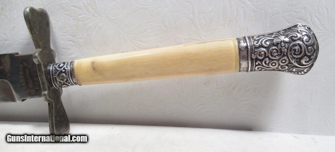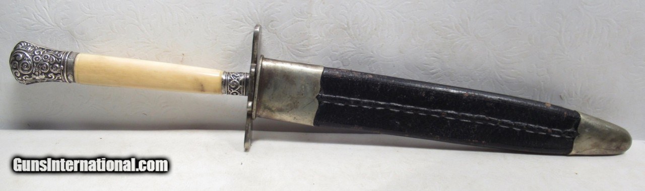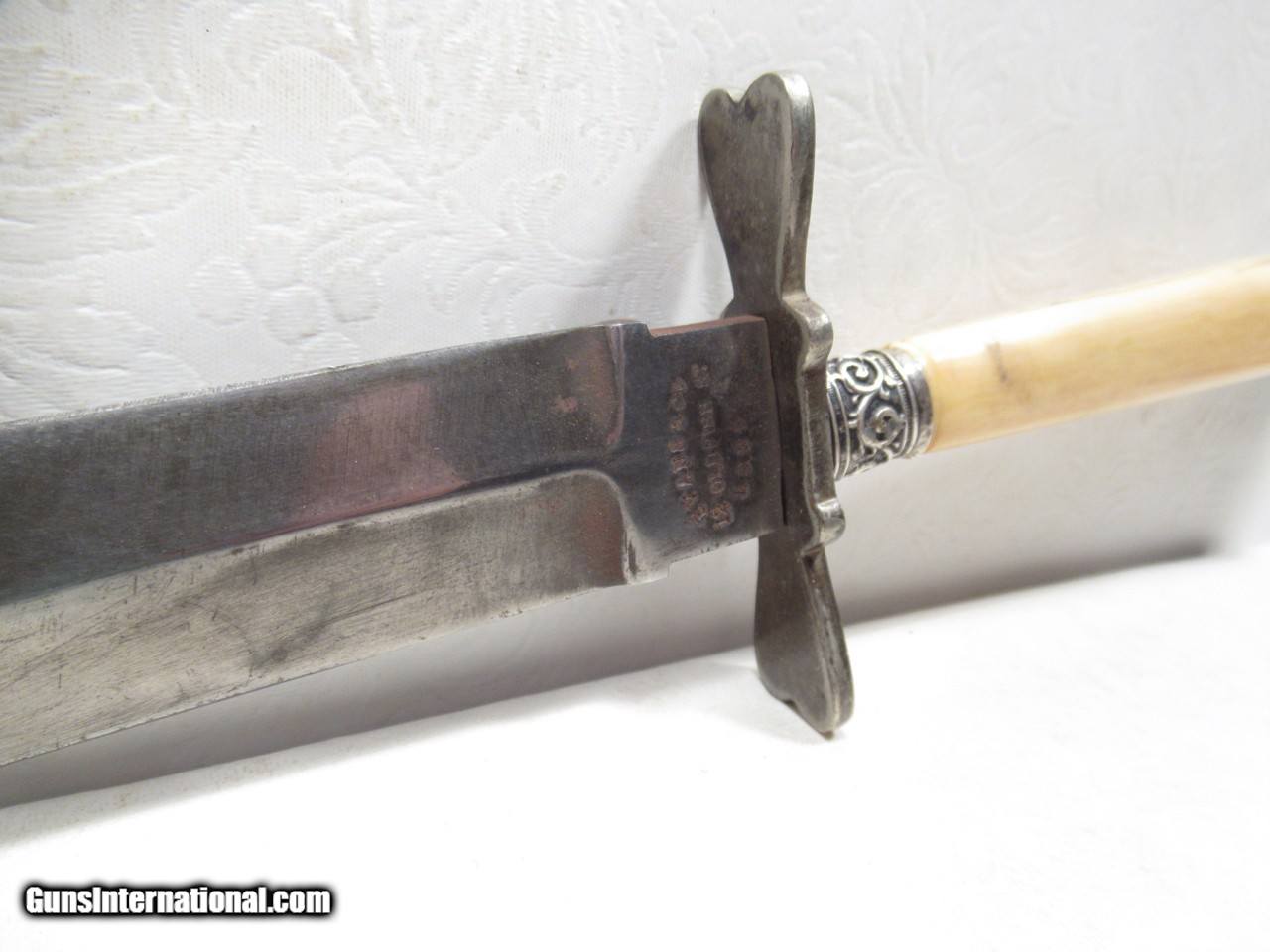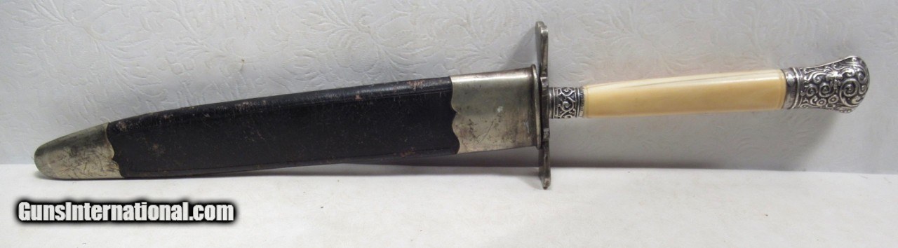 Description: Double-Edged Bowie Style Side Knife; 8 ¾” Blade Marked “Evans & Co. – 12 Old Fish St. – London”; Ivory Handle with Sheath; 14 ¾” L.O.A.; Unknown Age; See All Photos for Condition; No Texts; Call (254)541-5765 or Email Only; PERSONAL PROPERTY of Harold Wieser; NOTICE: We Do Not Do Any Consignments - All Items Listed are Owned by Us - NO SALES to New Jersey or New York City - Antiques Only to Massachusetts and California; Price: $1,275 + $45 S&H Sold as is - No Returns; Payment Address: Harold Wieser - 1466 U.S. Hwy 77 - Rosebud, TX 76570; SEND PAYMENTS VIA USPS PRIORITY MAIL; BEWARE of SCAMS!!! – DO NOT SEND MONEY or CORRESPONDENTS ELECTRONICALLY UNLESS YOU HAVE SPOKEN to HAROLD WIESER FIRST! 254-541-5765 SOLD |