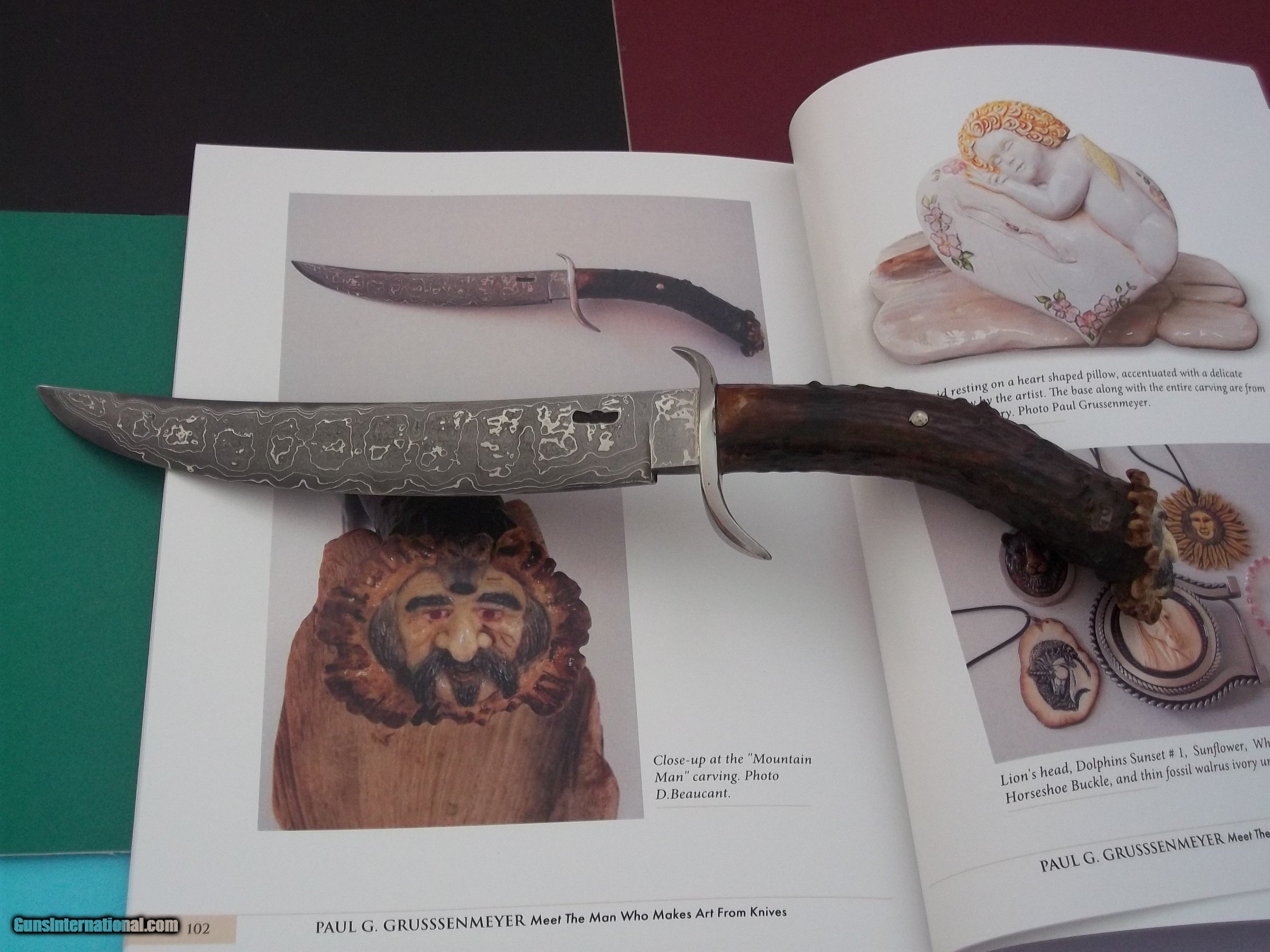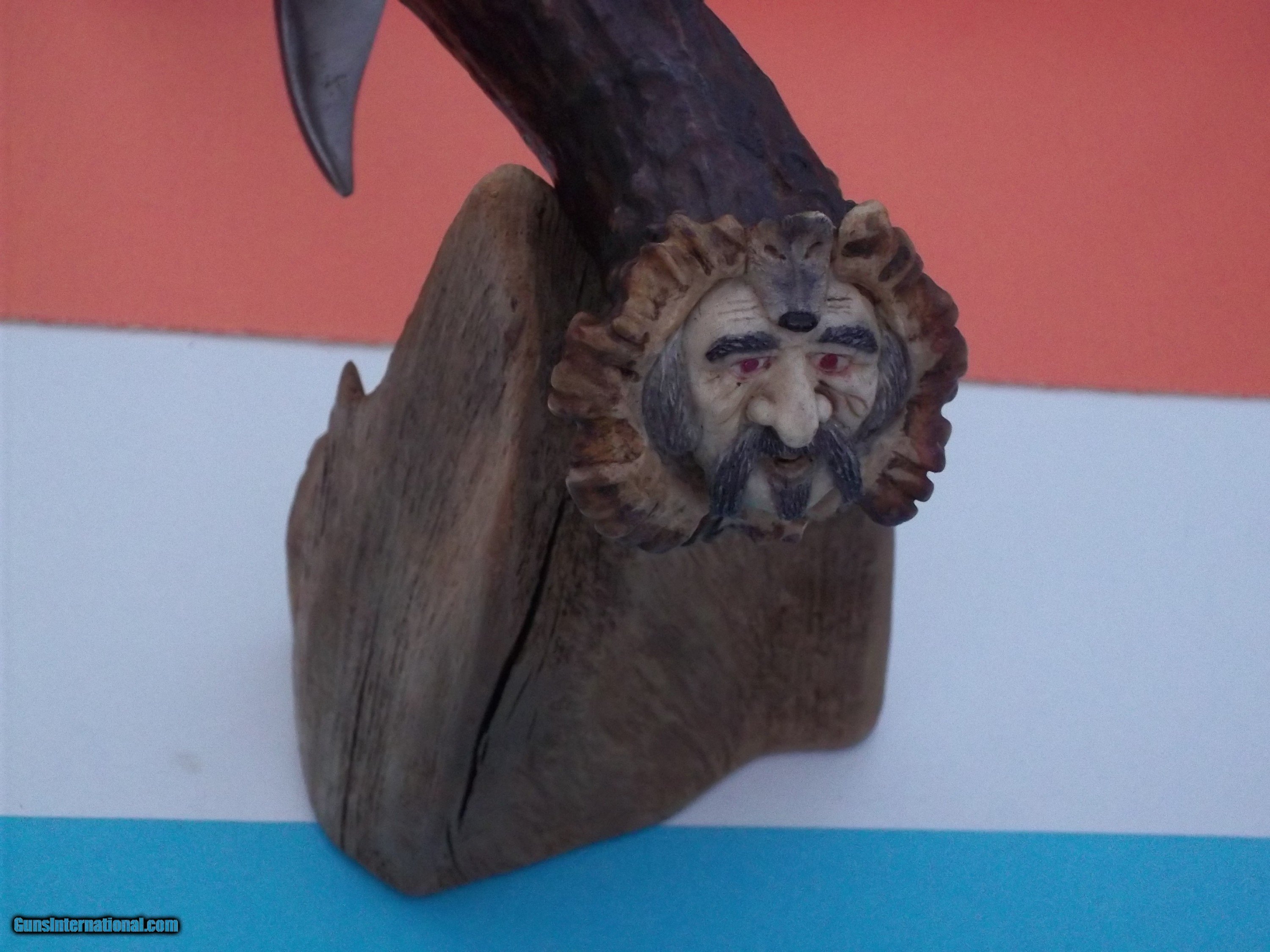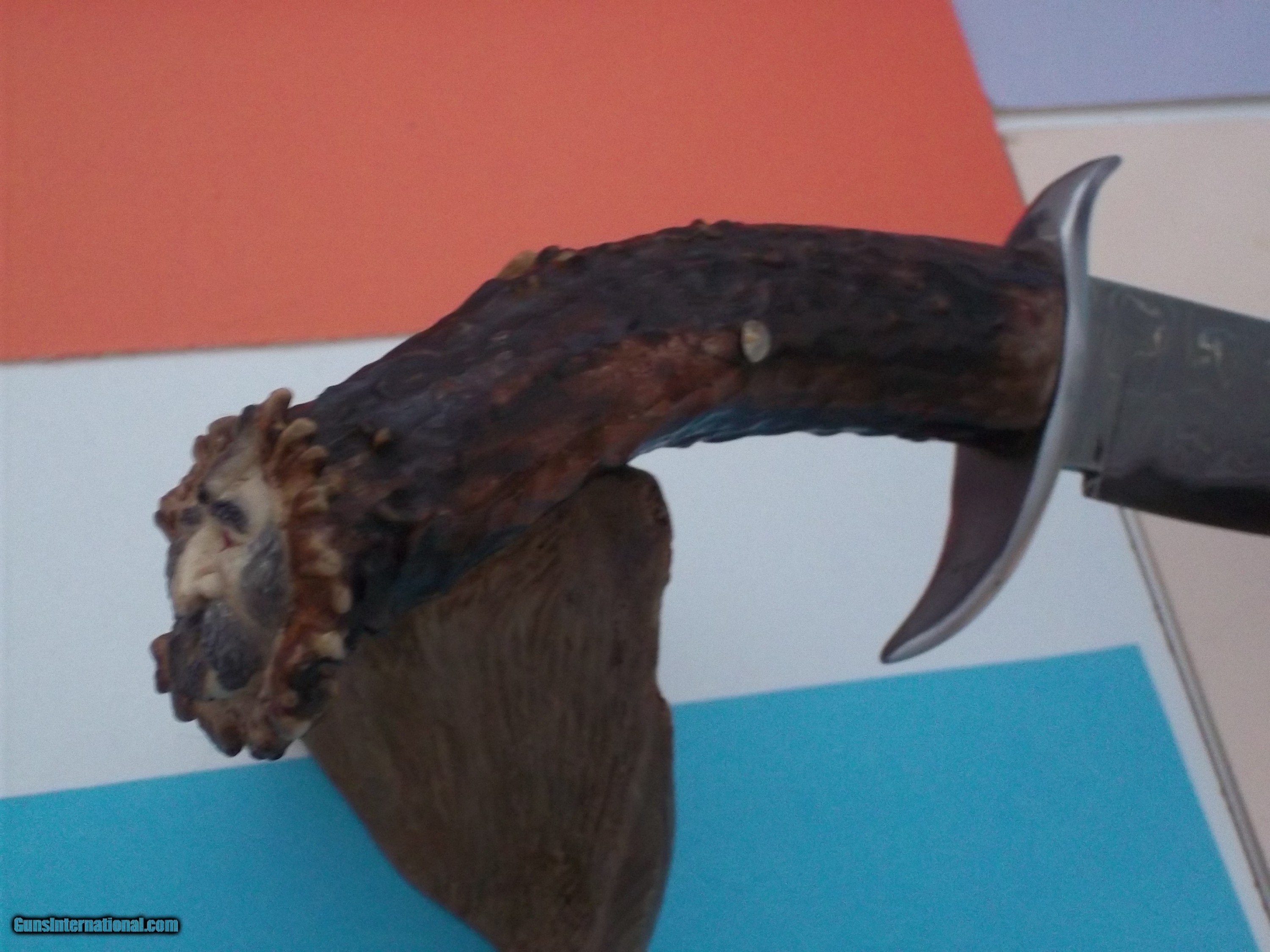 Description: Chuck Patrick "Jethro" 8-1/8" by 1-1/4" Damascus Bowie, unique large "S" shaped iron guard, mule deer crown handle with ruby eyes carved by Paul G. Grussenmeyer with a "Mountain Man" theme. as seen in the Collector's book about Grussenmeyer. Free shipping USPS with tracking # and signature required. No trade. Sold "AS IS". All sales are final. SOLD |