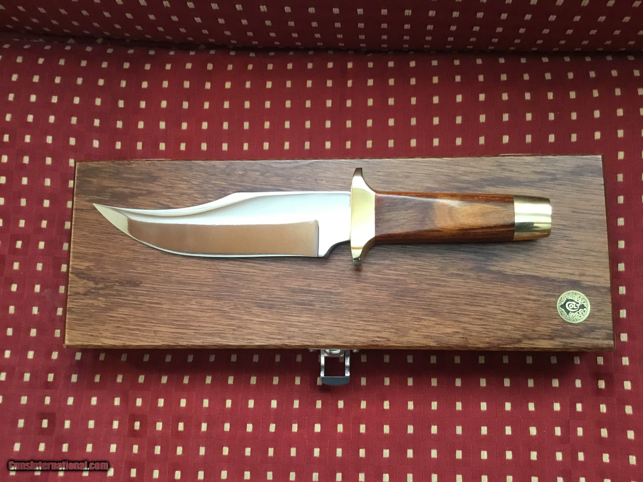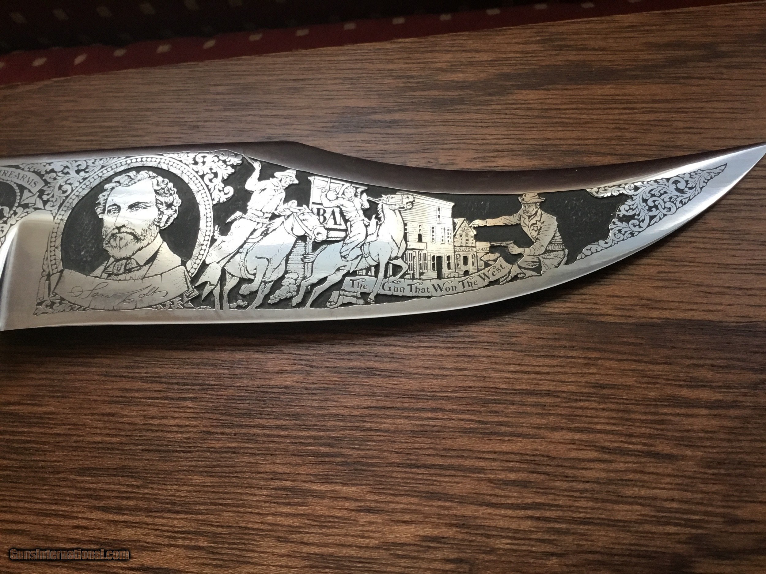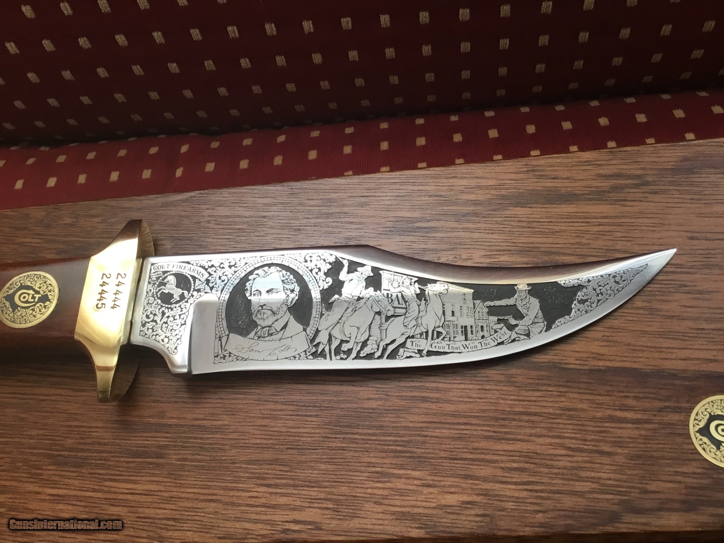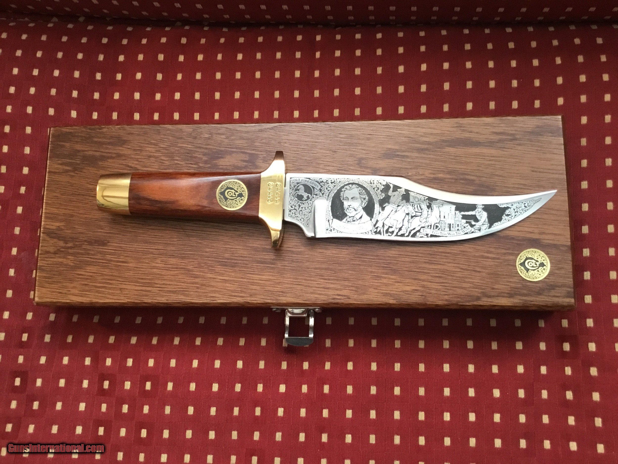 Description: ***PRICE REDUCEDColt limited edition Bowie knife, vintage 1977 commemerating the Colt Peacemaker "The Gun That Won The West". Made by Schrade for Colt with 6.5" 440C blade and beautiful etching by Aurum. Rosewood handle accented with brass fittings and Colt medallion. Original wood display case with red velvet interior and brass Colt medallion. In new never used condition. Shipping $25. SOLD |