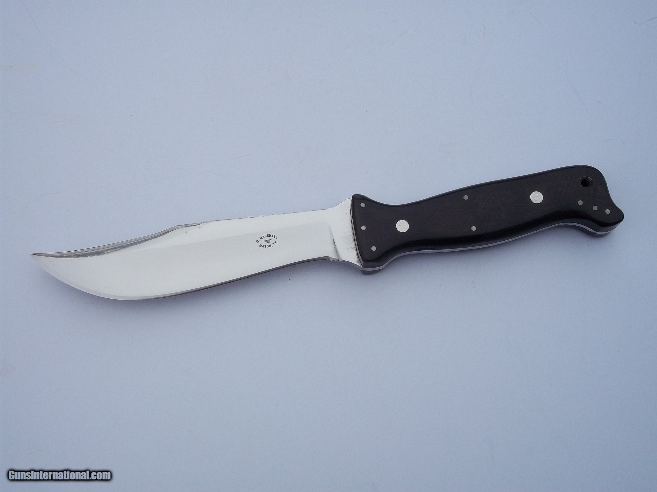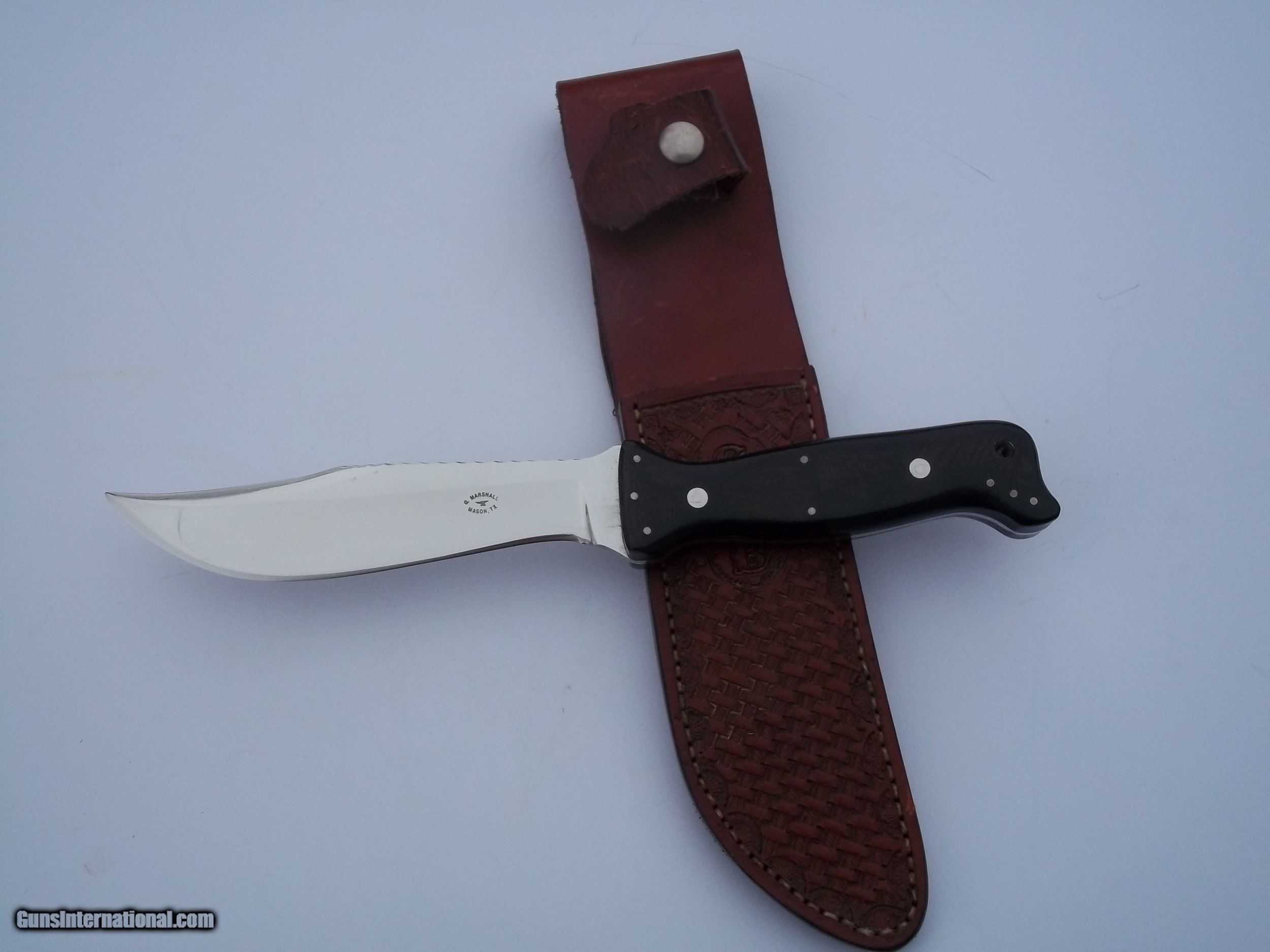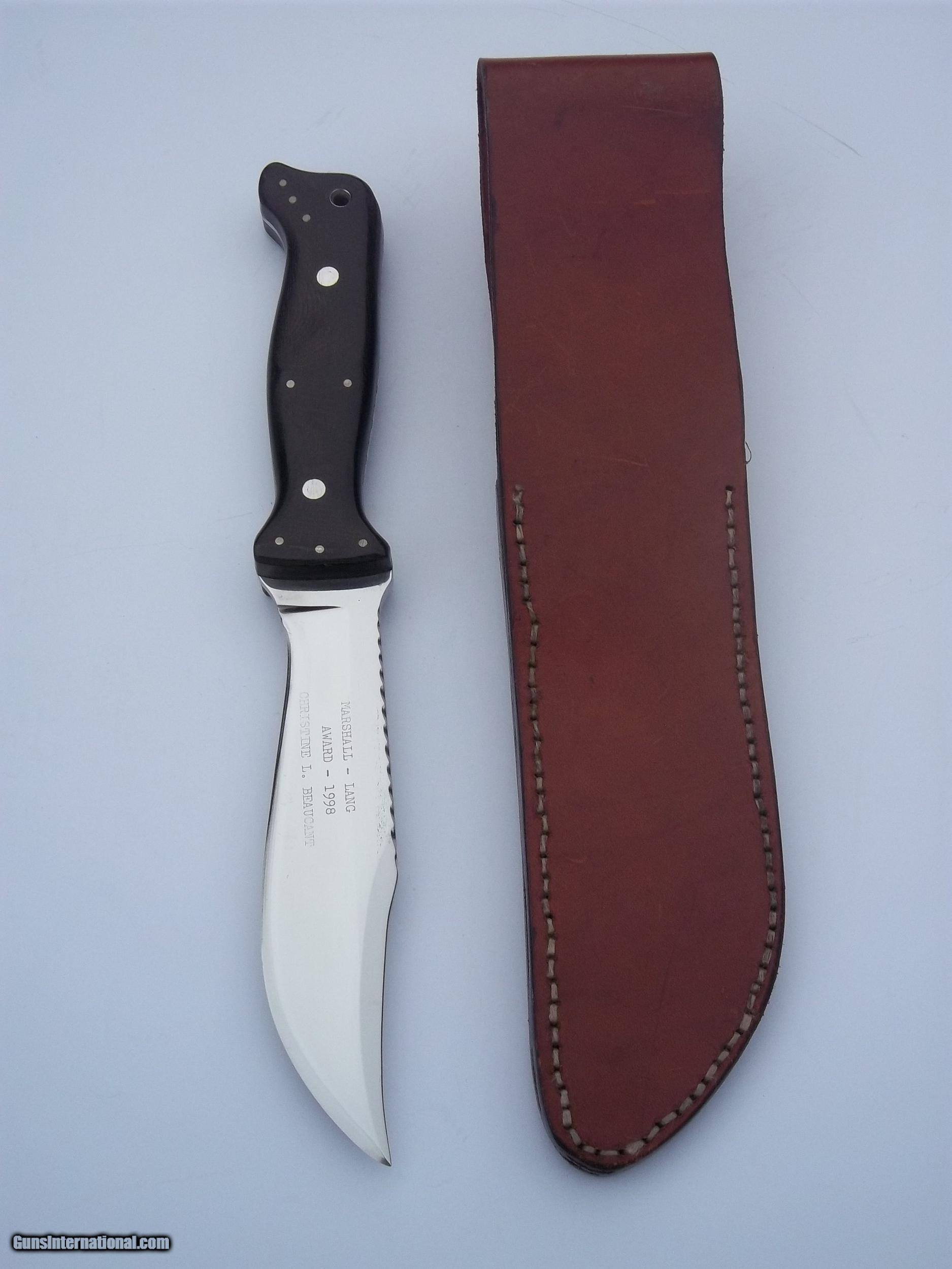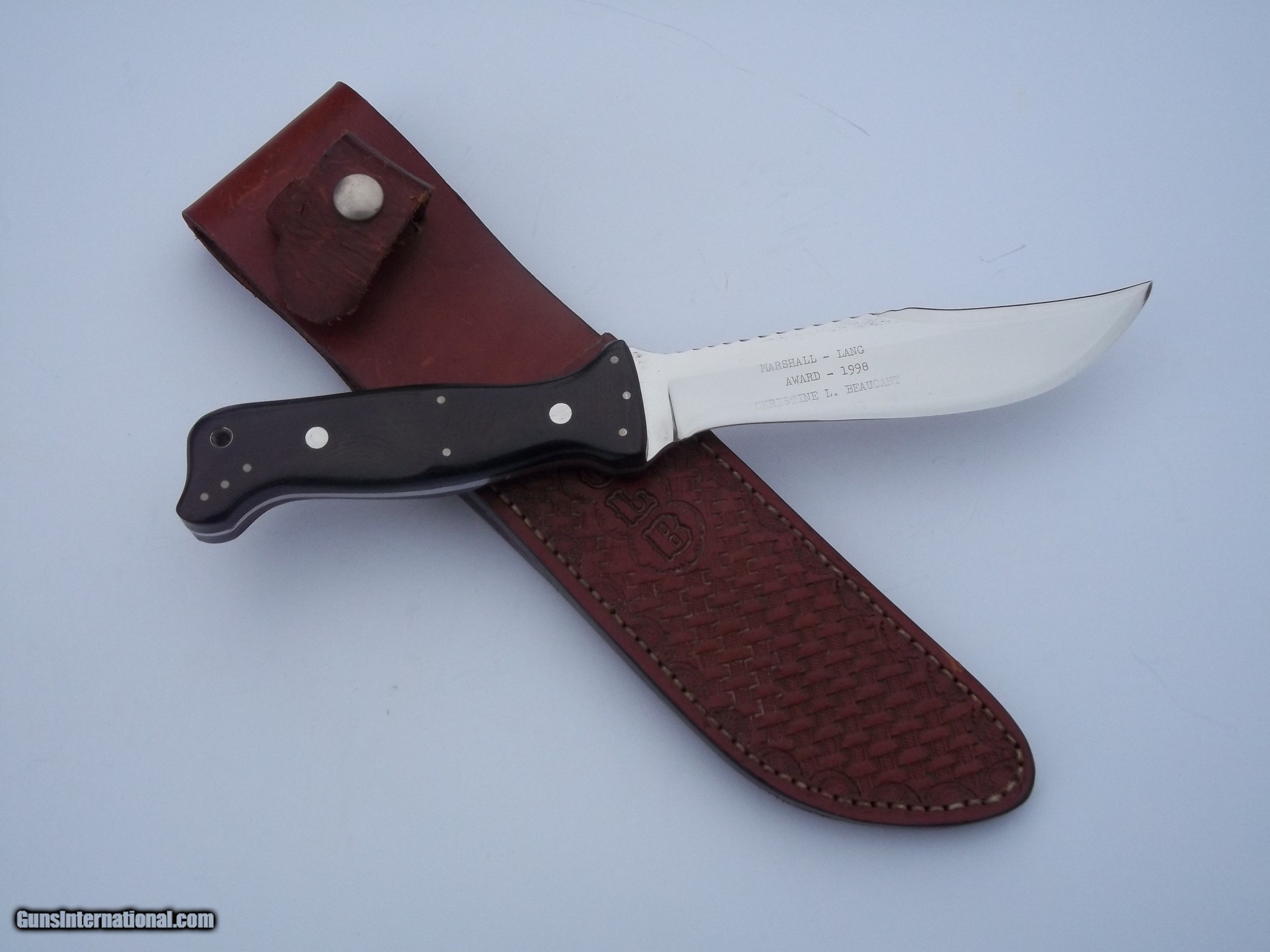 Description: Scaled down version of Glen Marshall renowned A.F.F.S. Camp Survival model. This particular knife is a Special Marshall-Lang Award 1998 produced piece from D2 steel, bcal micarta handle, fancy file work on knife's spine. Unique basket weave tooled high quality leather scabbard with C.L.B. carved in front of the sheath. FRee shipping USPS Priority Mail with tracking # in the US only. As will all listed knives SOLD AS IS. SOLD |