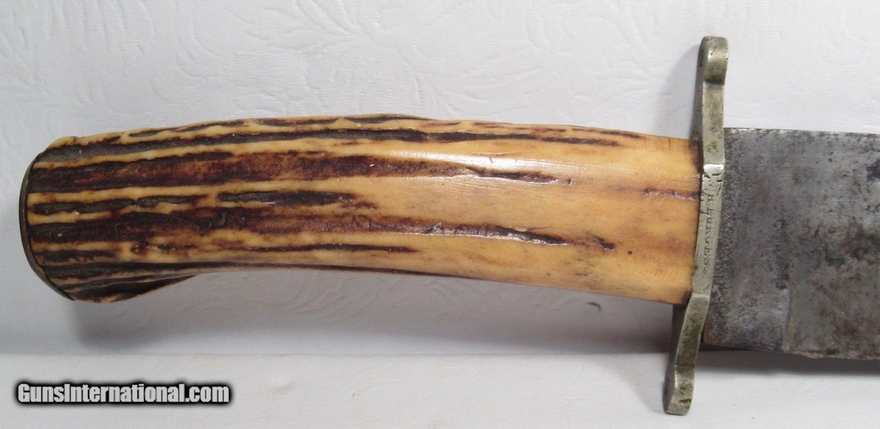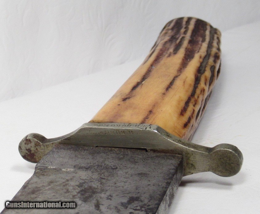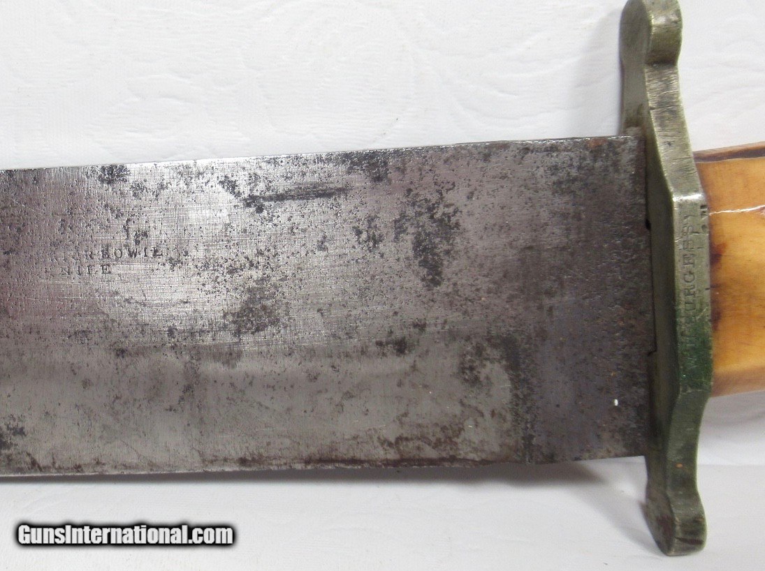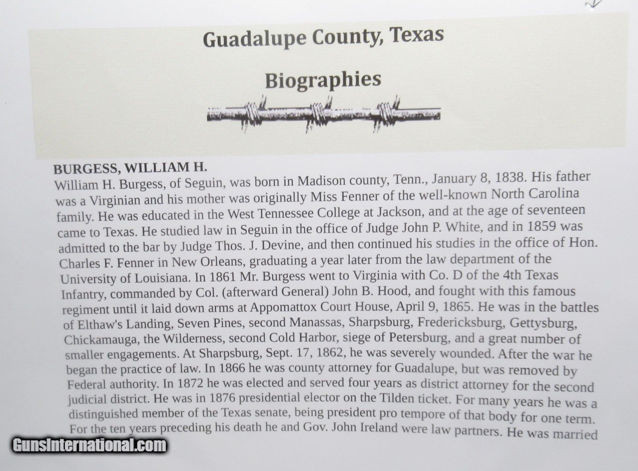 Description: English Bowie Knife Identified to Texas Confederate Solider; Marshes & Shepherd—Ponds Works-Sheffield “Superior Bowie Knife” Circa 1830-1890’s; Huge Bowie with Very Thick Blade just under 11 ¾” —17-7/8” L.O.A.; Guard Marked ‘W.H. Burgess’ on Both Sides; William H. Burgess of Seguin, Texas Served in Confederate Army in ‘Co. D’ of the 4th Texas Infantry, Hood’s Regiment; Wounded Severely at Sharpsburg 1862; Considerable Documented History Included; Condition of Bowie is very used with markings very weak; handle replaced long ago; leather sheath replaced long ago; Still has Original Hardware; Very Large, Rare and Well Documented Bowie; Provenance Compton La Beau/Mike Heskett; See All Photos for Condition; No Texts; Call (254)541-5765 or Email Only; PERSONAL PROPERTY of Harold Wieser; Price: $8,975 + $45 S&H Via USPS PRIORITY MAIL; Payment Address: Harold Wieser - 1466 U.S. Hwy 77 - Rosebud, TX 76570; SEND PAYMENTS VIA USPS PRIORITY MAIL; BEWARE of SCAMS!!! – DO NOT SEND MONEY or CORRESPONDENTS ELECTRONICALLY UNLESS YOU HAVE SPOKEN to HAROLD WIESER FIRST! 254-541-5765 SOLD |