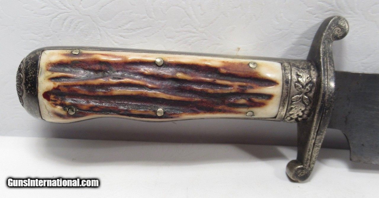 Description: Large Heavy Bowie Knife Made by J. Gill, Percy Street London; 10 ¼” Very Heavy Clip Point Blade; Full ¼” Thick; 15 ¾” L.O.A.; Weighs 2 lbs.; Stag Horn Scales Attached by Rivets; Ricasso Marked “J. Gill, Percy Street”; This Fine Bowie Dates to 1855-1860 and is Illustrated on Page 25 (#23) of “A Sure Defence – The Bowie Knife Book” by Kenneth H. Burton; From the Buddy King, Canadian, Texas Collection; PERSONAL PROPERTY of Harold Wieser; Price: $7,450 + $30 S&H; Price includes insured shipping; return policy: three days inspection from the date the item is received; full refund of shipping both ways ONLY IF THE ITEM IS MISREPRESENTED. SOLD |