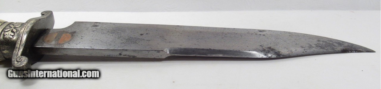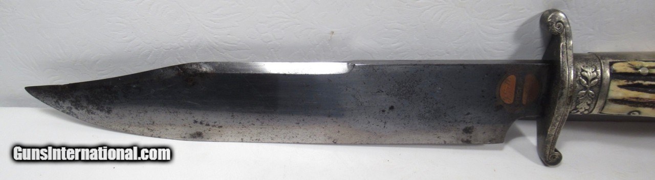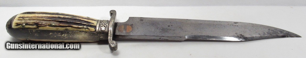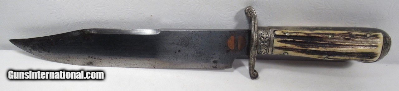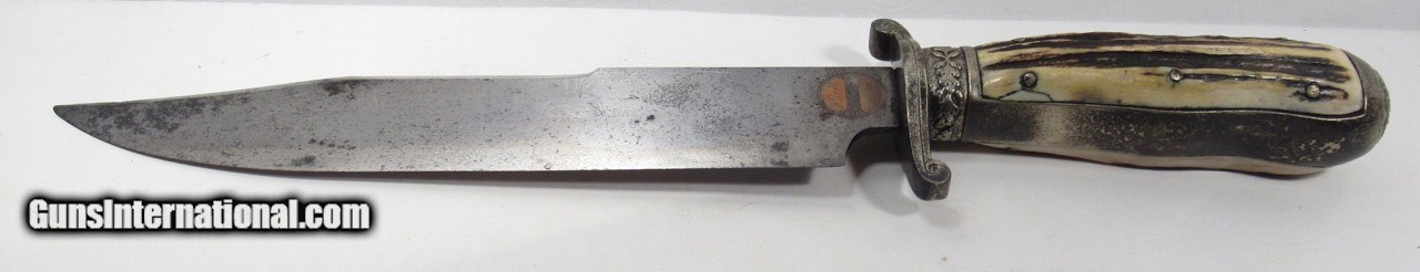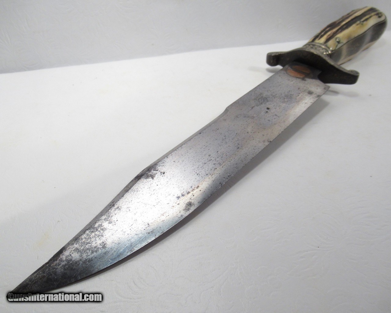 Description: Large Heavy Bowie Knife Made by J. Gill, Percy Street London; 10 ¼” Very Heavy Clip Point Blade; Full ¼” Thick; 15 ¾” L.O.A.; Weighs 2 lbs.; Stag Horn Scales Attached by Rivets; Ricasso Marked “J. Gill, Percy Street”; This Fine Bowie Dates to 1855-1860 and is Illustrated on Page 25 (#23) of “A Sure Defence – The Bowie Knife Book” by Kenneth H. Burton; From the Buddy King, Canadian, Texas Collection; See All Photos for Condition; No Texts; Call (254)541-5765 or Email Only; PERSONAL PROPERTY of Harold Wieser; Price: $5,975 + $45 S&H Via USPS PRIORITY MAIL; Payment Address: Harold Wieser - 1466 U.S. Hwy 77 - Rosebud, TX 76570; SEND PAYMENTS VIA USPS PRIORITY MAIL; BEWARE of SCAMS!!! – DO NOT SEND MONEY or CORRESPONDENTS ELECTRONICALLY UNLESS YOU HAVE SPOKEN to HAROLD WIESER FIRST! 254-541-5765 SOLD |