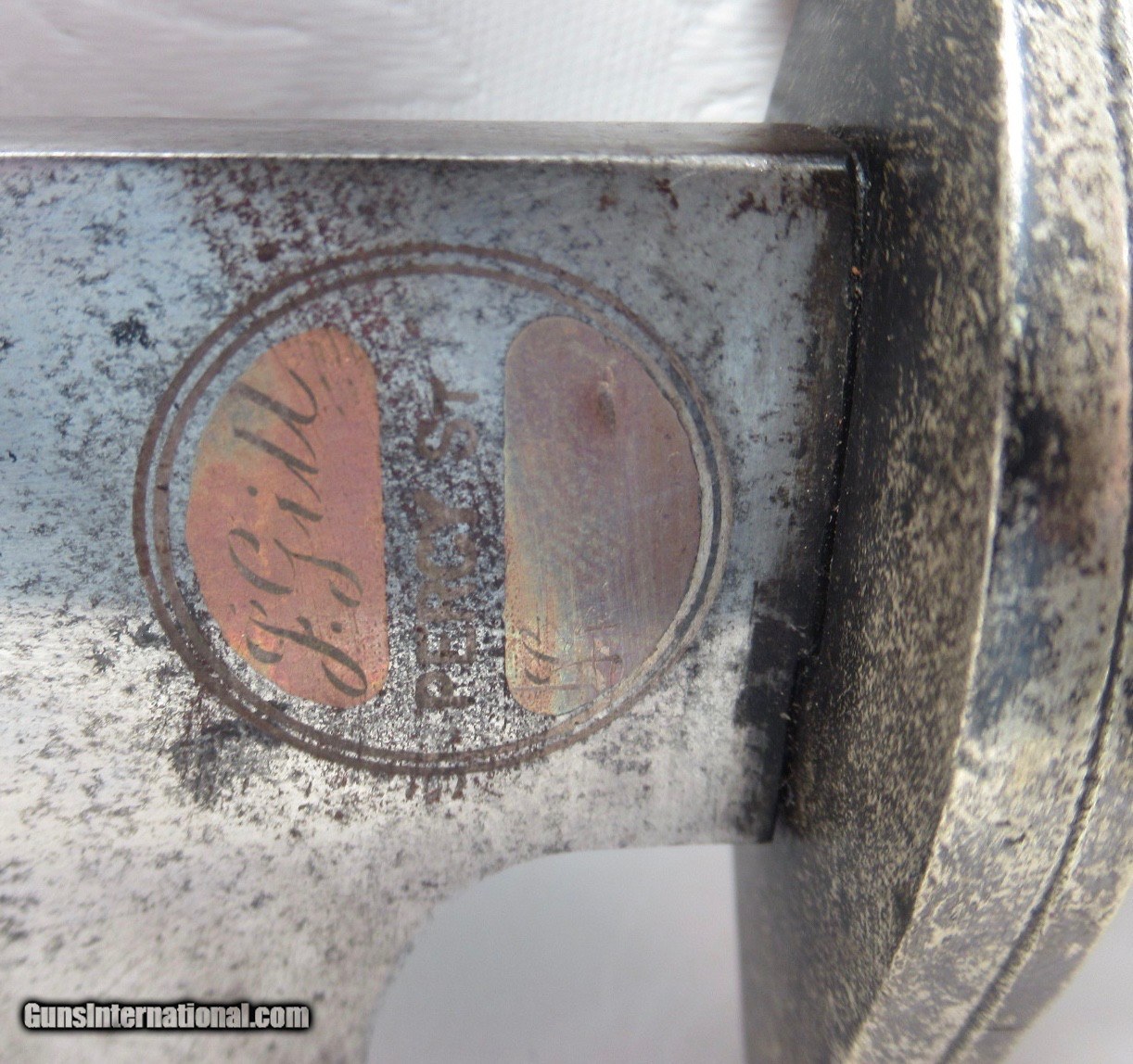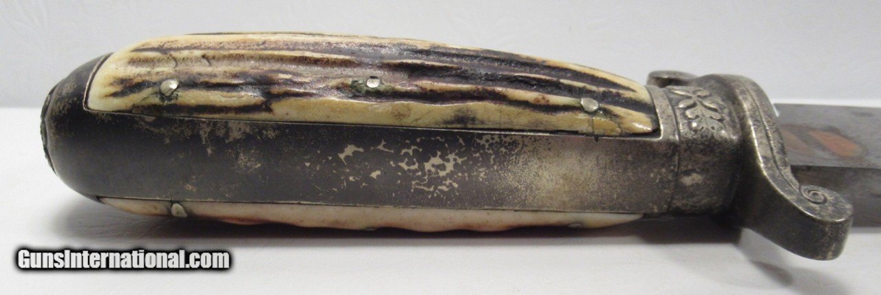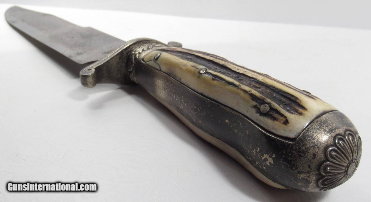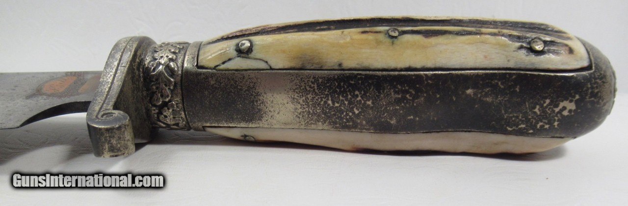 Description: Large Heavy Bowie Knife Made by J. Gill, Percy Street London; 10 ¼” Very Heavy Clip Point Blade; Full ¼” Thick; 15 ¾” L.O.A.; Weighs 2 lbs.; Stag Horn Scales Attached by Rivets; Ricasso Marked “J. Gill, Percy Street”; This Fine Bowie Dates to 1855-1860 and is Illustrated on Page 25 (#23) of “A Sure Defence – The Bowie Knife Book” by Kenneth H. Burton; From the Buddy King, Canadian, Texas Collection; See All Photos for Condition; No Texts; Call (254)541-5765 or Email Only; PERSONAL PROPERTY of Harold Wieser; Price: $5,975 + $45 S&H Via USPS PRIORITY MAIL; Payment Address: Harold Wieser - 1466 U.S. Hwy 77 - Rosebud, TX 76570; SEND PAYMENTS VIA USPS PRIORITY MAIL; BEWARE of SCAMS!!! – DO NOT SEND MONEY or CORRESPONDENTS ELECTRONICALLY UNLESS YOU HAVE SPOKEN to HAROLD WIESER FIRST! 254-541-5765 SOLD |