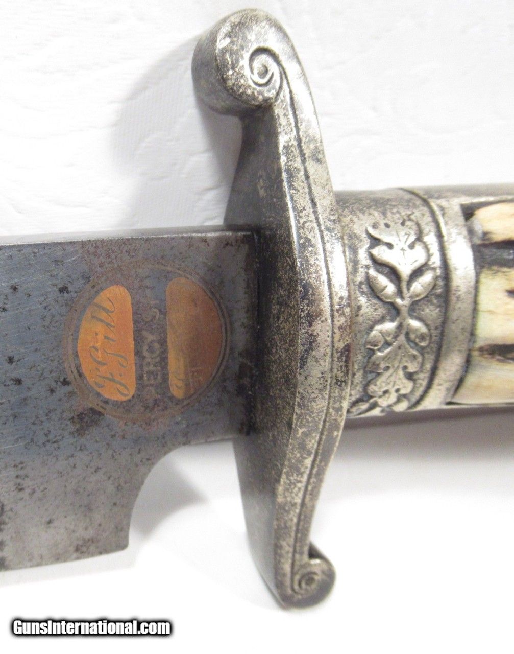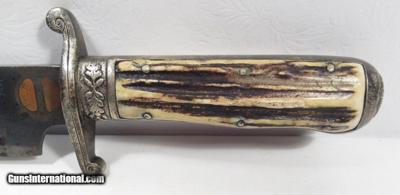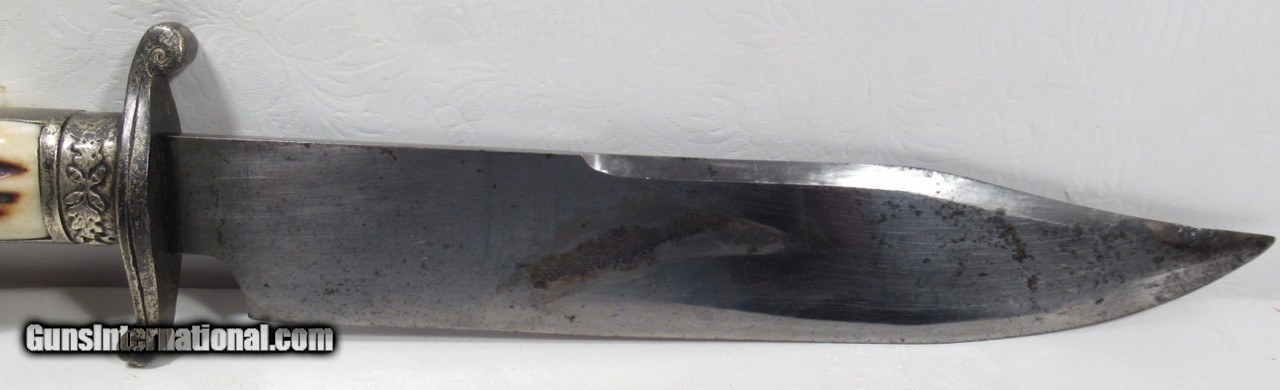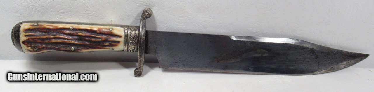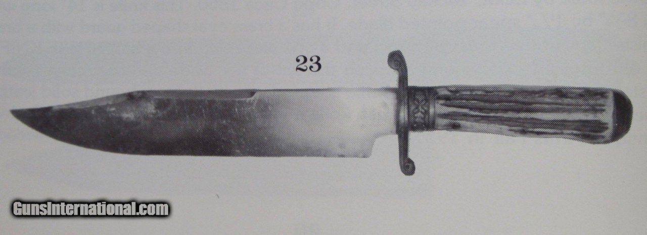Description: Large Heavy Bowie Knife Made by J. Gill, Percy Street London; 10 ¼” Very Heavy Clip Point Blade; Full ¼” Thick; 15 ¾” L.O.A.; Weighs 2 lbs.; Stag Horn Scales Attached by Rivets; Ricasso Marked “J. Gill, Percy Street”; This Fine Bowie Dates to 1855-1860 and is Illustrated on Page 25 (#23) of “A Sure Defence – The Bowie Knife Book” by Kenneth H. Burton; From the Buddy King, Canadian, Texas Collection; See All Photos for Condition; No Texts; Call (254)541-5765 or Email Only; PERSONAL PROPERTY of Harold Wieser; Price: $4,975 + $45 S&H Via USPS PRIORITY MAIL; Payment Address: Harold Wieser - 1466 U.S. Hwy 77 - Rosebud, TX 76570; SEND PAYMENTS VIA USPS PRIORITY MAIL; BEWARE of SCAMS!!! – DO NOT SEND MONEY or CORRESPONDENTS ELECTRONICALLY UNLESS YOU HAVE SPOKEN to HAROLD WIESER FIRST! 254-541-5765 SOLD |