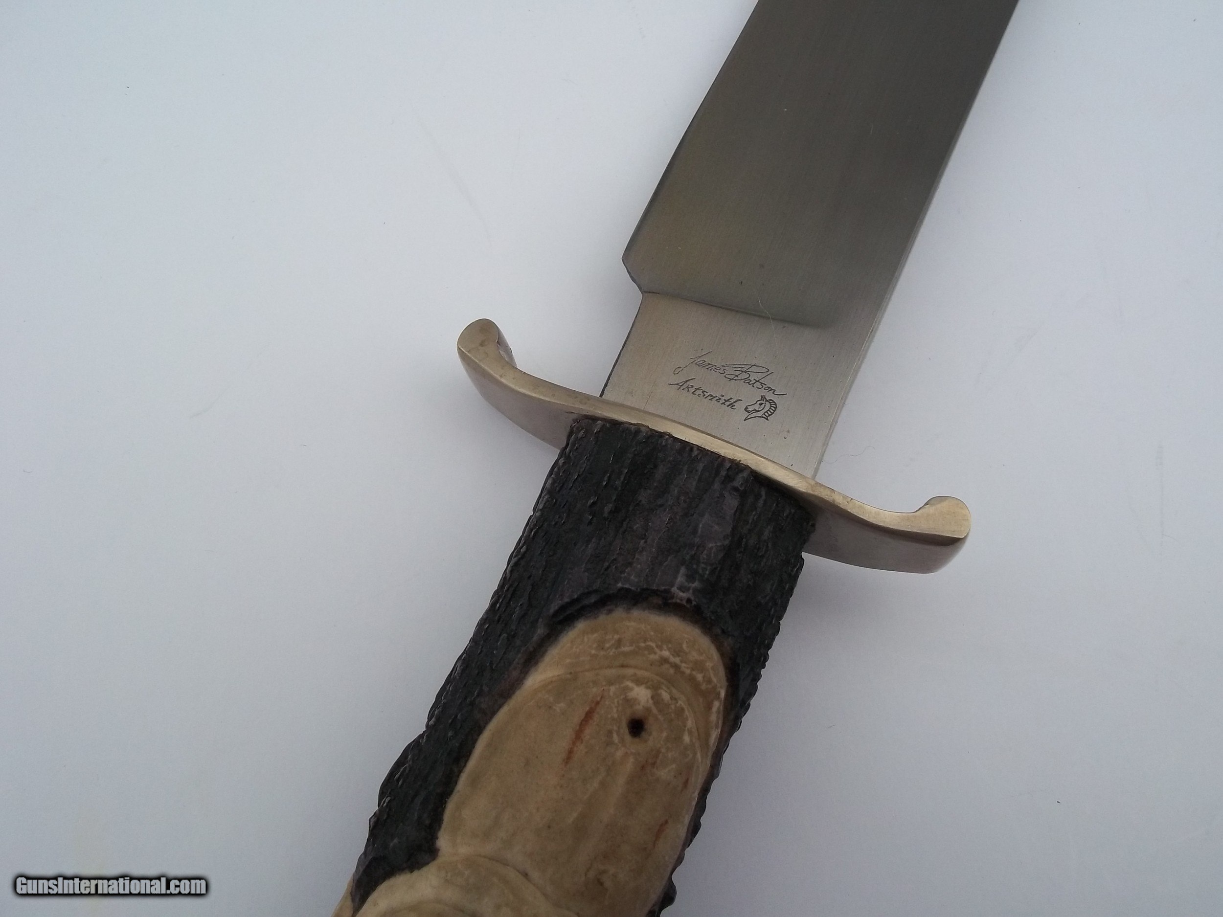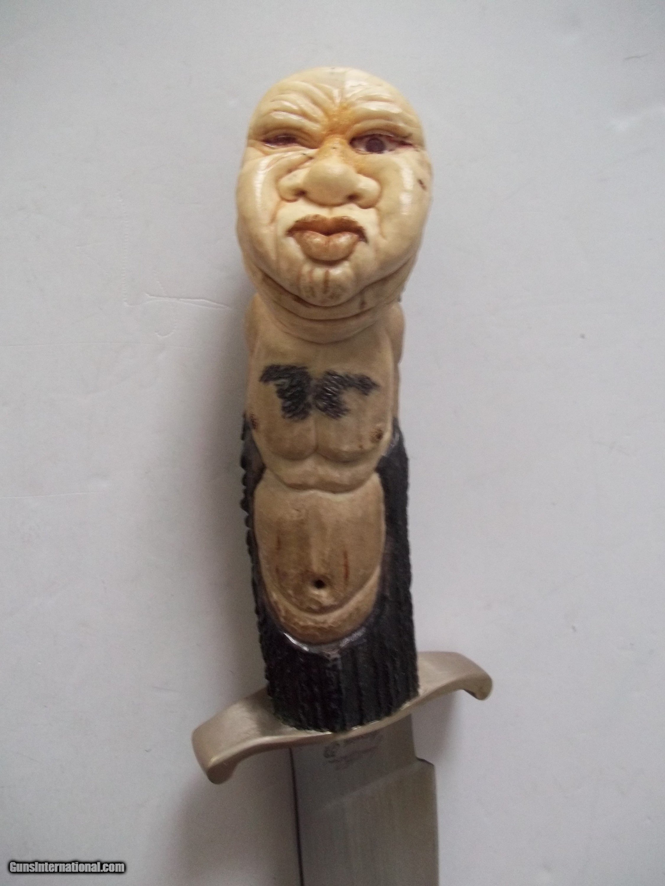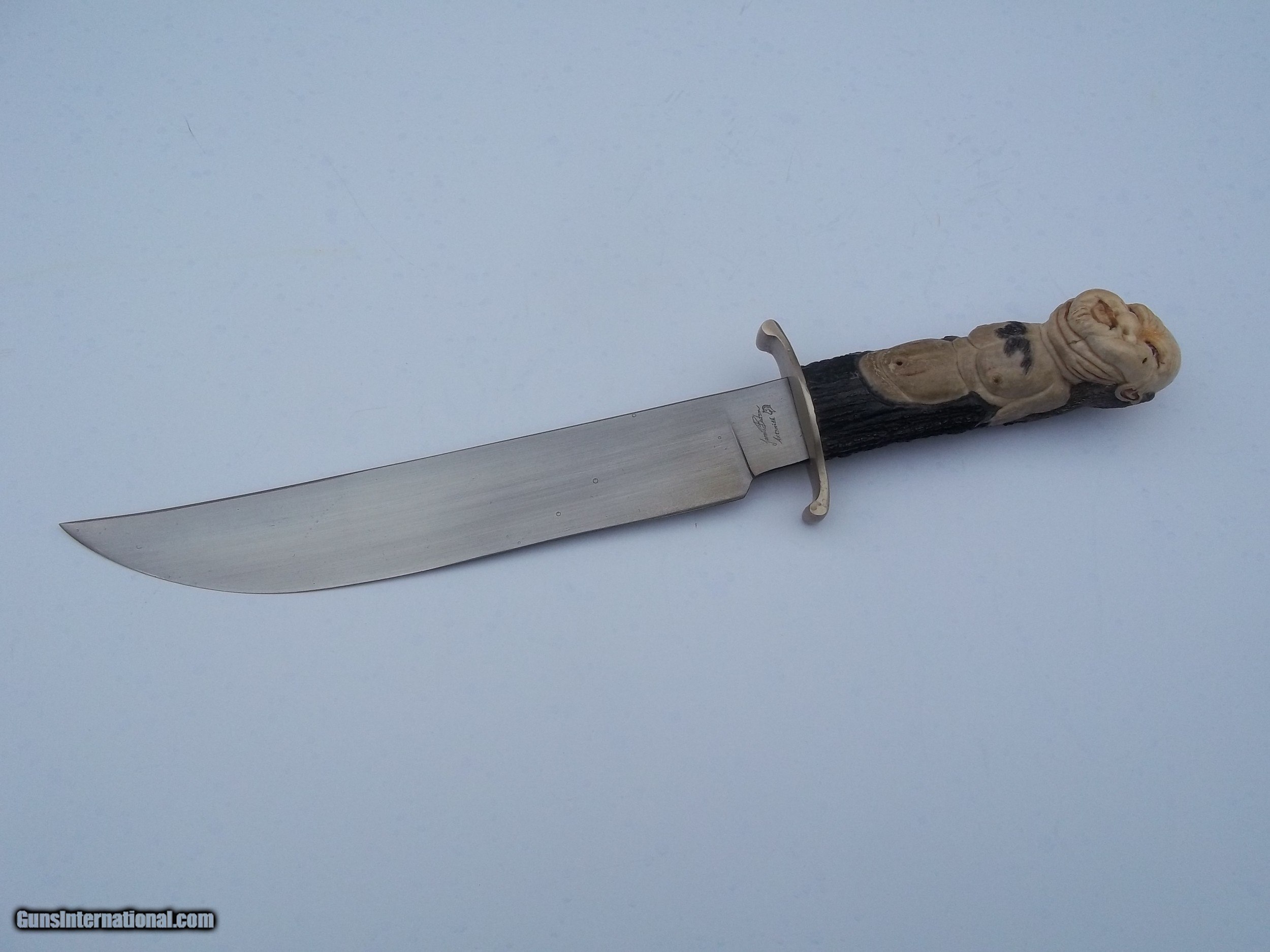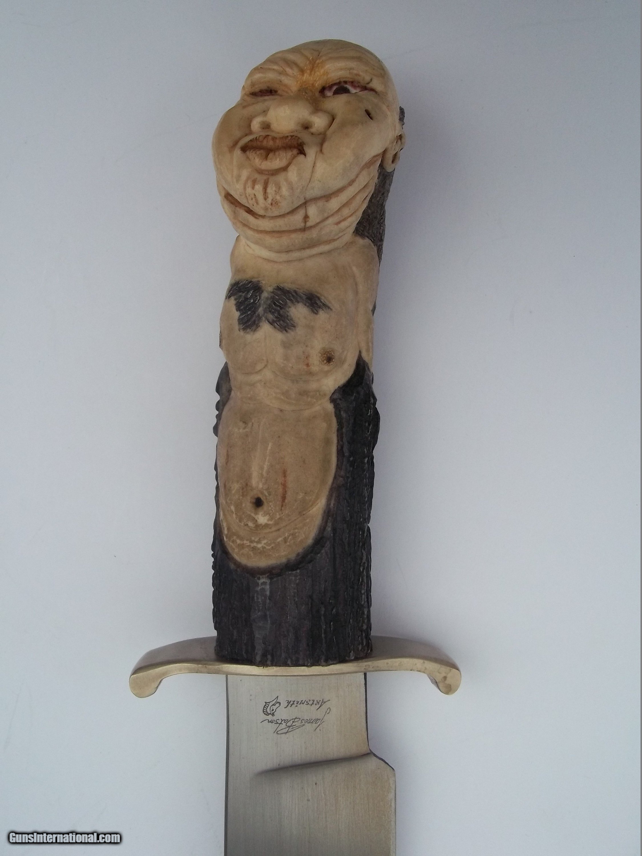 Description: "Goliath " knife : A masterpiece by James L. Batson,Jr. embellished and carved by Paul G. Grussenmeyer with oriental and ancient head. One of the most spectacular carving ever seen on a James Batson's knife from 1992. Blade is 11-1/4" by 1-5/8" at widest part , steel guard, overall is 17-1/4". Free shipping USPS Priority Mail with tracking #. SOLD |