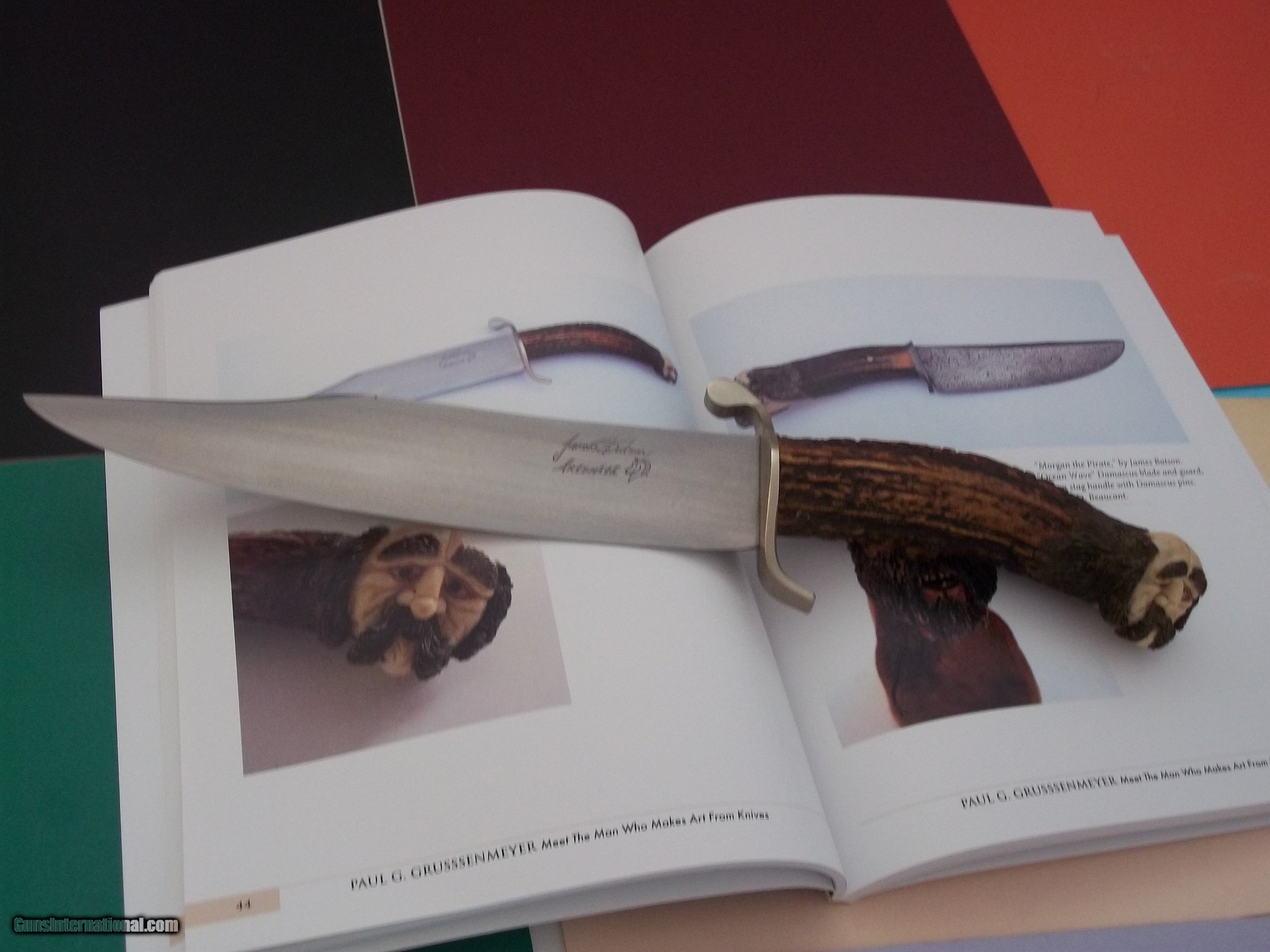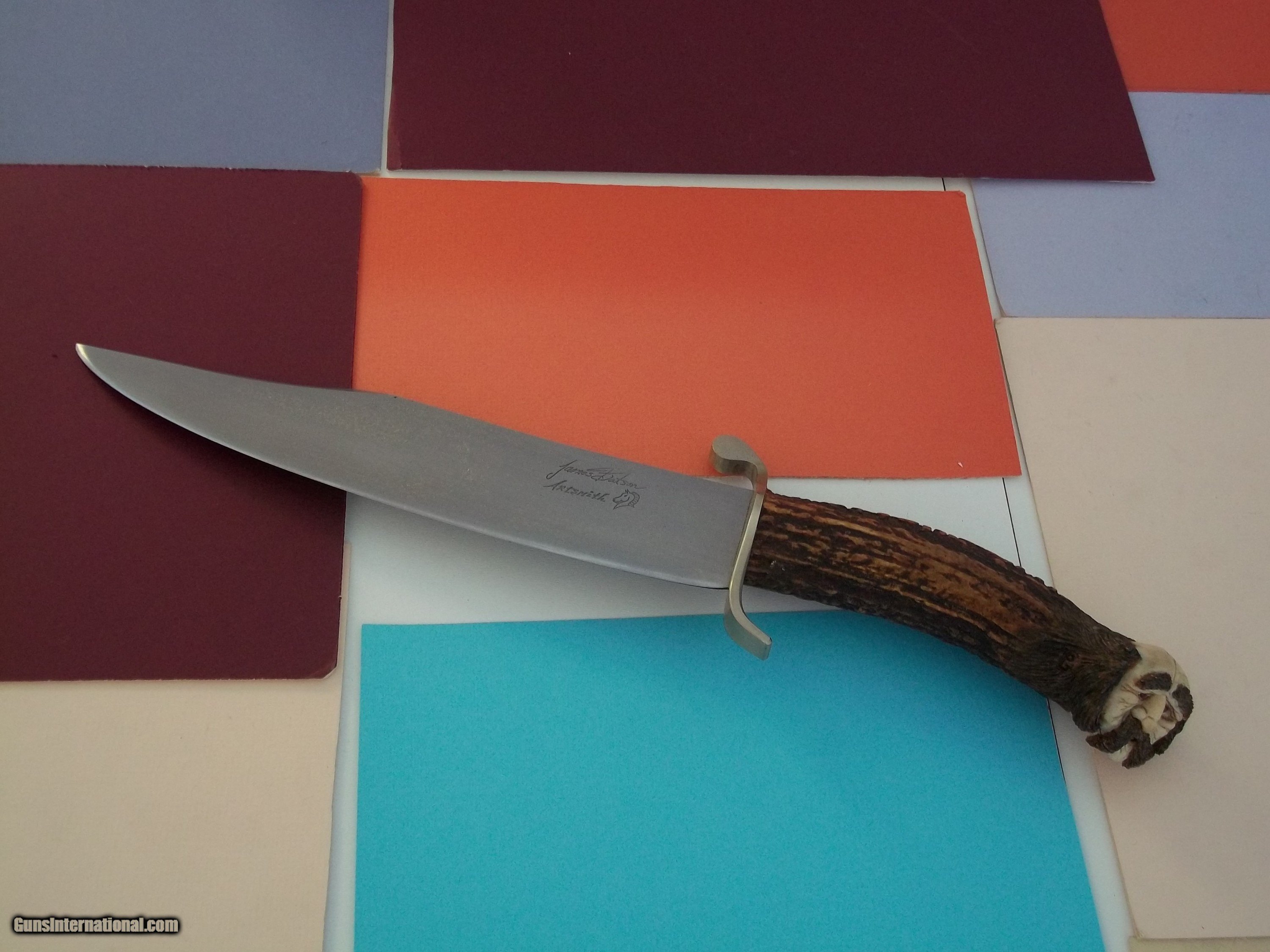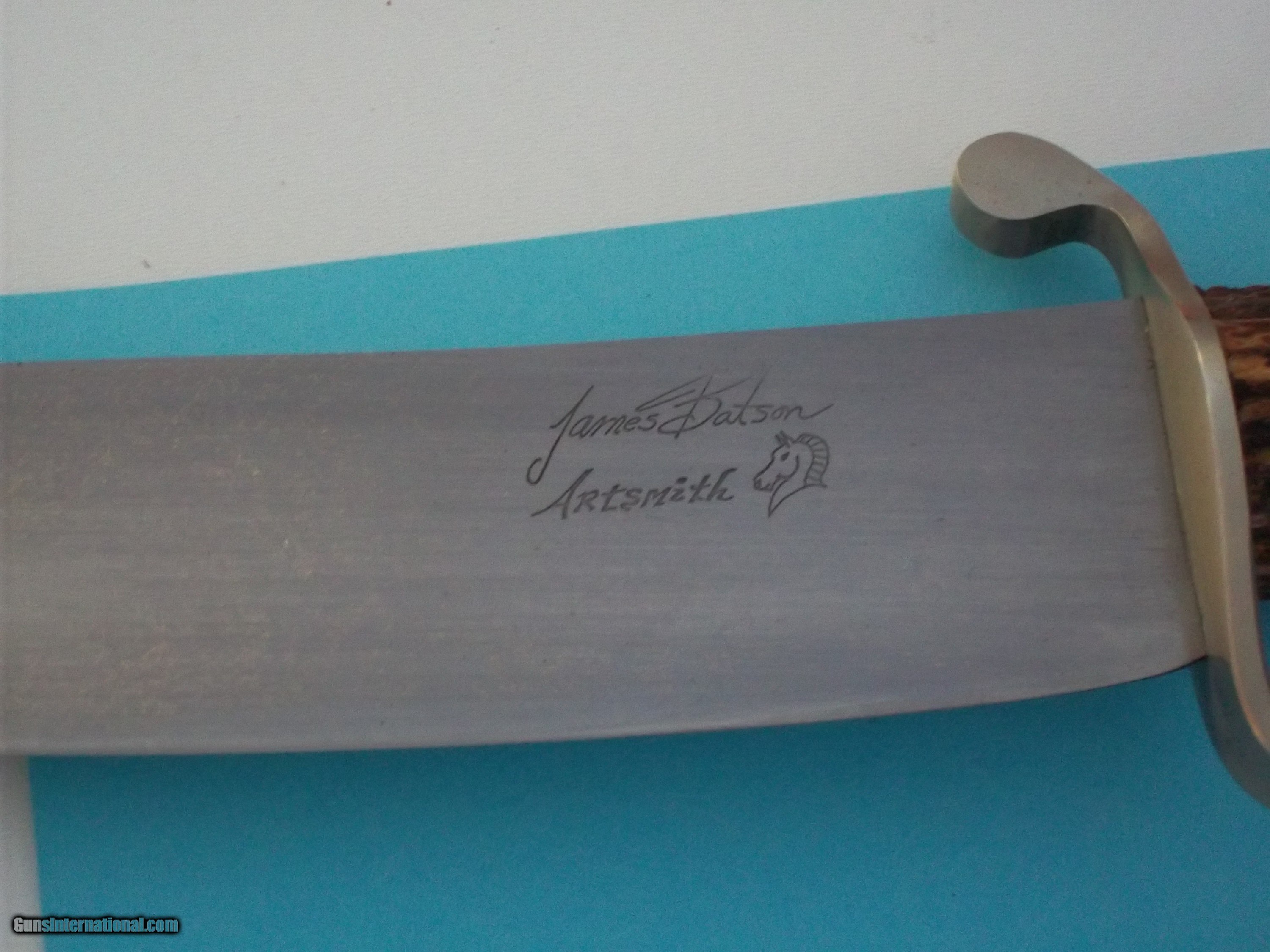 Description: James L. Batson,Jr. Southwestern Bowie carved "Mountain Man" by Paul G. Grussenmeyer, rare "S" iron guard with extended flat ball lugs, no sheath. One-of-a-kind knife from this extremely talented bladesmith (retired). Blade is 9-5/8" by 2" wide. No sheath was ever produced for that knife. Sold "AS IS." All sales are final. No return-no echange this applies to all the knives I am selling in all accounts. I do not engage in any type of trade. Free shipping USPS with tracking # and signature required. All of Batson'sknives are shown in the Special Limited Numbered Collector's book-only 24 copies were printed globally-there will be no reprint. SOLD |