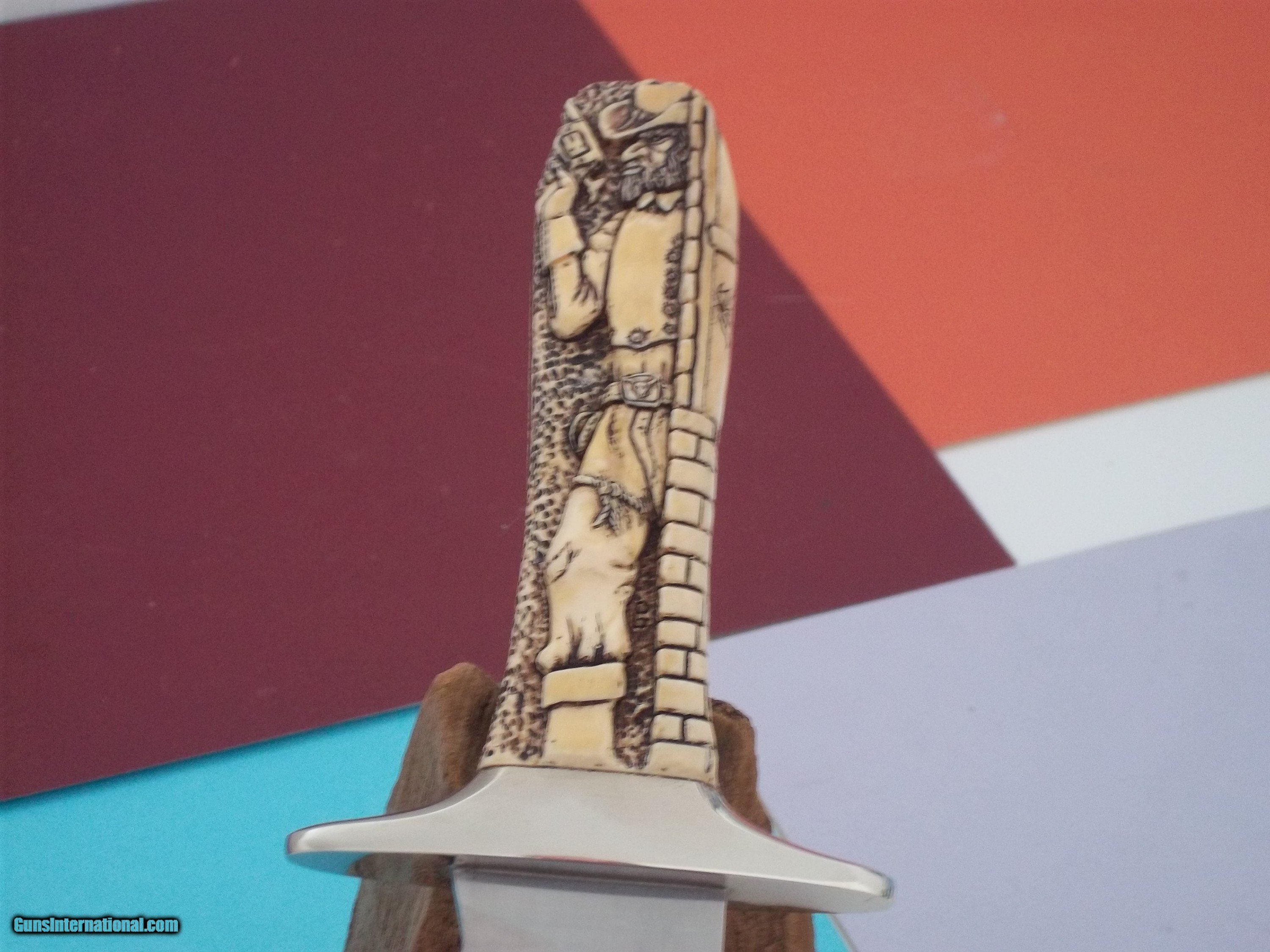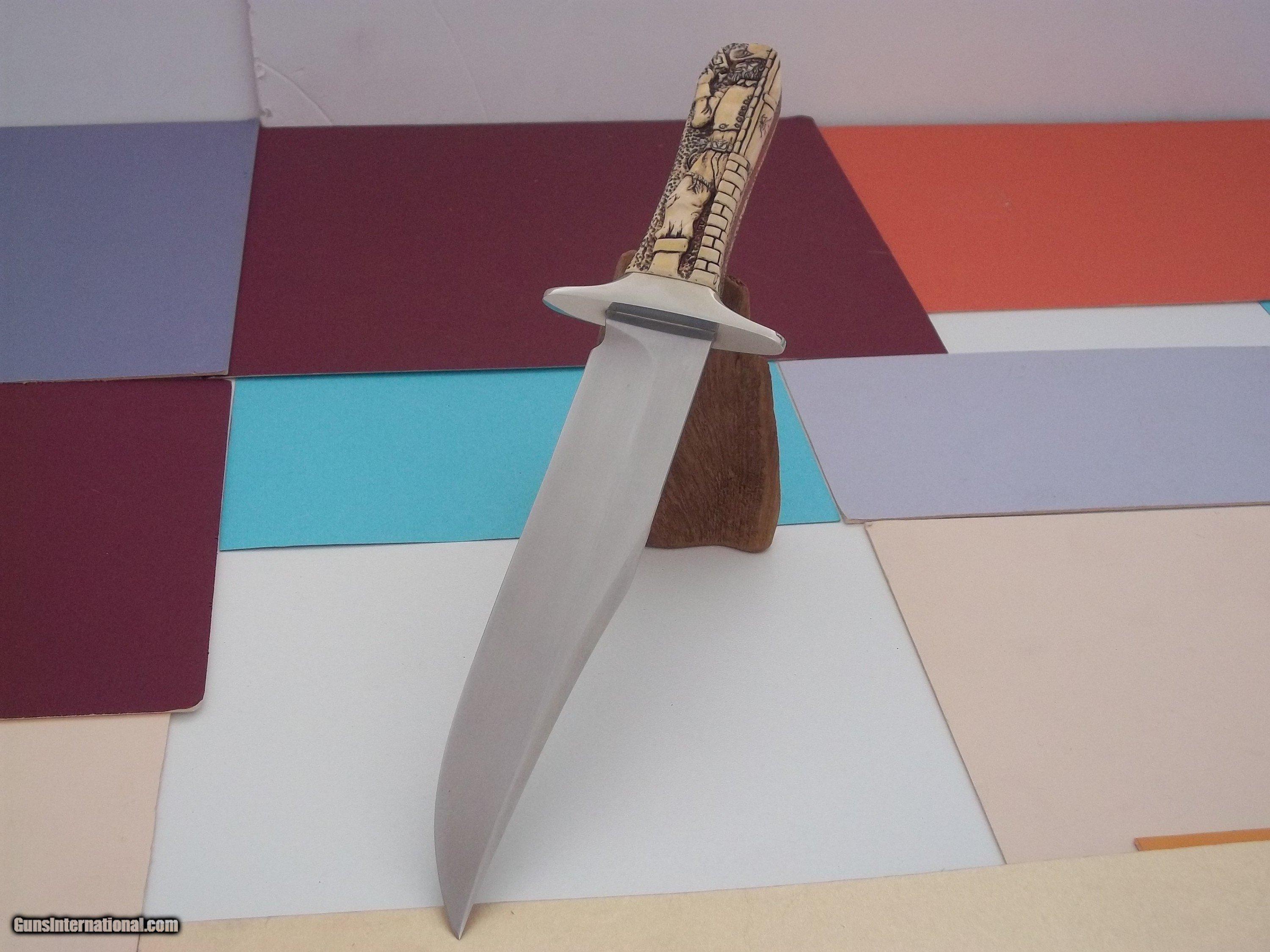 Description: Bowie knife by knifemaker extraordinaire Jim Siska called "Gunfighter & The Saloon Girl" masterfully carved by Paul G. Grussenmeyer as a one-of-a-kind piece never to be reproduced. It represents a double-sided carvings, this Bowie is actually a full tang constructed model, while its tang has been adorned with a delicate and light "hammering" motif which adds a touch of elegance to an already beautiful knife. Catalog on Grussenmeyer is included in the sale, rthe finest knief ever produced by this deceased maker. Free shipping USPS with tracking # and signature required. I do not engage in any type of trade. Thank you for looking. Sold "AS IS" and as a final sale SOLD |