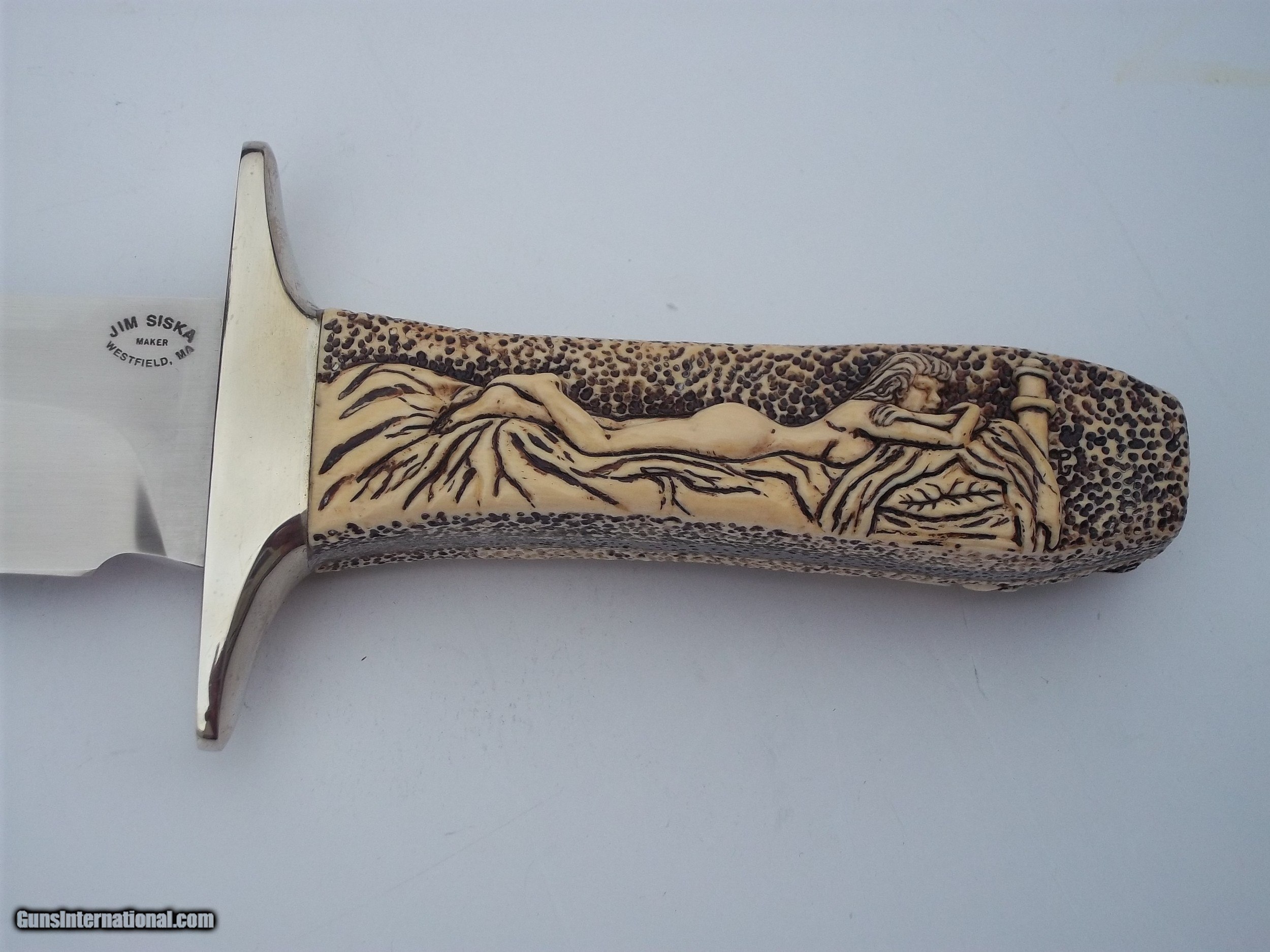 Description: Bowie knife by Jim Siska "Gunfighter & The Saloon Girl" masterfully carved by Paul G. Grussenmeyer as a one-of-a-kind piece never to be reproduced. It represents a double-sided carvings. This Bowie is actually a full tang constructed model, while its tang has been adorned with a delicate and light "hammering" motif which adds a touch of elegance to an already beautiful knife. Catalog on Grussenmeyer included. Free shipping USPS with tracking # and signature required. I do not engage in anytype of trade. Thank you for looking. SOLD |
