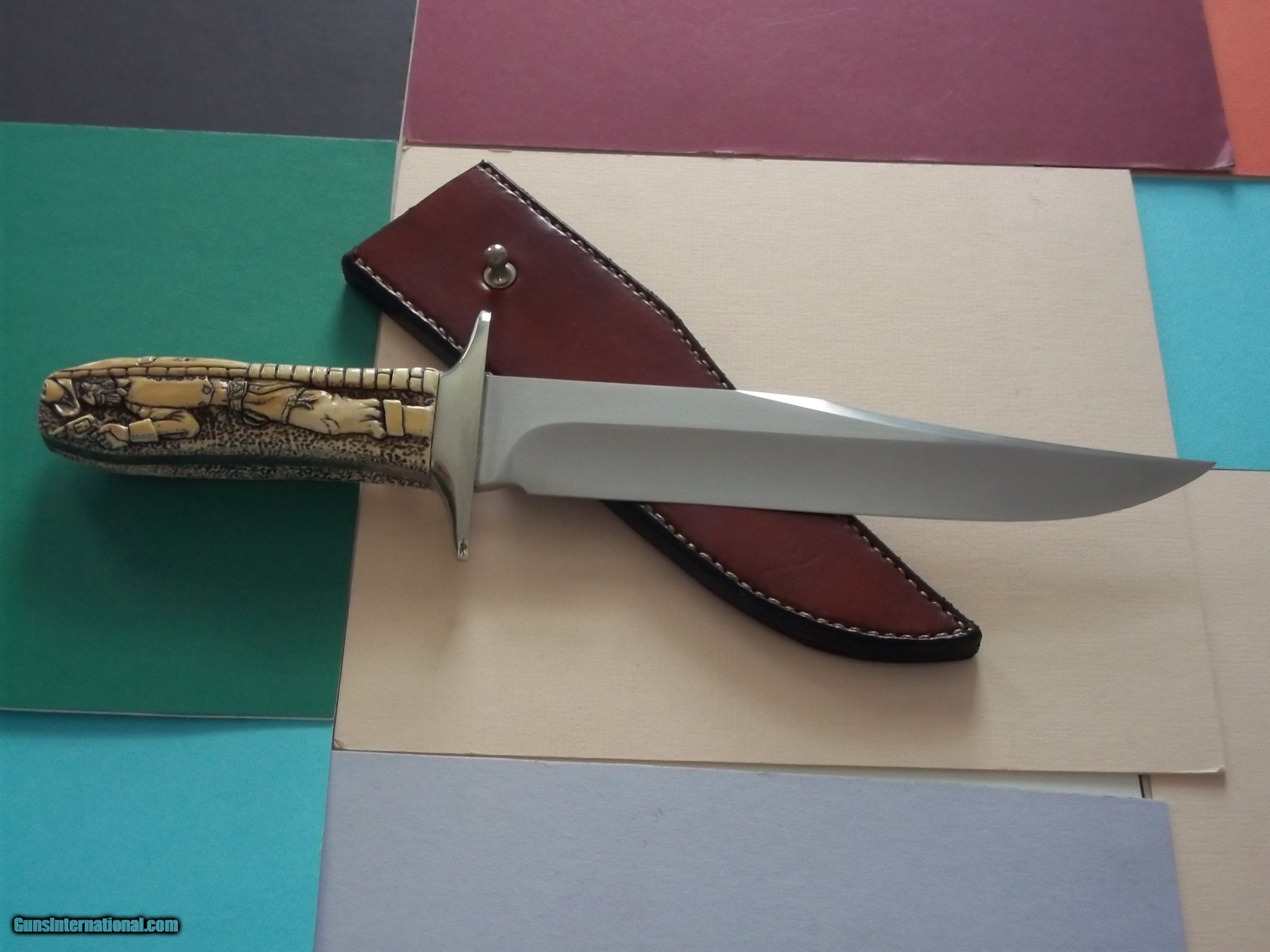 Jim Siska One-of-a-kind Carved Bowie Knife "Gunfighter & The Saloon Girl" Woolly Mammoth Scales Ivory Handle