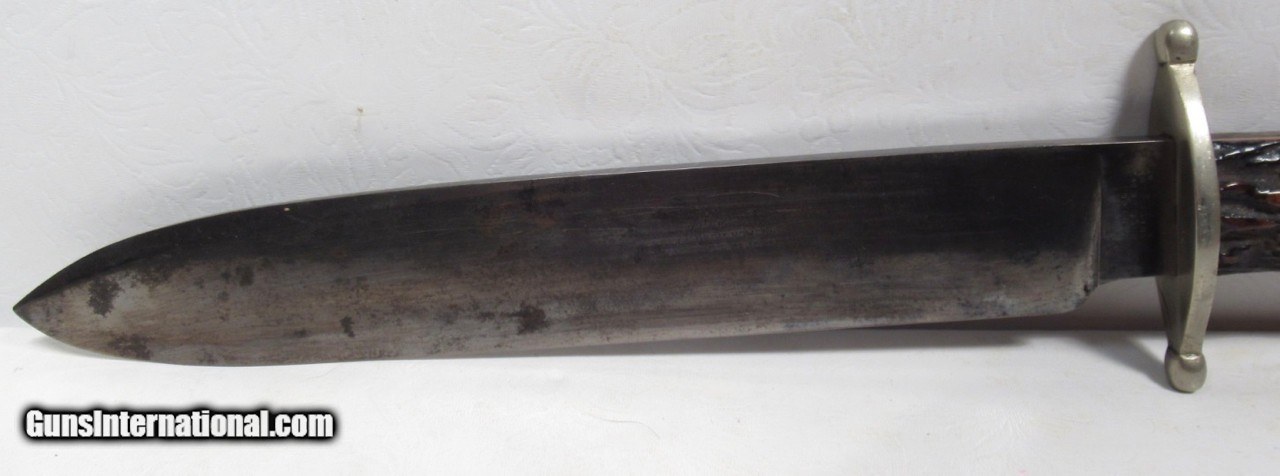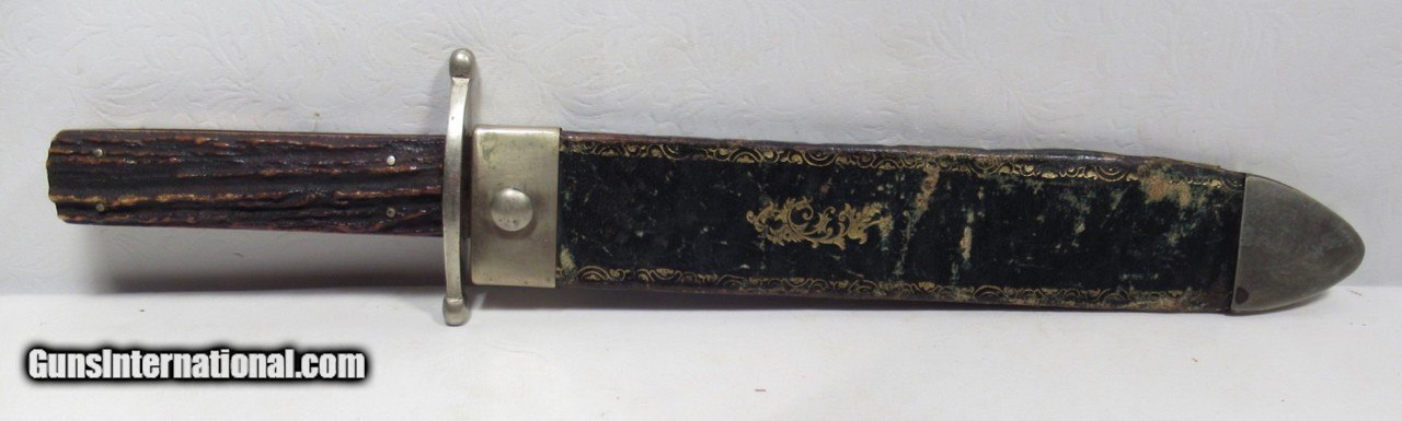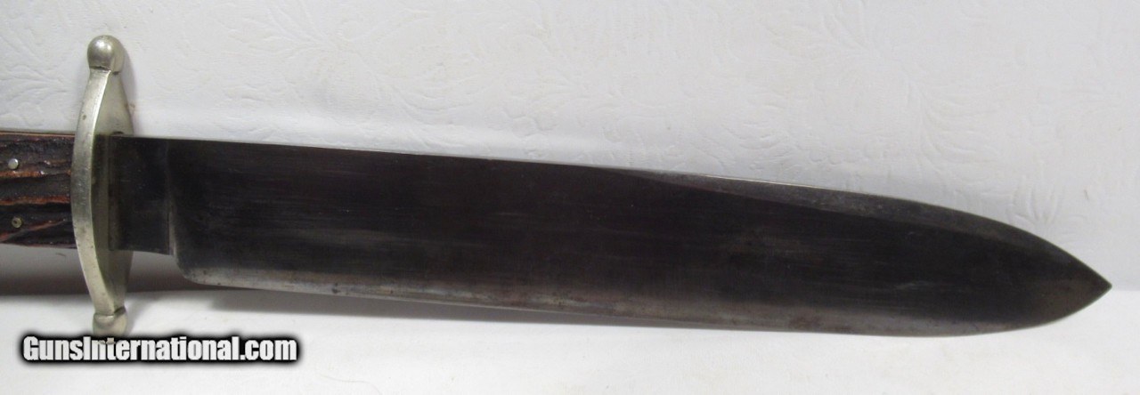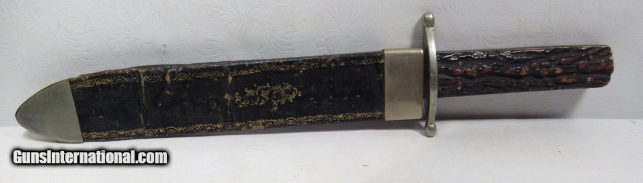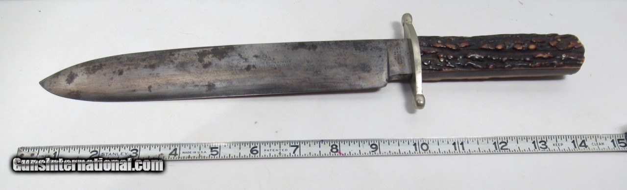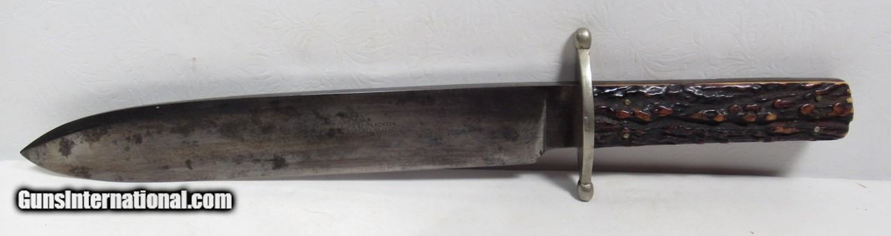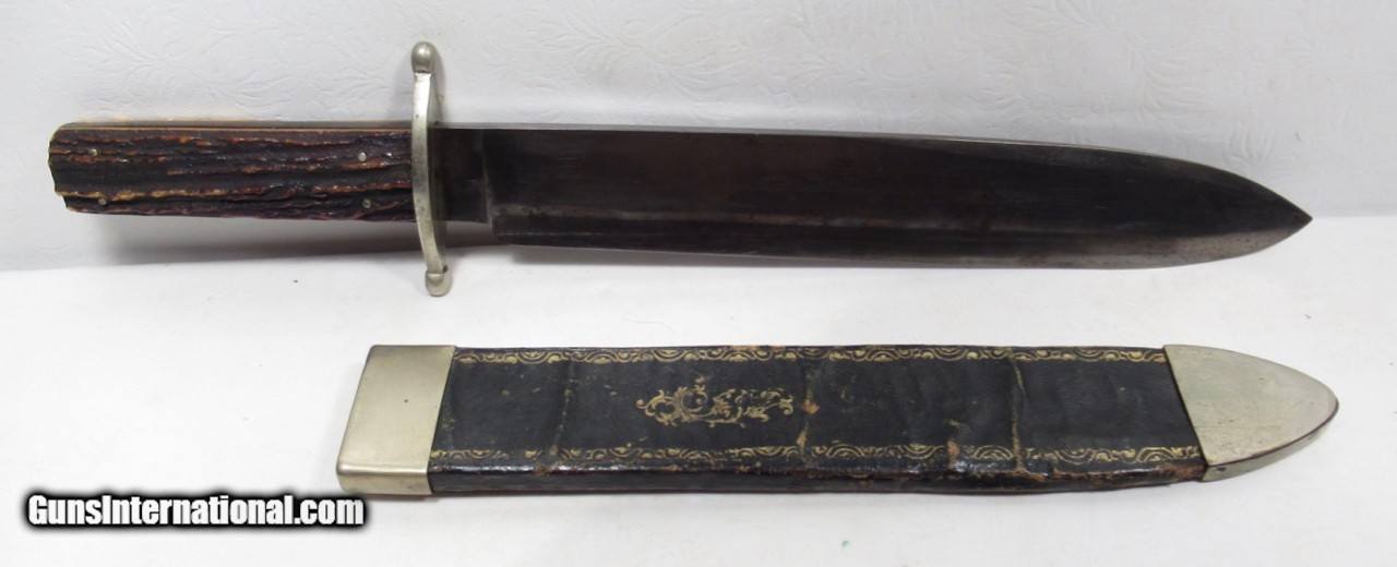 Description: Early Harrison Bros. & Howson Bowie Knife; 10” Heavy Spear-Point Blade; ¼” Thick; Marked with Maker’s Name and Stamped “Cutlers to Her Majesty”; 14 ½” L.O.A.; Nice Original Sheath with German Silver Mounts; Circa 1850’s; From the Dr. H.H. Miller Collection; See All Photos for Condition; No Texts; Call (254)541-5765 or Email Only; PERSONAL PROPERTY of Harold Wieser; Price: $4,475 + $45 S&H Via USPS PRIORITY MAIL; Payment Address: Harold Wieser - 1466 U.S. Hwy 77 - Rosebud, TX 76570; SEND PAYMENTS VIA USPS PRIORITY MAIL; SOLD |
