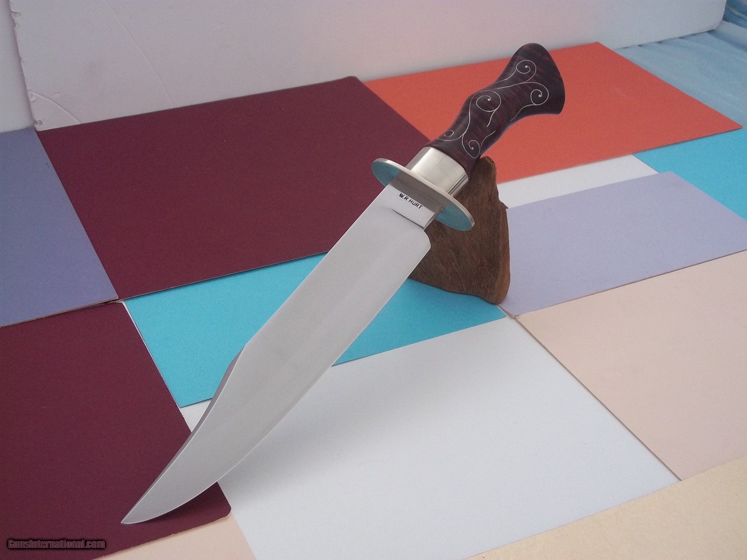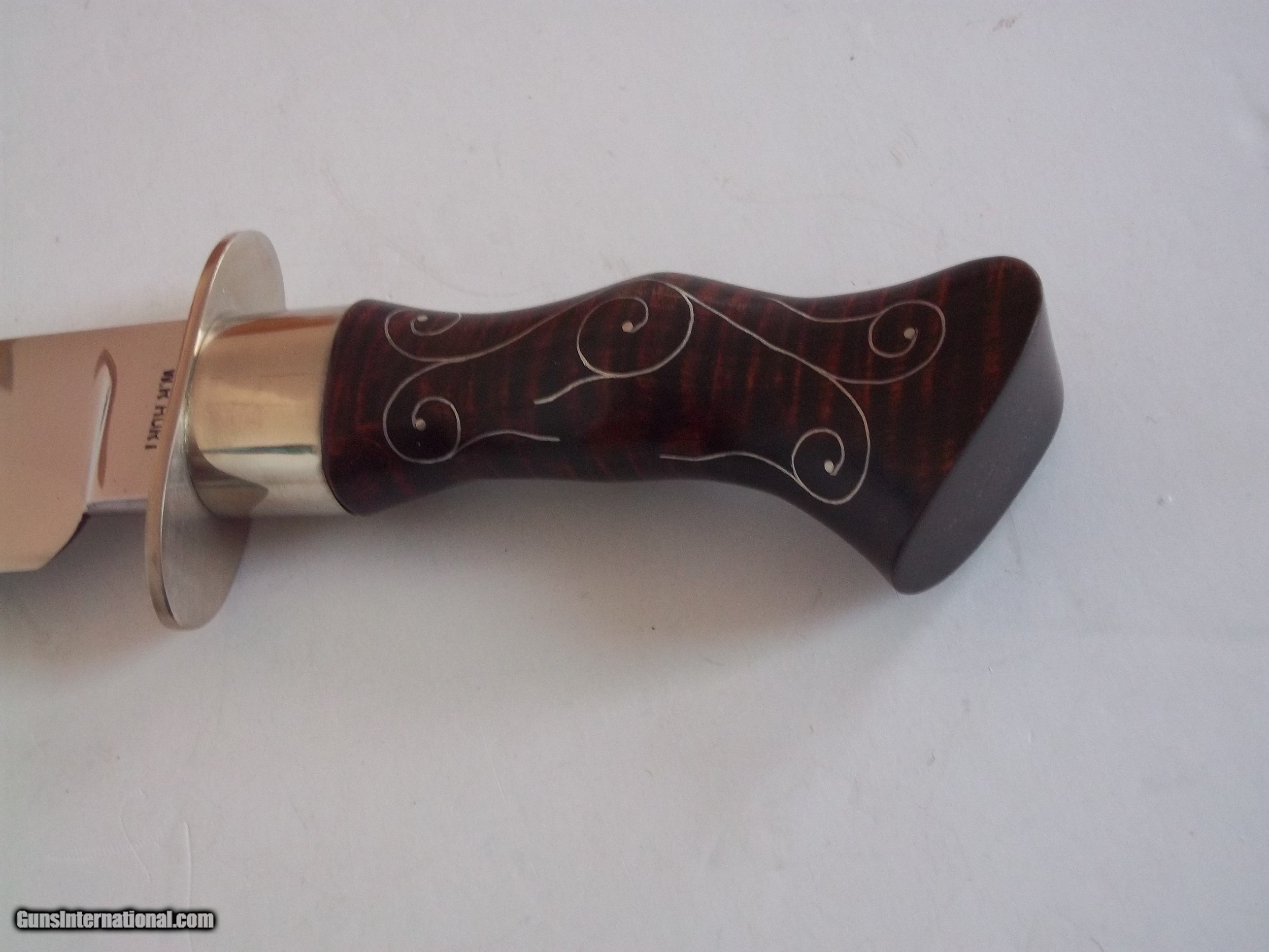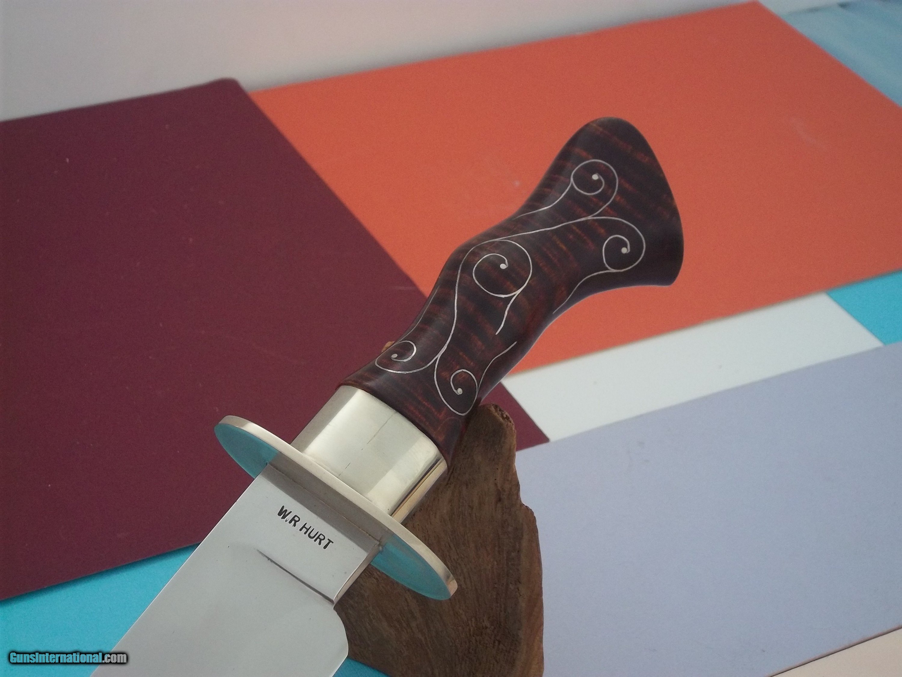 Description: William R. "Bill" Hurt Bowie f 5160 tool steel 10-1/4-inch blade by 1-1/2" to 1-3/4" width, culrly maple handle with siver wire inlays, double nickel silver guard, large nickel silver band, wood-lined brown leather scabbard covered with Kudu skin, elaborate leather tip and throat. Made in November 1998. Bill Hurt only made 251 knives in his bladesmithig career,a nd htis is knife # 168. All listed Bill's knives come with original invoice/receipt and provenance letter. Free shipping with tracking # and signature required. NOTE: I do not engage in any type of trade. Thank you. Sold "AS IS" and as a final sale. SOLD |