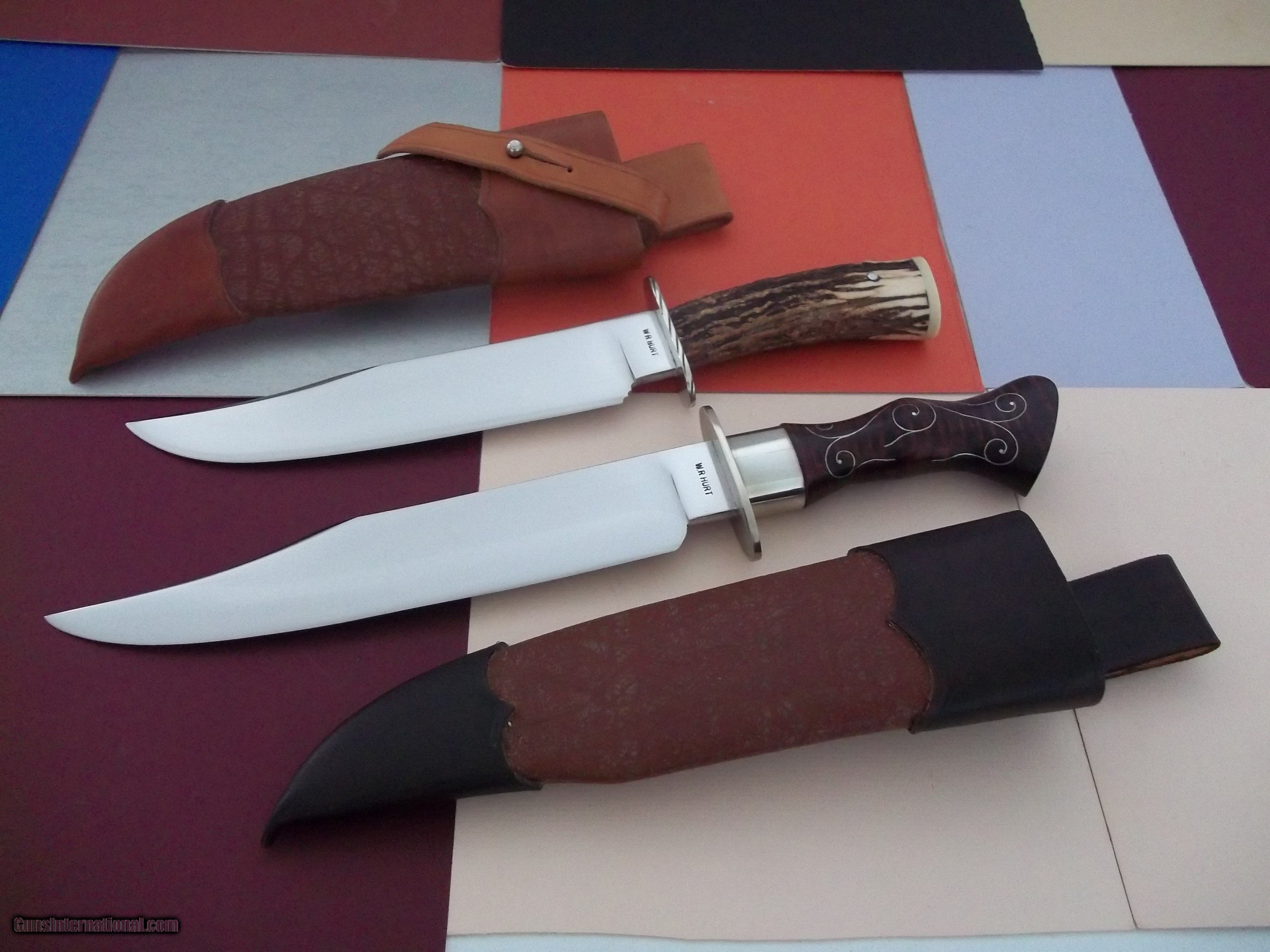 Description: Willima R. "Bill " Hurt Combat Bowie Fighter from 5160 tool steel stock, India Sambar stag handle, Germans ilver double guard with fancy file work, ivory plate butt cap with Germans ilver pins, brown leather wood -lined cabbard covered with fine African Kudu skin, adorned with a special fine leather throat and tip, this knife was cpmpleted in March 1999 and it is knife # 172 out of 251. Free shipping USPS with tracking # and signature required. Provenance letter, this is only of the five knives that was presented to the ABS Board in order to get his Master Smith ranking. Ooe of the five finest knives ever produced by Bill Hurt. NOTE: PIcture # 1 denotes that particular knife seen at the top, Picture # 5 denotes the five scabbards that were made for the 5 knivesd to be presented to the ABS Board of Directors in order to present the Bill HUrt's knives to get his Master Smith ranking-they areb the most elaborate sheaths Bill did. SOLD |