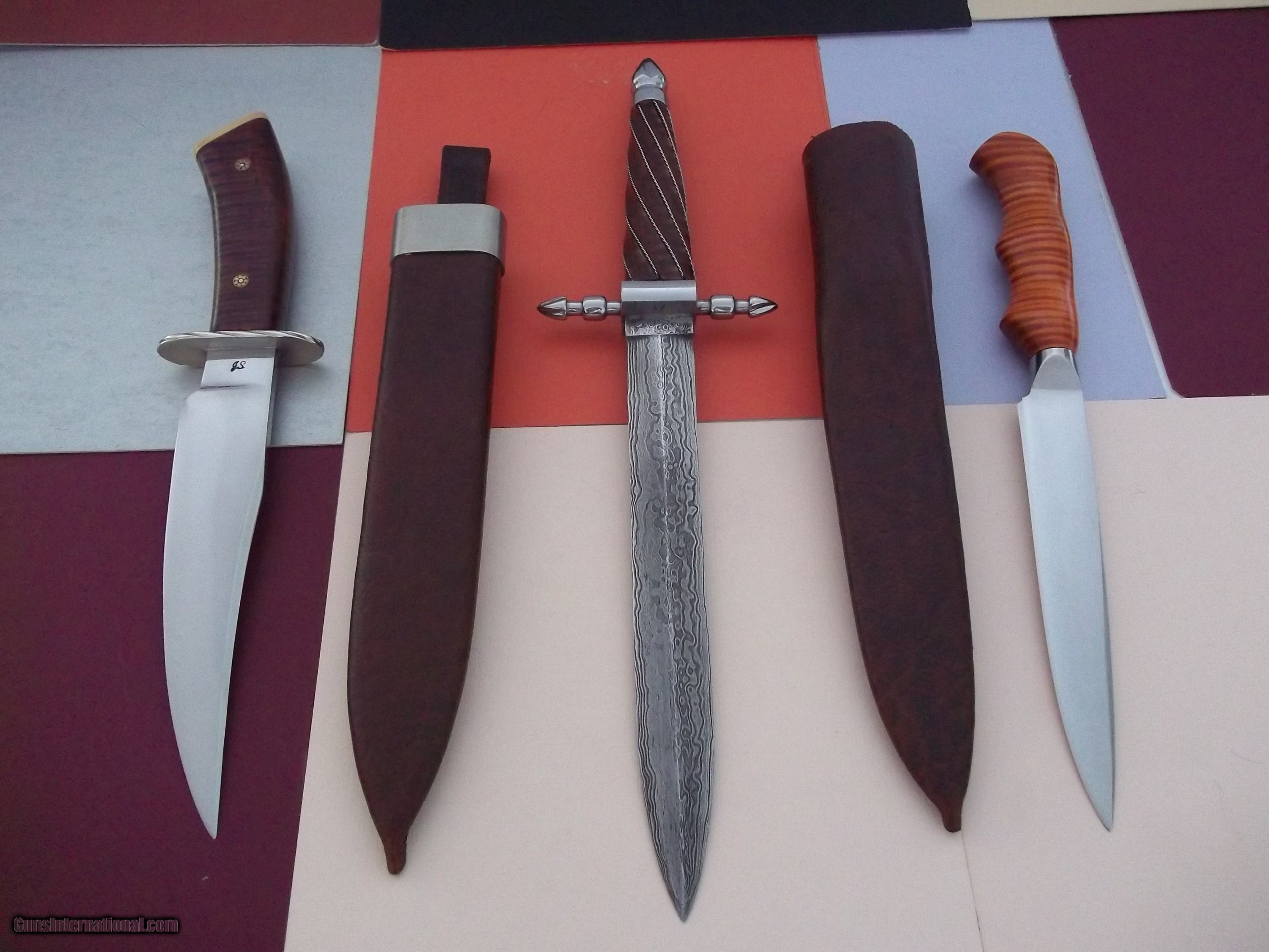 Description: William R. "Bill " Hurt masterpiece Damascus Quillon Dagger with an 9-1/2" balde, iron guard with two spikes at each end and rounded spiral Gothic nut. Selected curly maple twisted handle with silver wire inlays, wood-lined basswood scabbard covered with African Kudu skin. Made in January 1997 this is knife # 121 out of 251 as Hurt only made such number of knives in his career. This is is the knife that was presented tp the Board at the ABS in order to obtain his Master Smith ranking, and such knife is part of the fives that were presented. Free shipping USPS with tracking # and signature required. Provenance letter included along with original invouice/receipt as thsi applies to all the listed Bill Hurt knives. NOTE: Photos # 5 denotes the most elabrate scabbards Bill wever produced as these were for the 5 knives he submitted to the ABS Board of Directors in ordermto get his Master Smith ranking-Photo # 6 shows that particular model in the center of the photograph. SOLD |