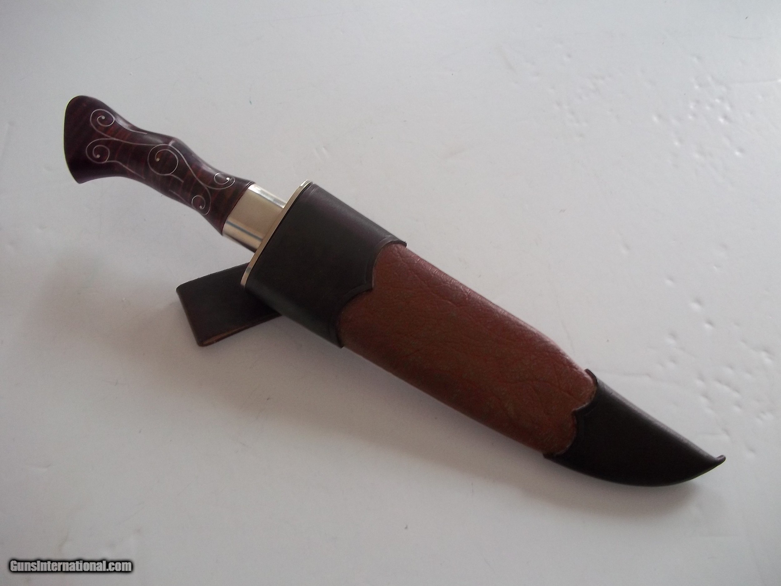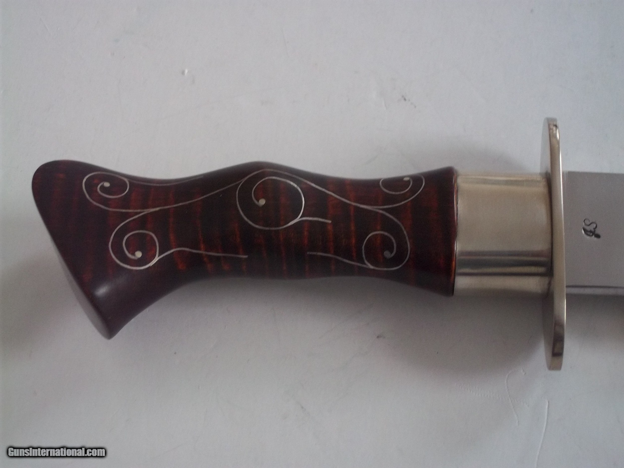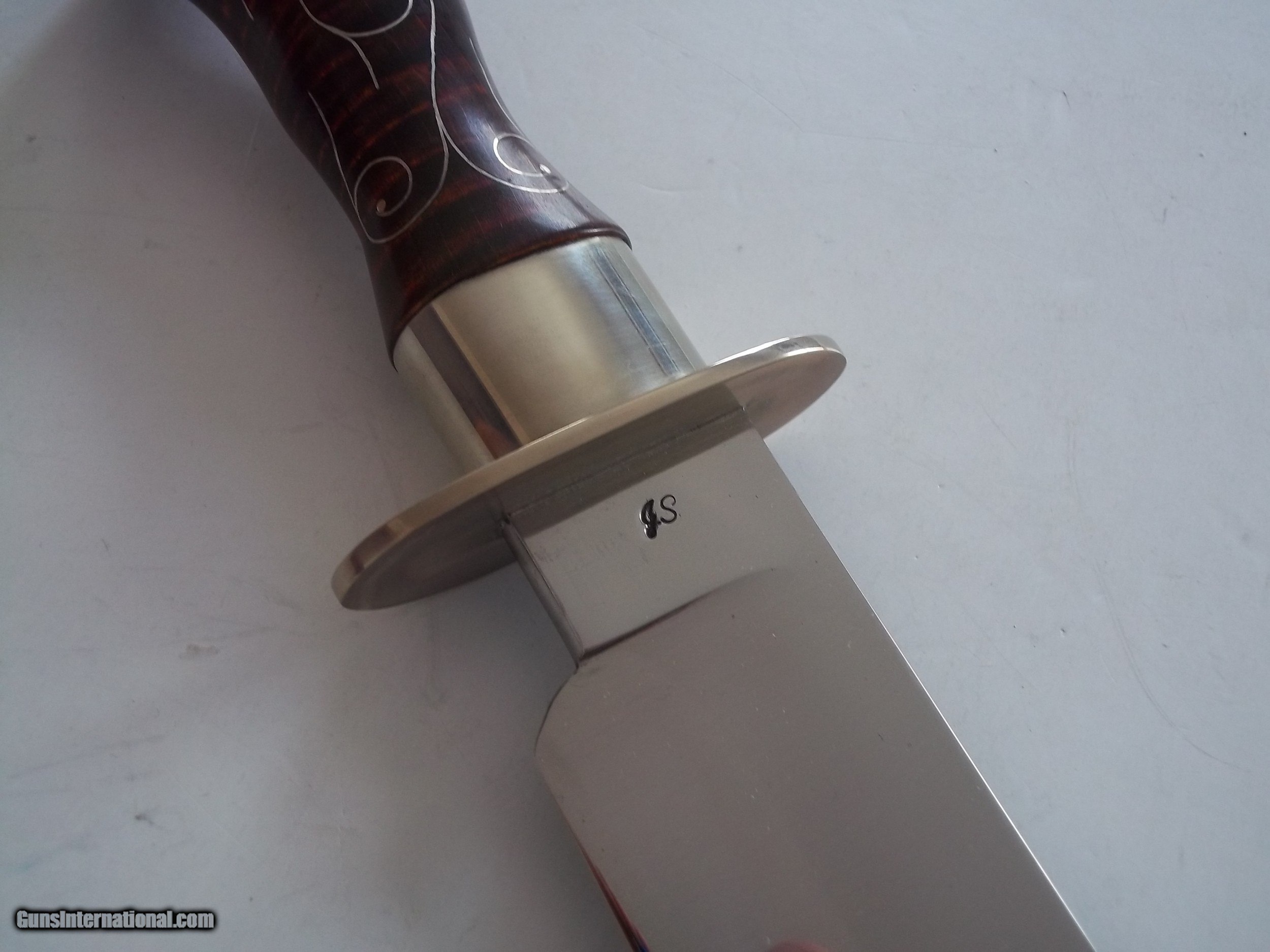 Description: Bill Hurt stunning Bowie knife from 5160 tool steel 10-1/4-inch blade by 1-1/2" to 1-3/4" width, spectacular culrly maple handle with siver wire inlays, double nickel silver guard with a large nickel silver band, brown leather scabbard covered with Kudu skin. Made in November 1998. Bill Hurt only made 251 knives in his bladesmithig career. Free shipping Priority Mail with tracking #. NOTE: I do not engage in any type of trade, therefore this applies to any knife I have listed. Thank you. SOLD |