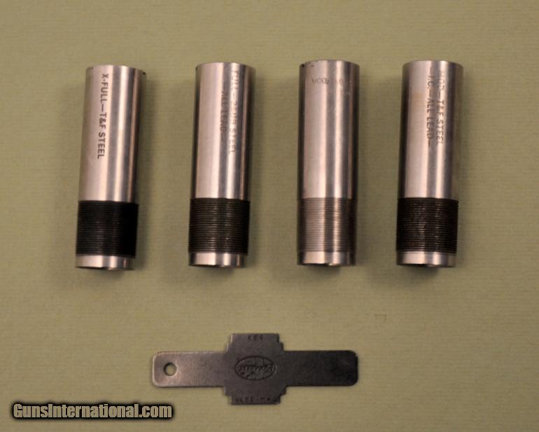 Description: Set of 4 stainless steel choke tubes Mossberg 835, 12 ga 3-1/2" shotgun. Includes: X-Full - T&F, Full - 2&BB steel - all lead, MOD, Imp Cyl and wrench. VG used condition. Singles avialable. PM $5.15 SOLD |