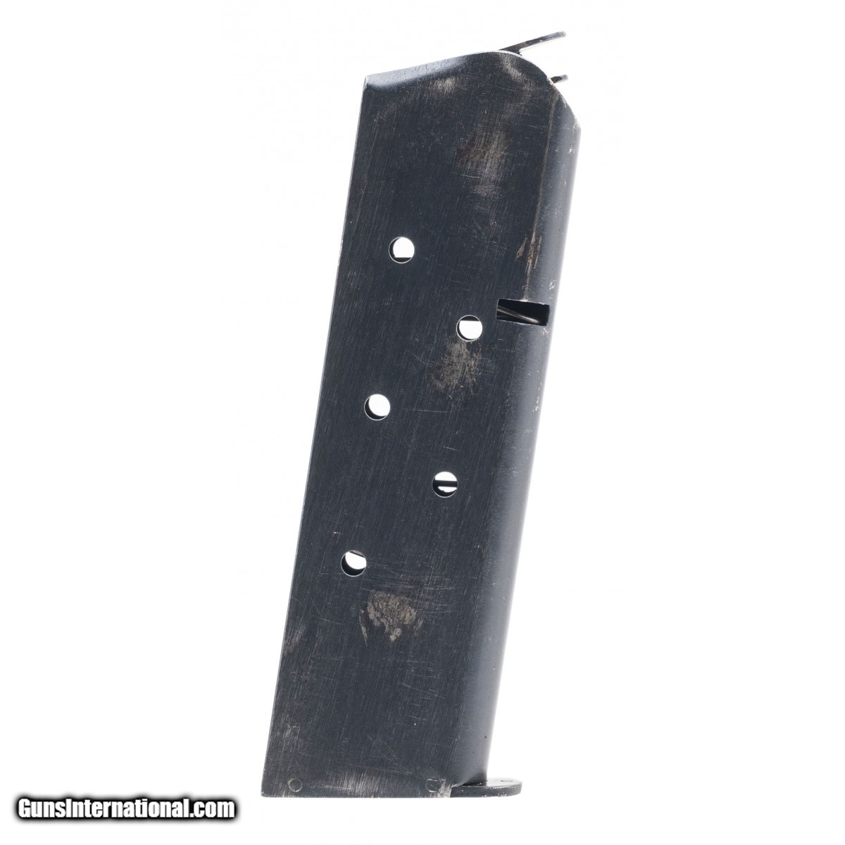 WWII USGI M1911A1 7-round magazine made by Scovill Manufacturing Company with flush pin staking on the baseplate & an ""S"" on the top of the lip. Used by COLT, Remington, Ithaca, & US&S. Overall excellent condition.