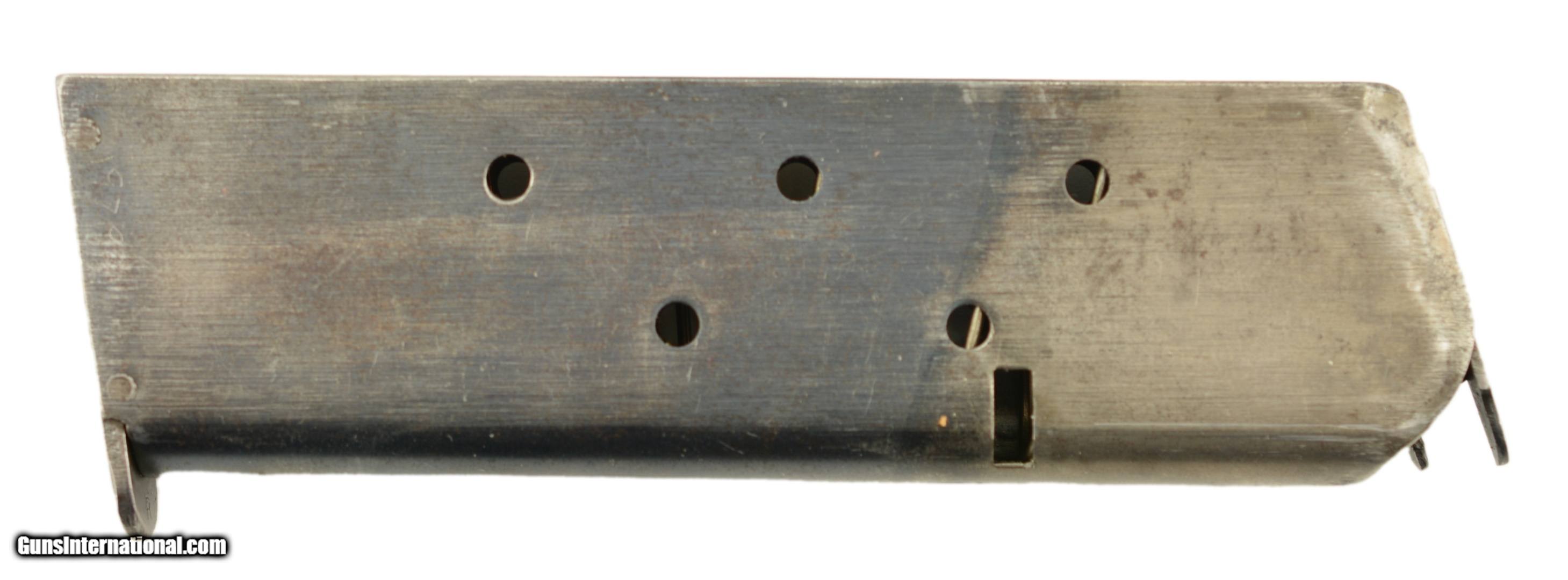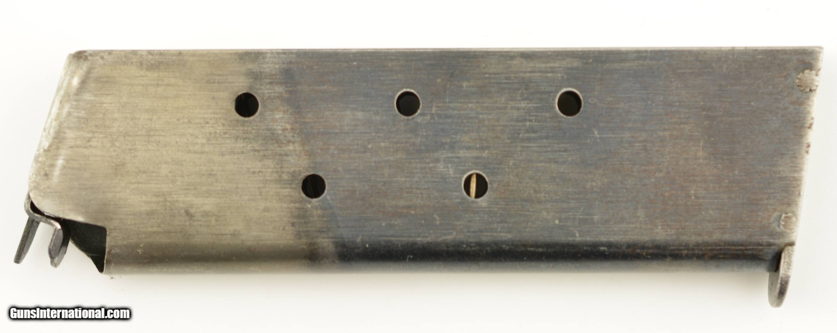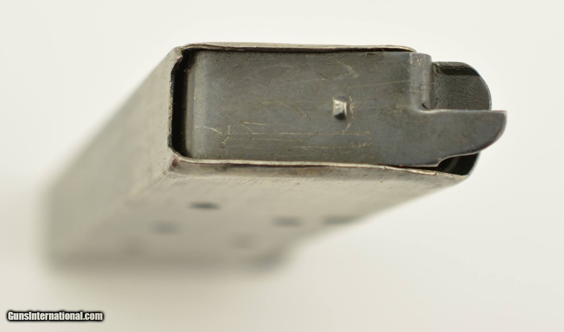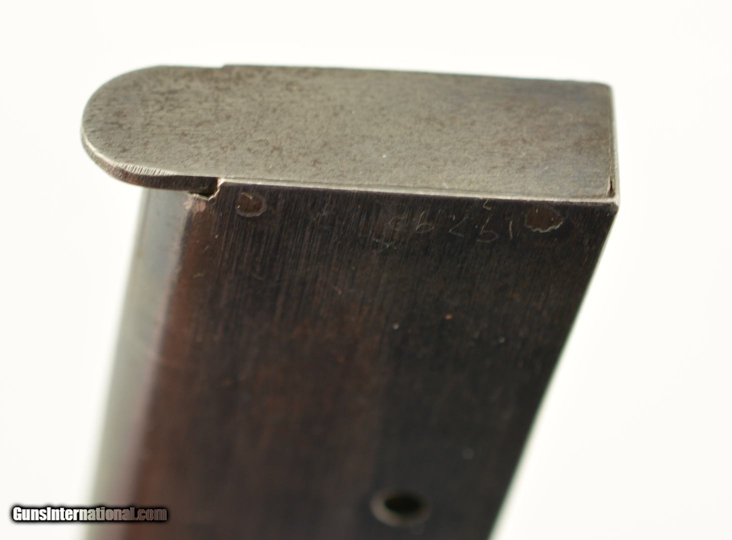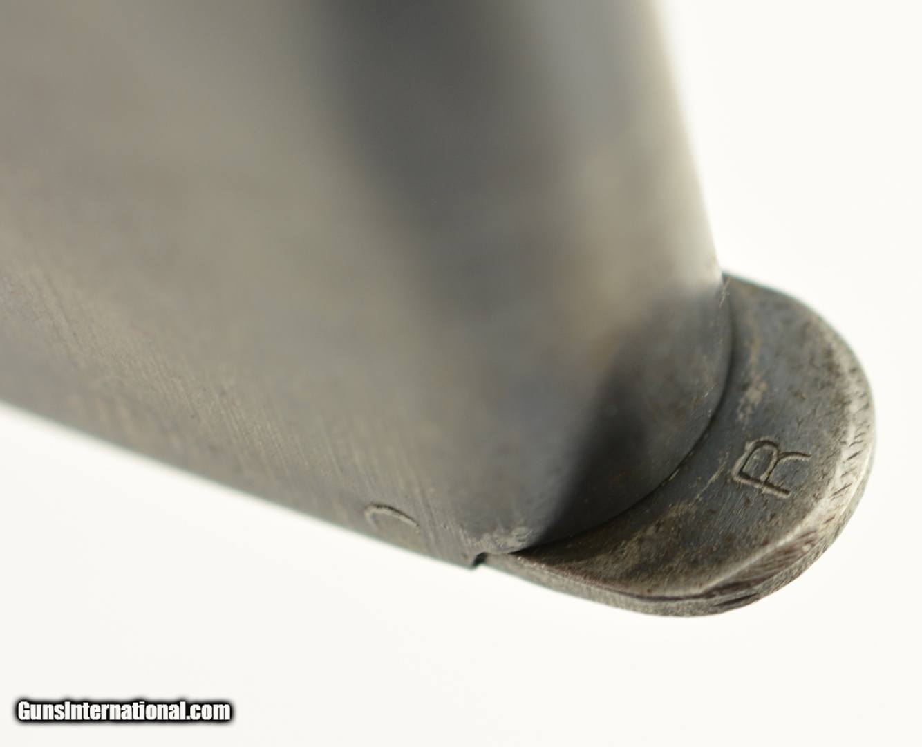 Description: This is a nice early two tone Colt 1911 .45 magazine. The magazines is a two-tone early, no lanyard loop, pinned magazine in excellent condition with very light surface oxidation, nice bluing and firm spring. There is R "Risdon Tool & Machine Co., Naugatuck, Conn." stamped on the top of the pinned floor plate toe. Also has 19792 inscribed on the right side bottom, might be a unit or serial number. SOLD |