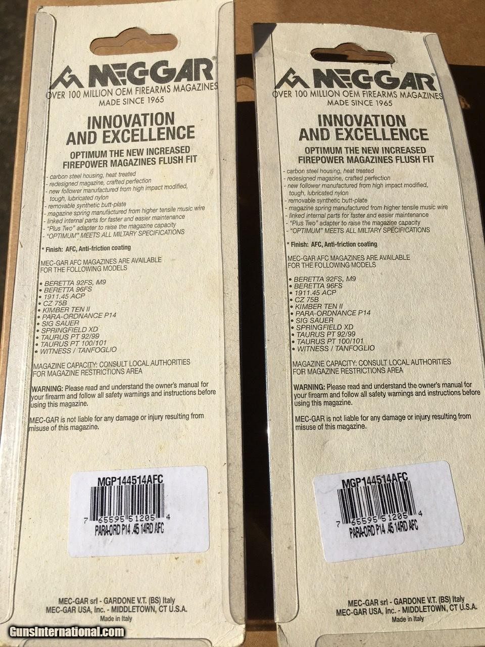 Description: This listing contains two new Mecgar magazines for the Para Ordnace P-14 double stack 1911. These are new in the pack and both are included in the sale. Shipping cost of 10.00 via priority mail. Money orders and checks accepted. No shipping to any location that prohibits high capacity magazines. SOLD Handgun Caliber: .45 ACP (.45 Auto) |